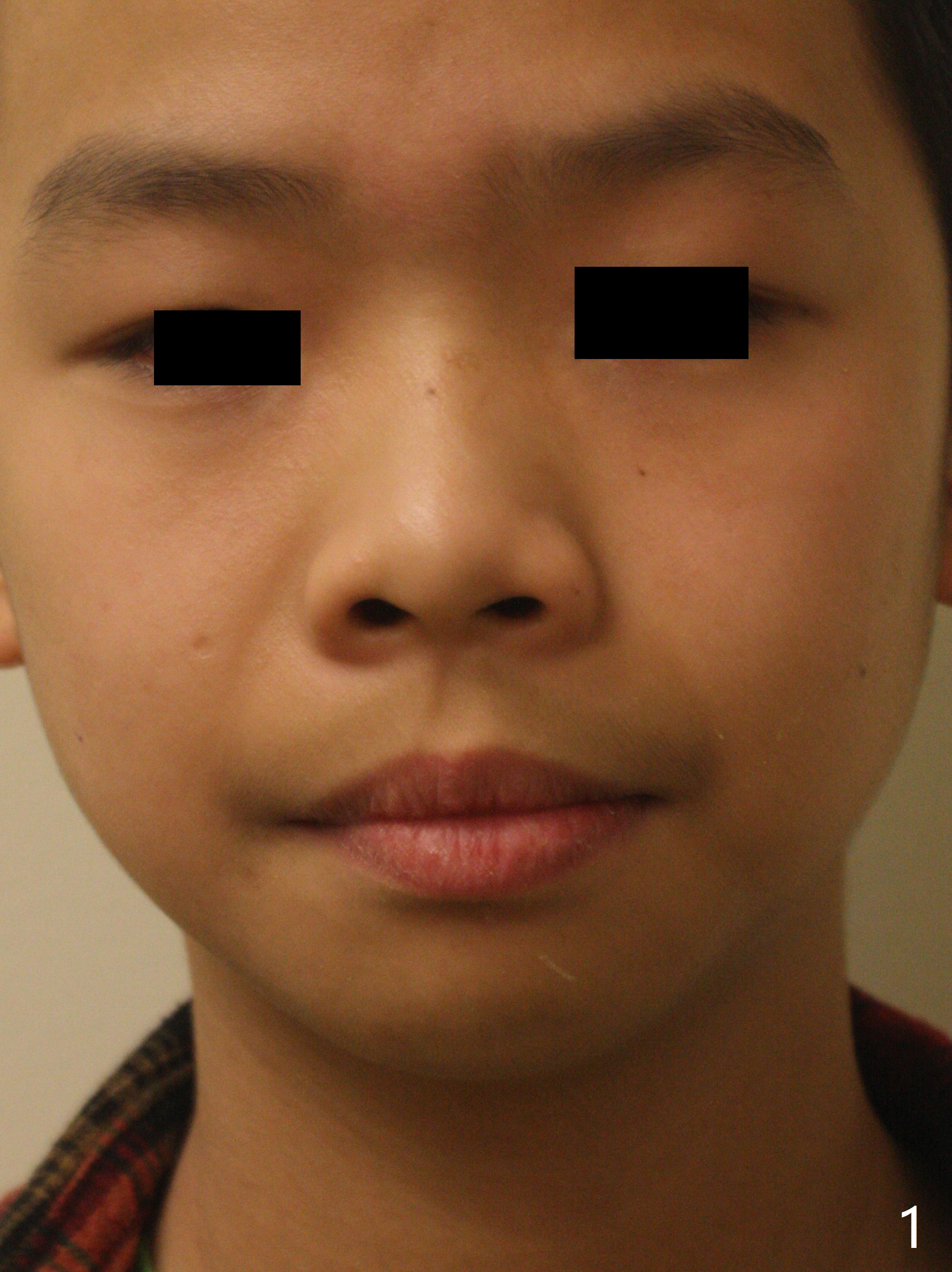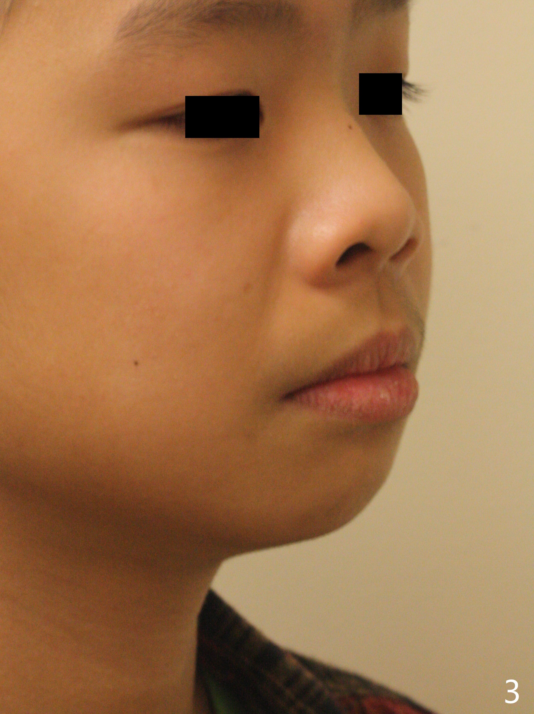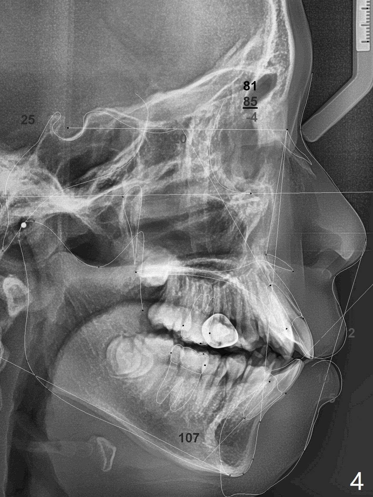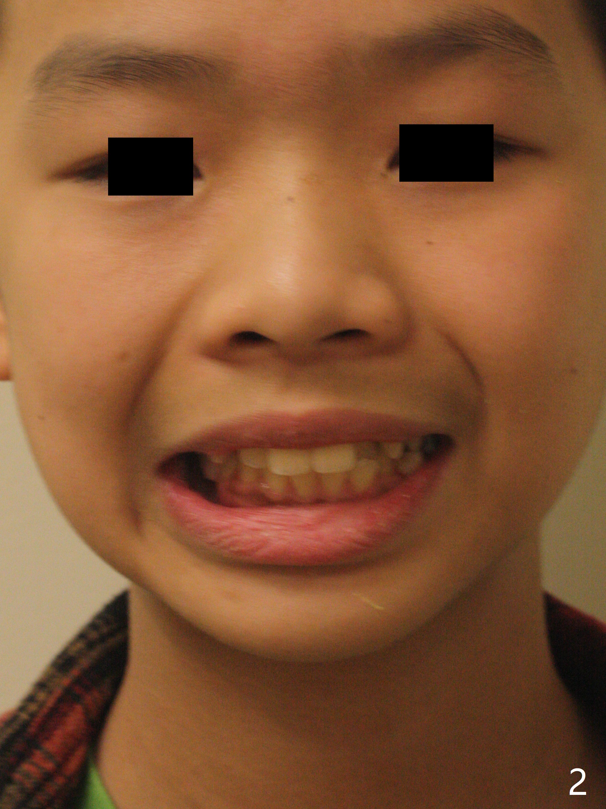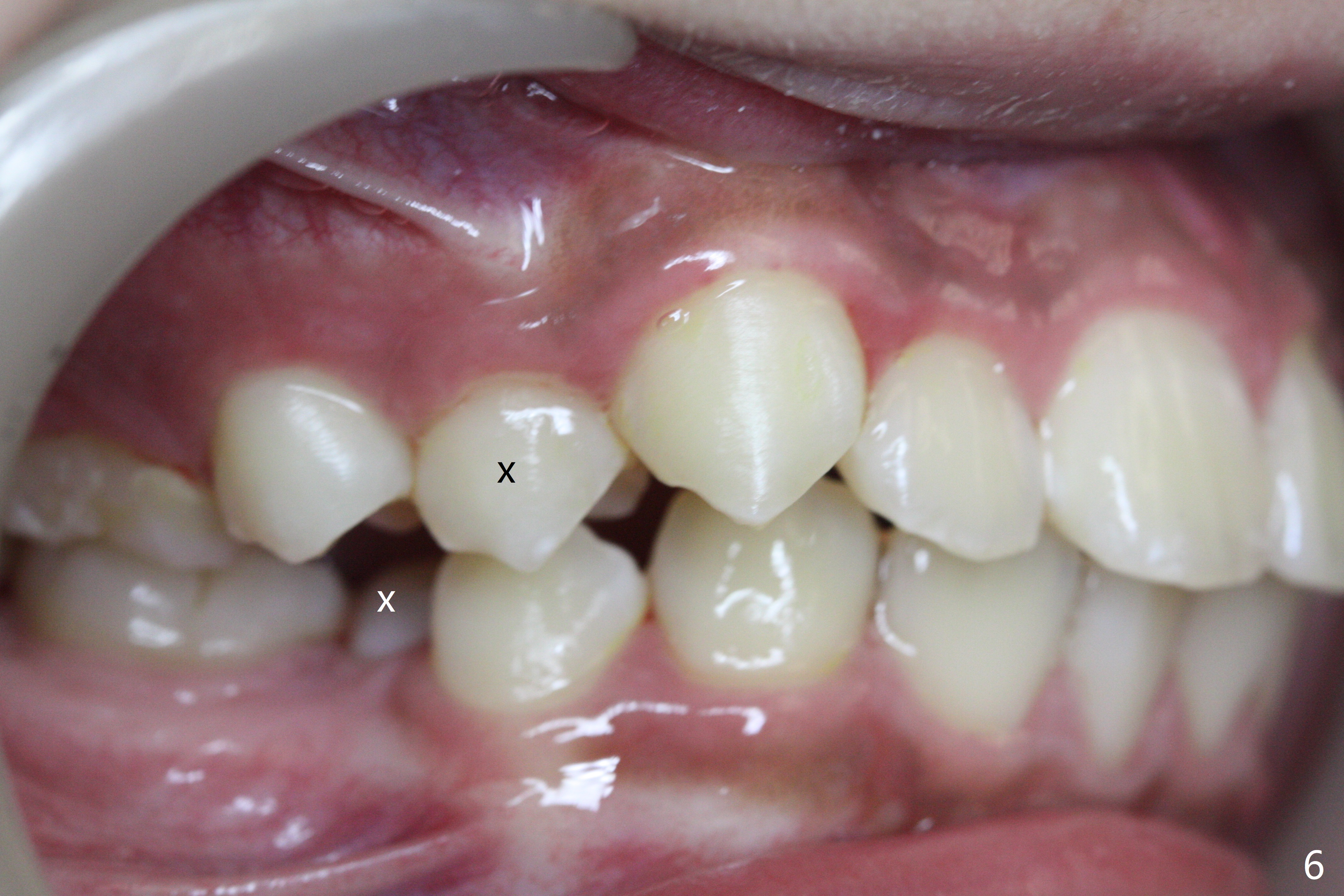 A 13-year-old man has protrusive lips (Fig.1,3,4) with upper midline deviation to the left (Fig.2). Crowding is severe with LR5 severe lingual inclination (Fig.5,6,10). To facilitate L6s' uprighting (Fig.10), LR5 and 3 of the 1st bicuspids will be extracted (Fig.6-8 x or *) and molar bands with lingual cleats will be used for the lower. Cross arch molar retraction will be initiated immediately. Open coil spring will be placed between UL1 and 3 with the 1st wires to correct the upper midline deviation and to gain the space for UL2.