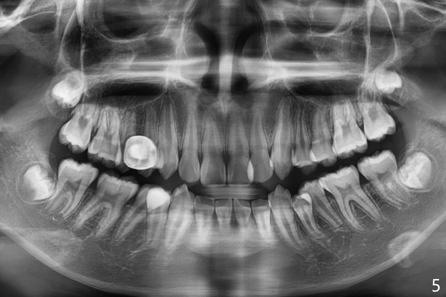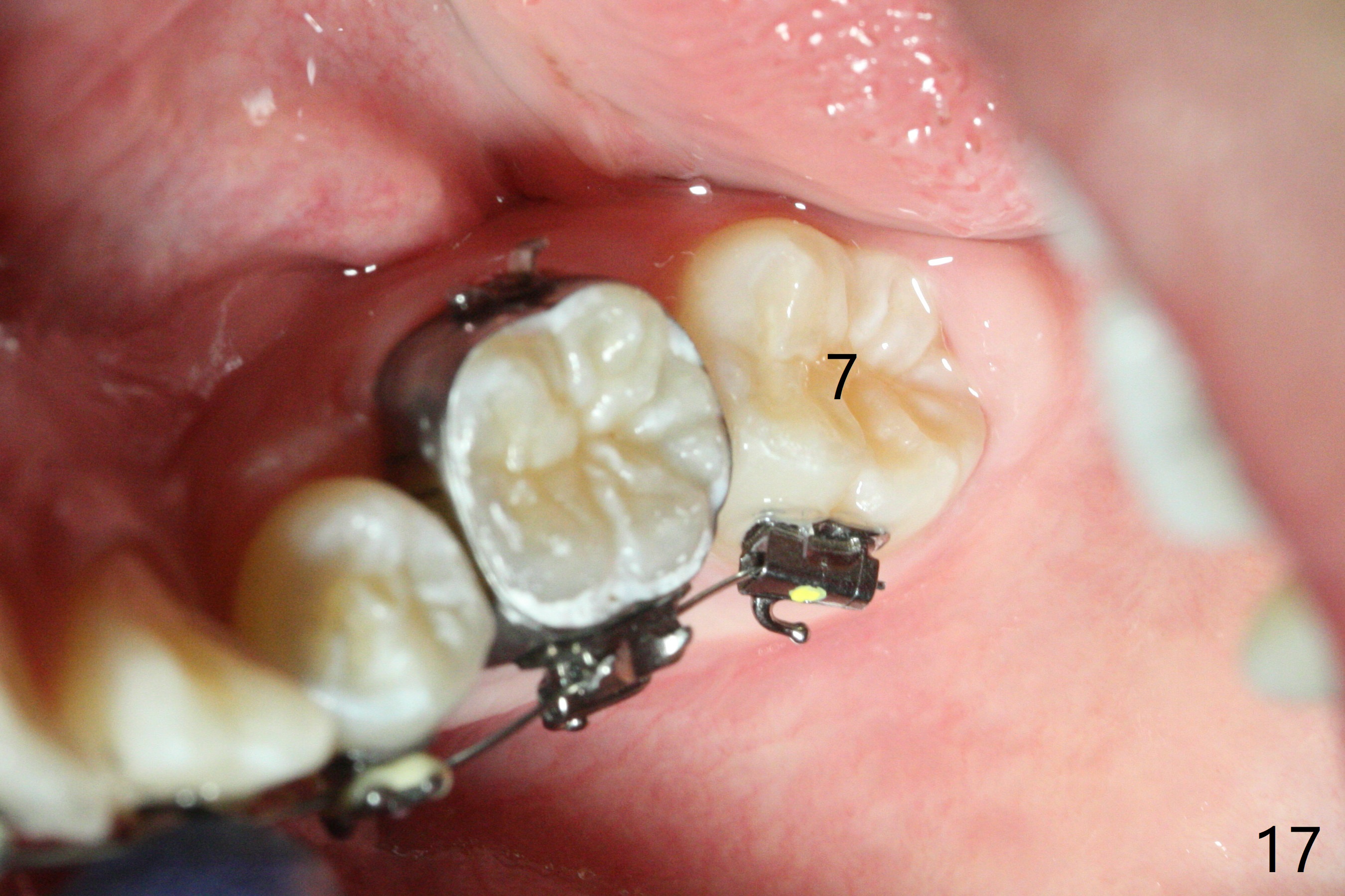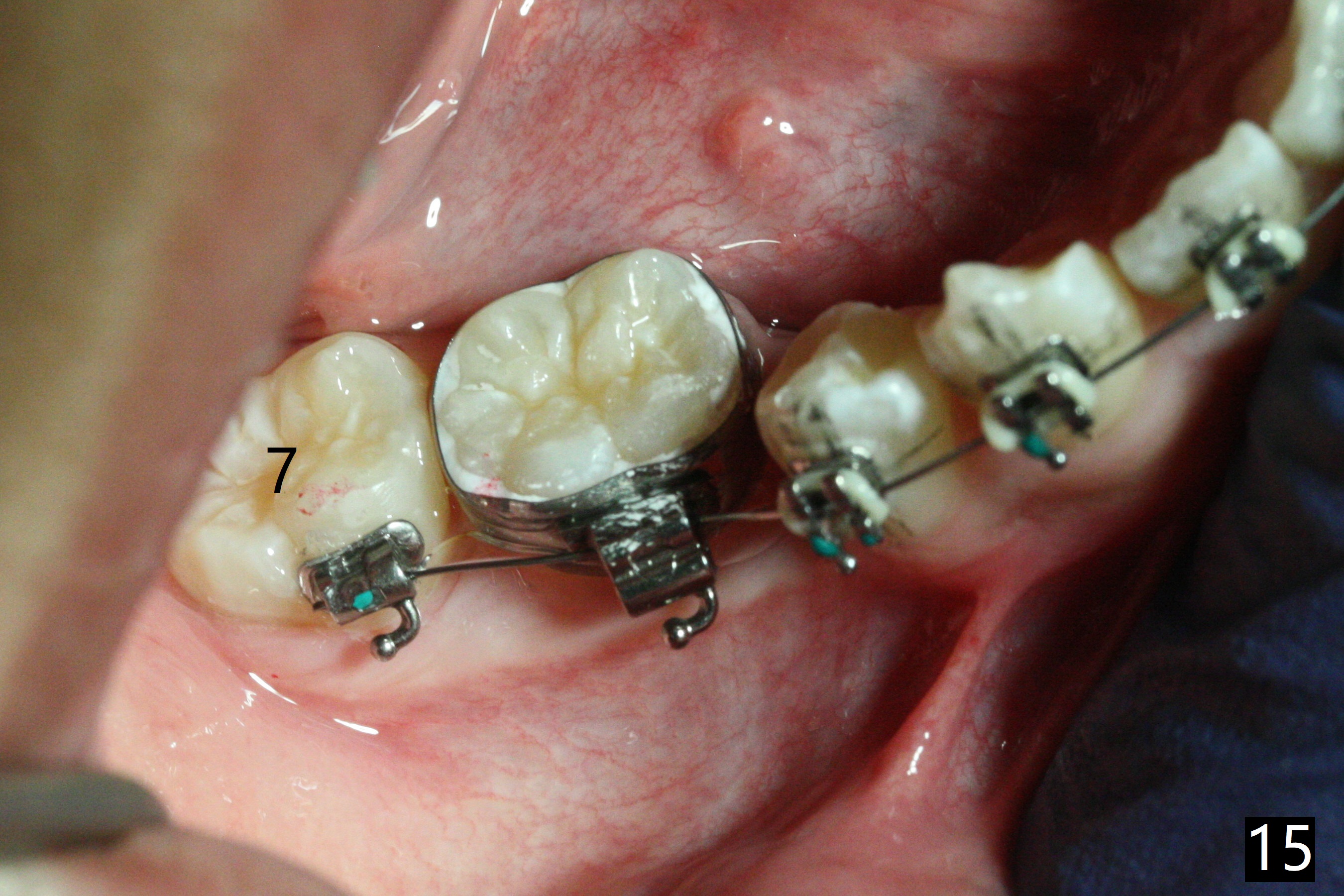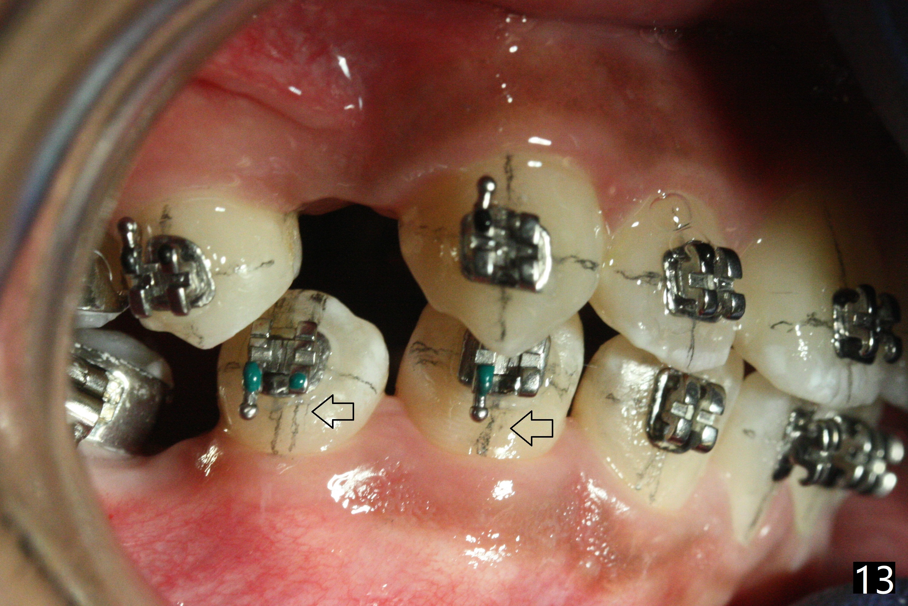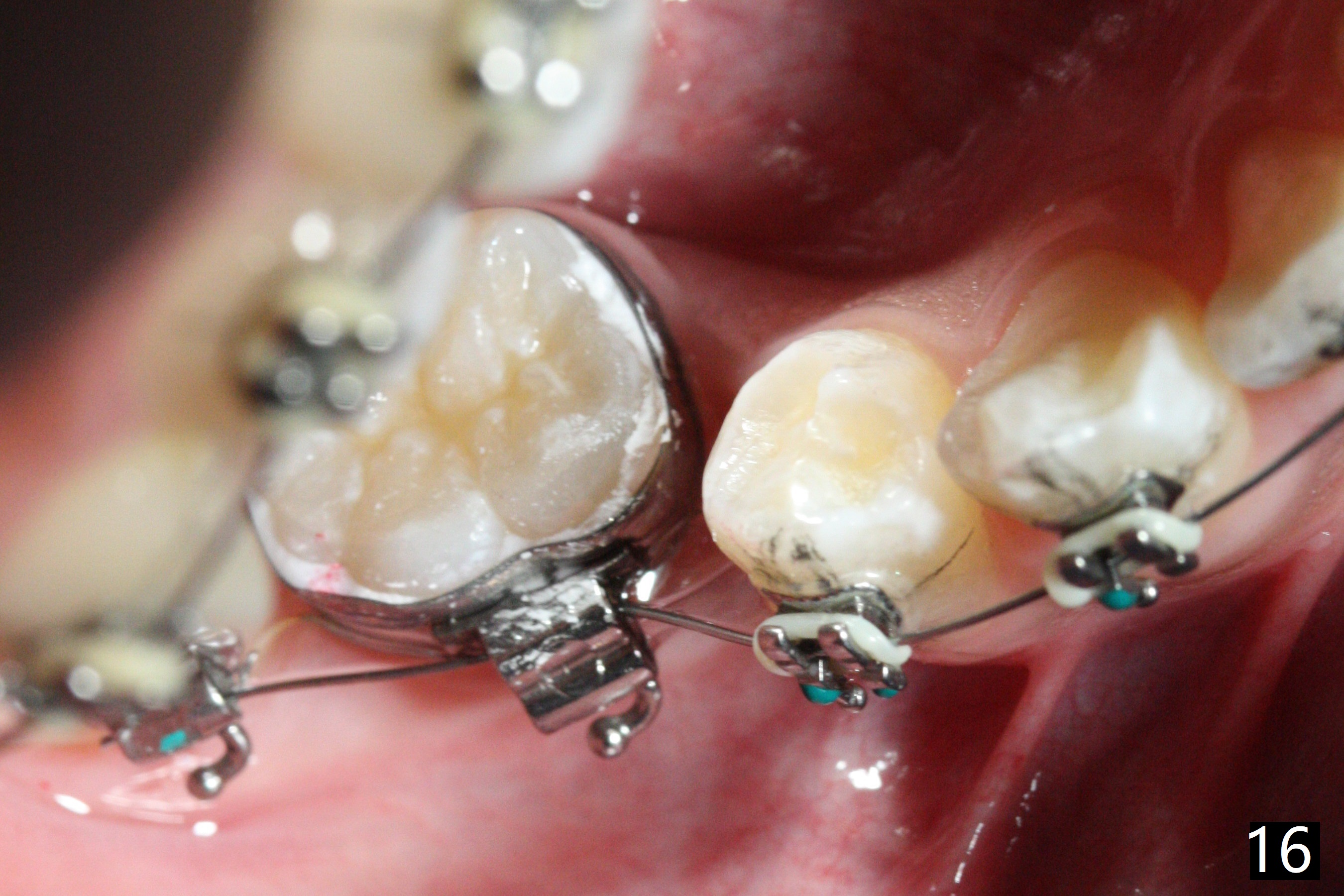 In fact, automatic shifting is striking. For example, UR5 lingualization (Fig.12 arrow) makes it easy to insert 12 niti wire. Distalization of the lower bicuspids and canine is more obvious (Fig.13,14 arrows) than the upper counterparts. Because of incomplete eruption, it is difficult to band L7s; instead brackets are placed (Fig.15-17). The purpose of LR one is to facilitate LR6 buccalization (Fig.15,16), whereas LL one to correct rotation of itself (Fig.17).