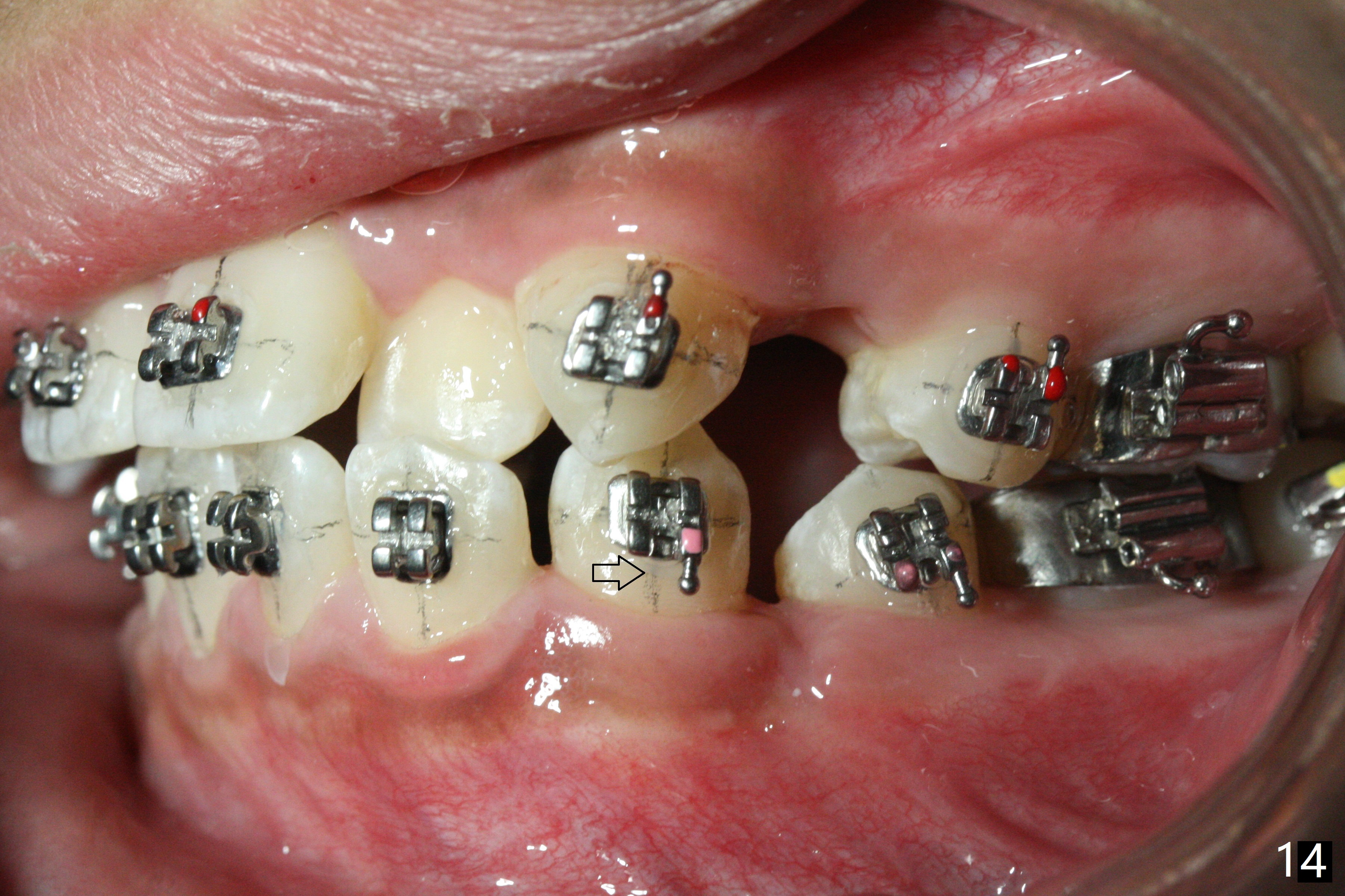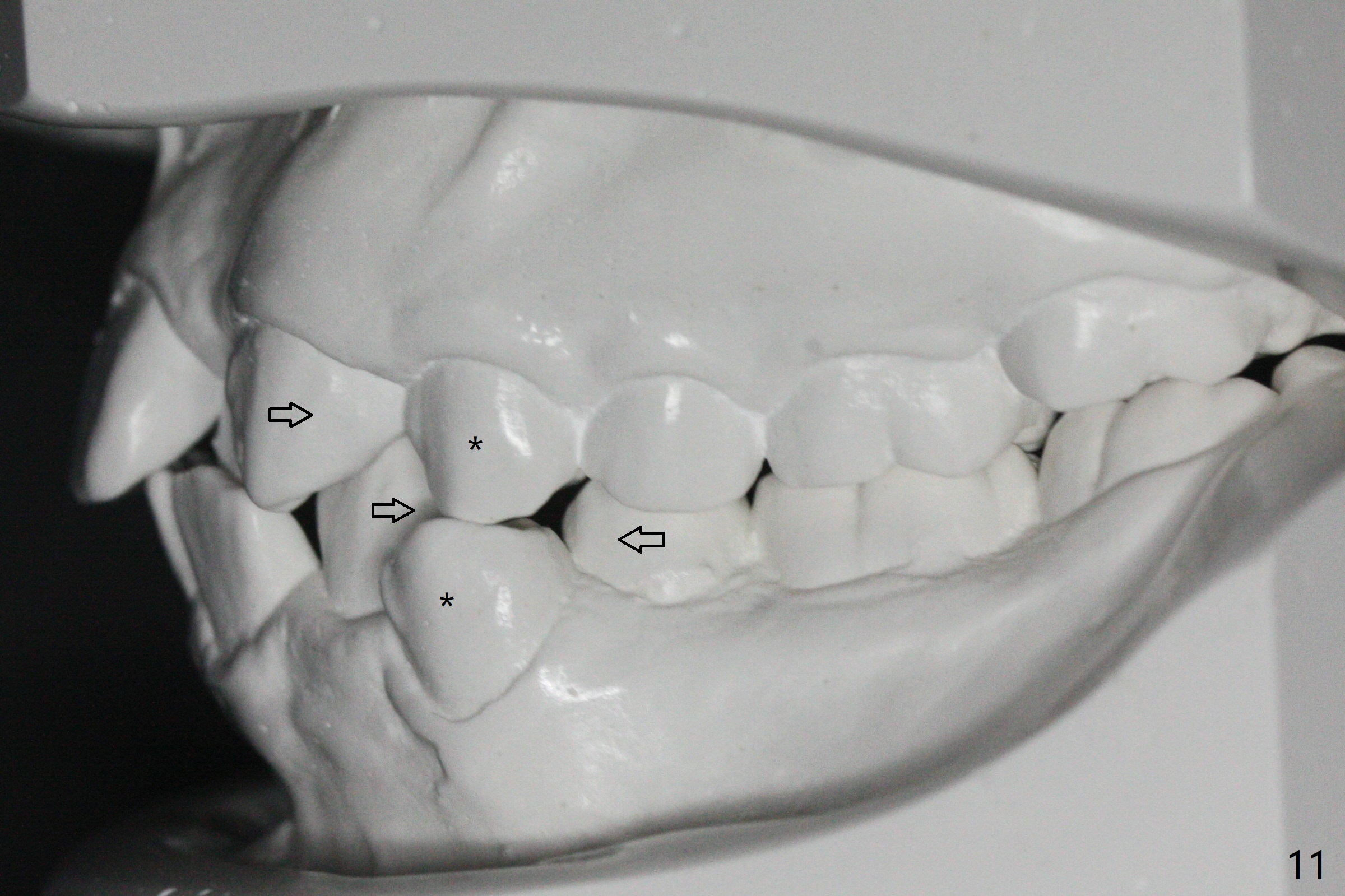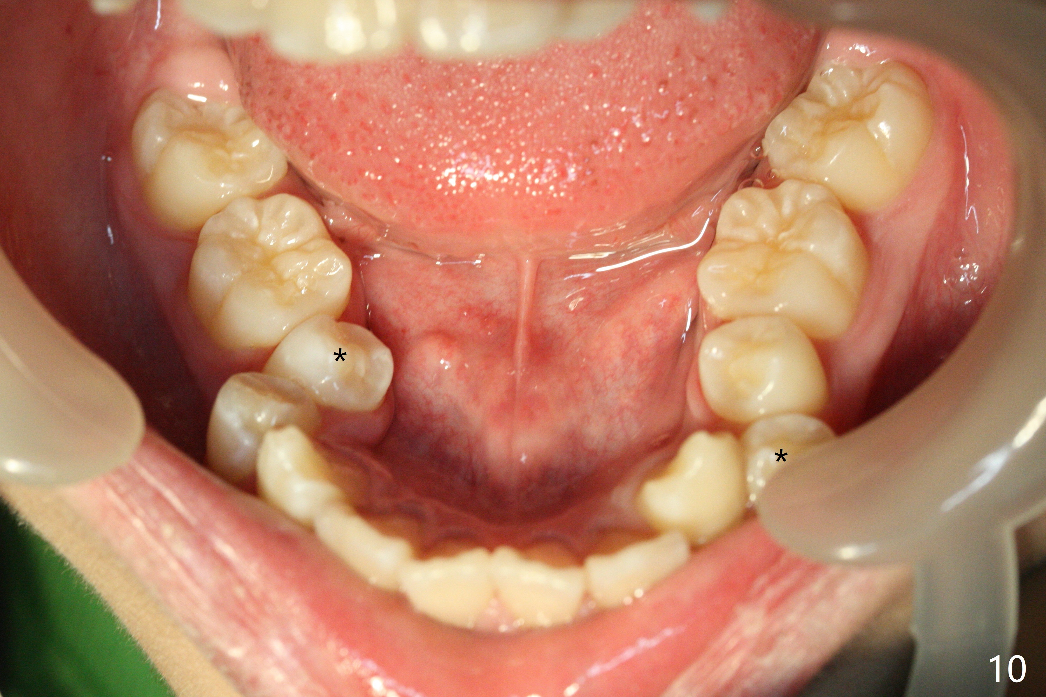 The patient will return 2 months post extraction. Shifting is expected to occur next to extraction sites (*) as indicated by arrows in Fig.9,11. Take photos if it is the case. Place bracket at UL2 if there is no space issue, but upside down (why?). The most flexible wire is anticipated. To establish Class I occlusion when wires are stiffer (18ss), LL5,6 will be mesialized as equally as LL3 distalized, while UL5,6 maintained basically in situ (Fig.11). How to accomplish?