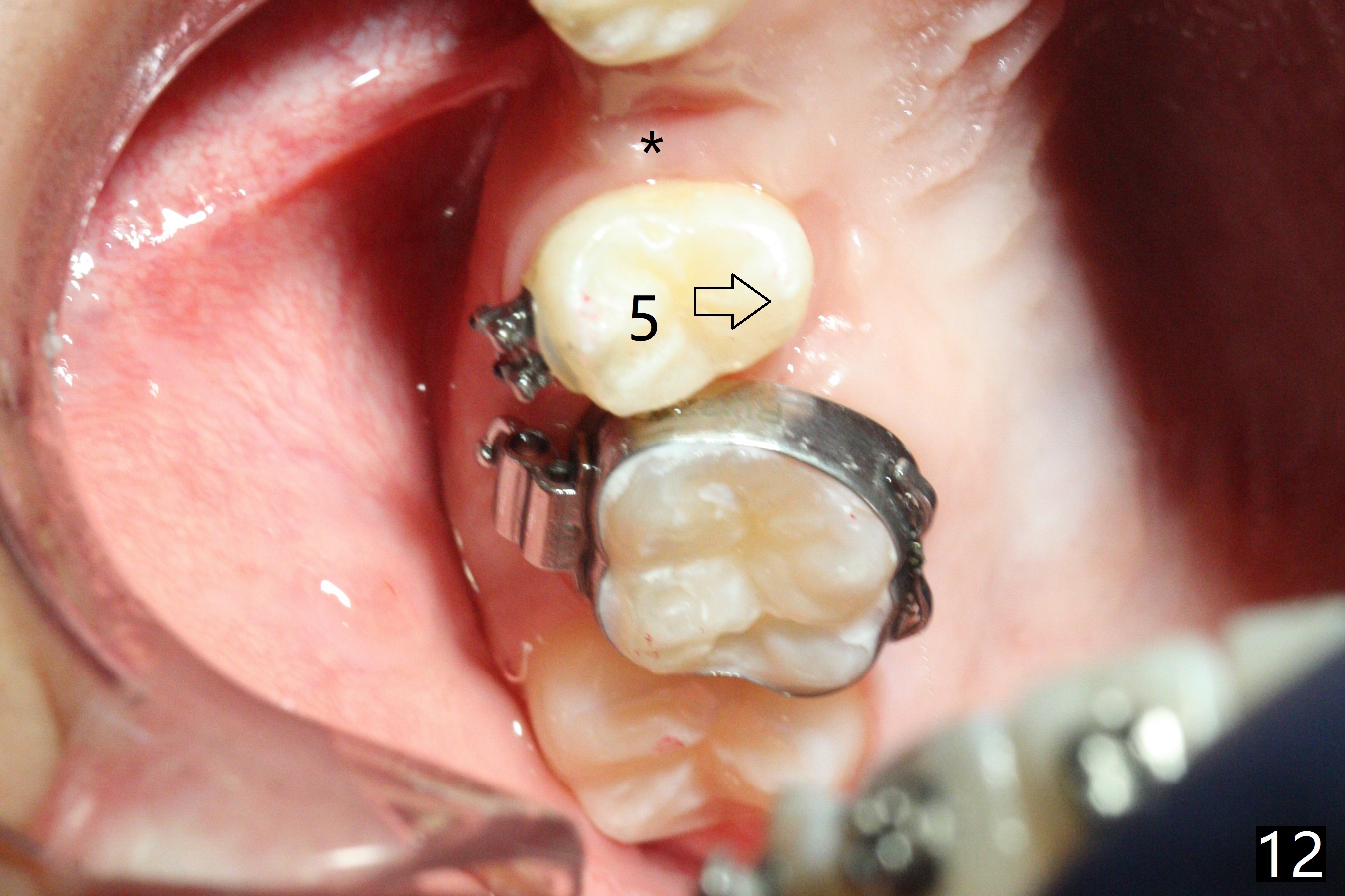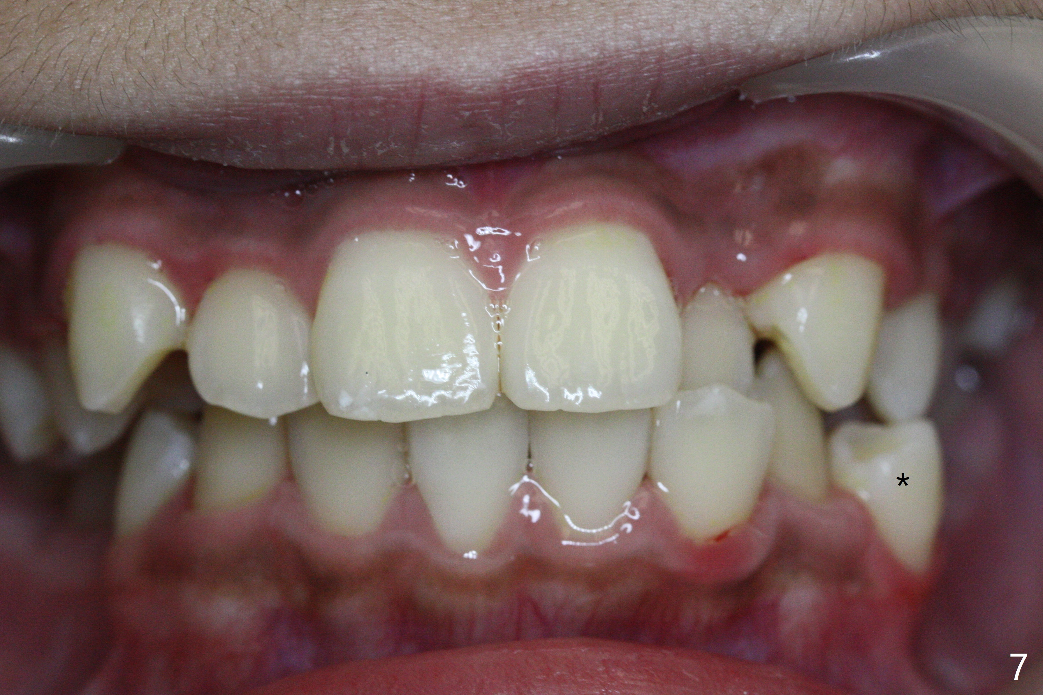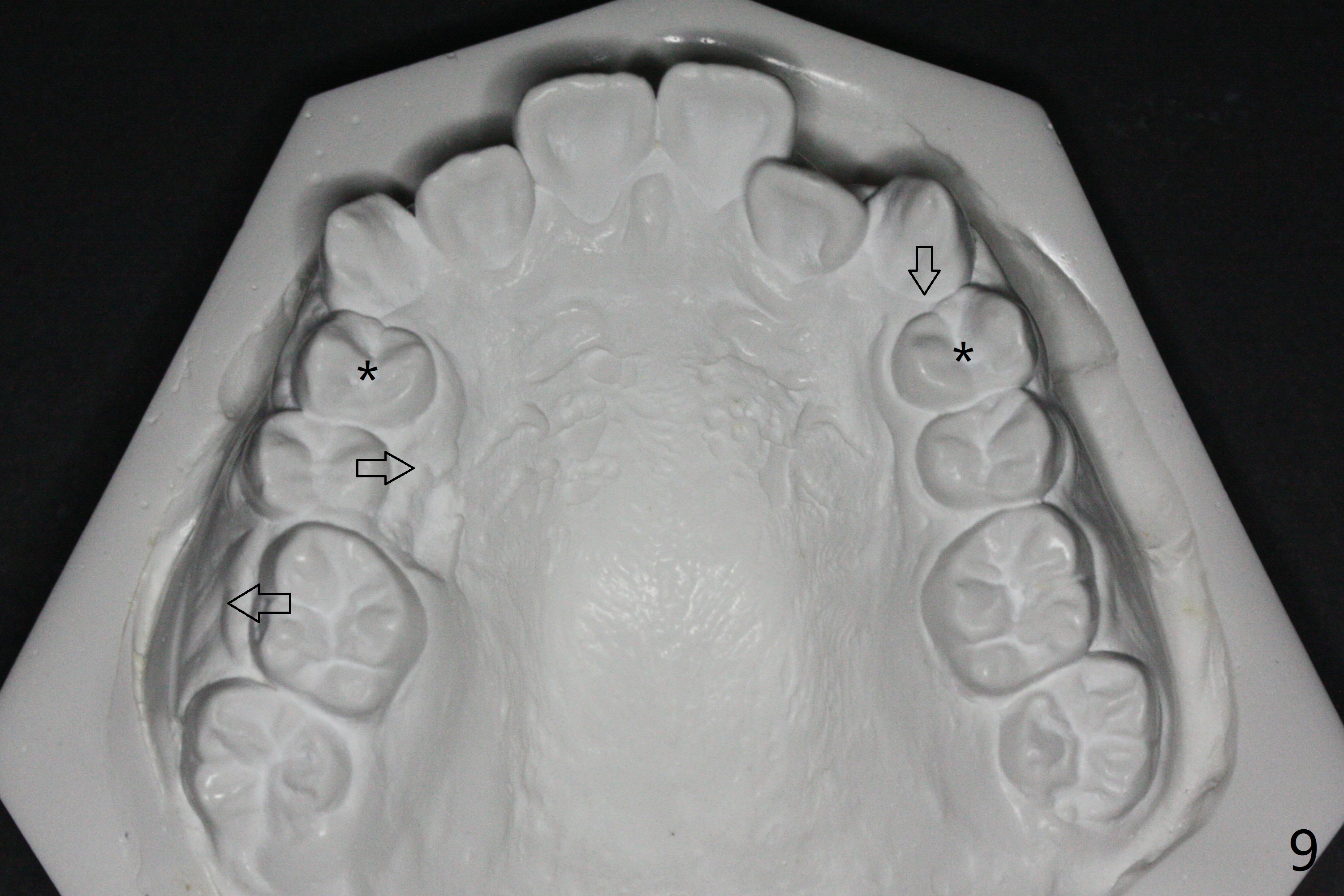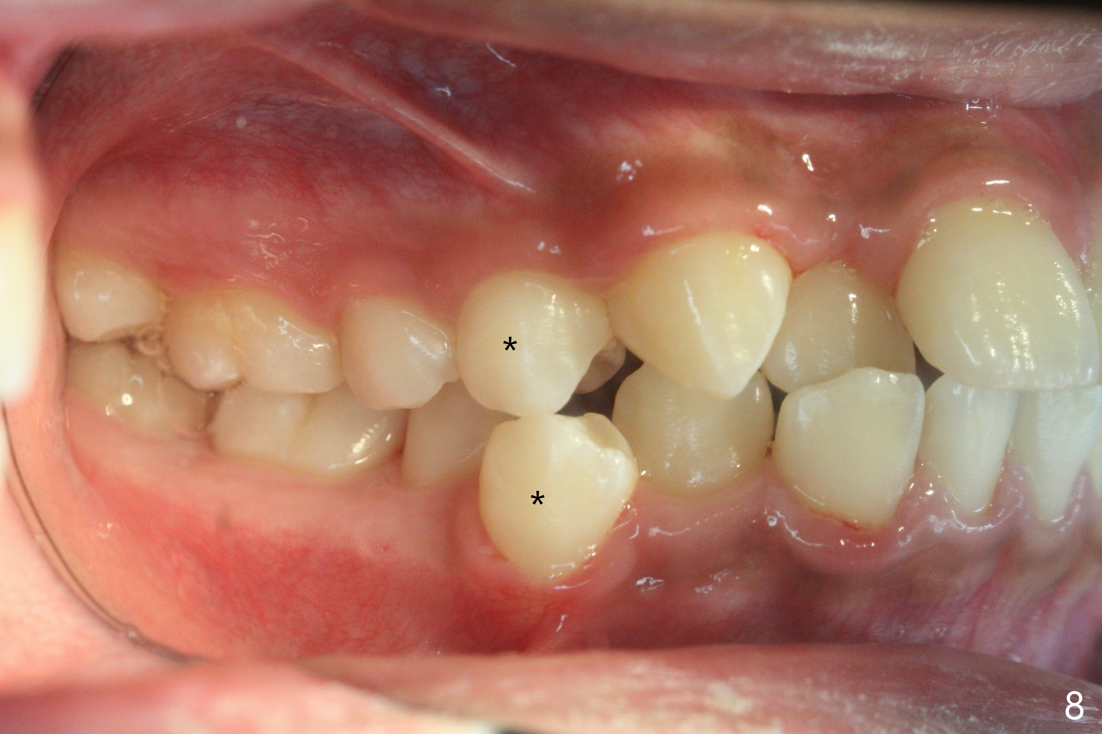 The patient will return 2 months post extraction. Shifting is expected to occur next to extraction sites (*) as indicated by arrows in Fig.9,11. Take photos if it is the case. Place bracket at UL2 if there is no space issue, but upside down (why?). The most flexible wire is anticipated. To establish Class I occlusion when wires are stiffer (18ss), LL5,6 will be mesialized as equally as LL3 distalized, while UL5,6 maintained basically in situ (Fig.11). How to accomplish?
