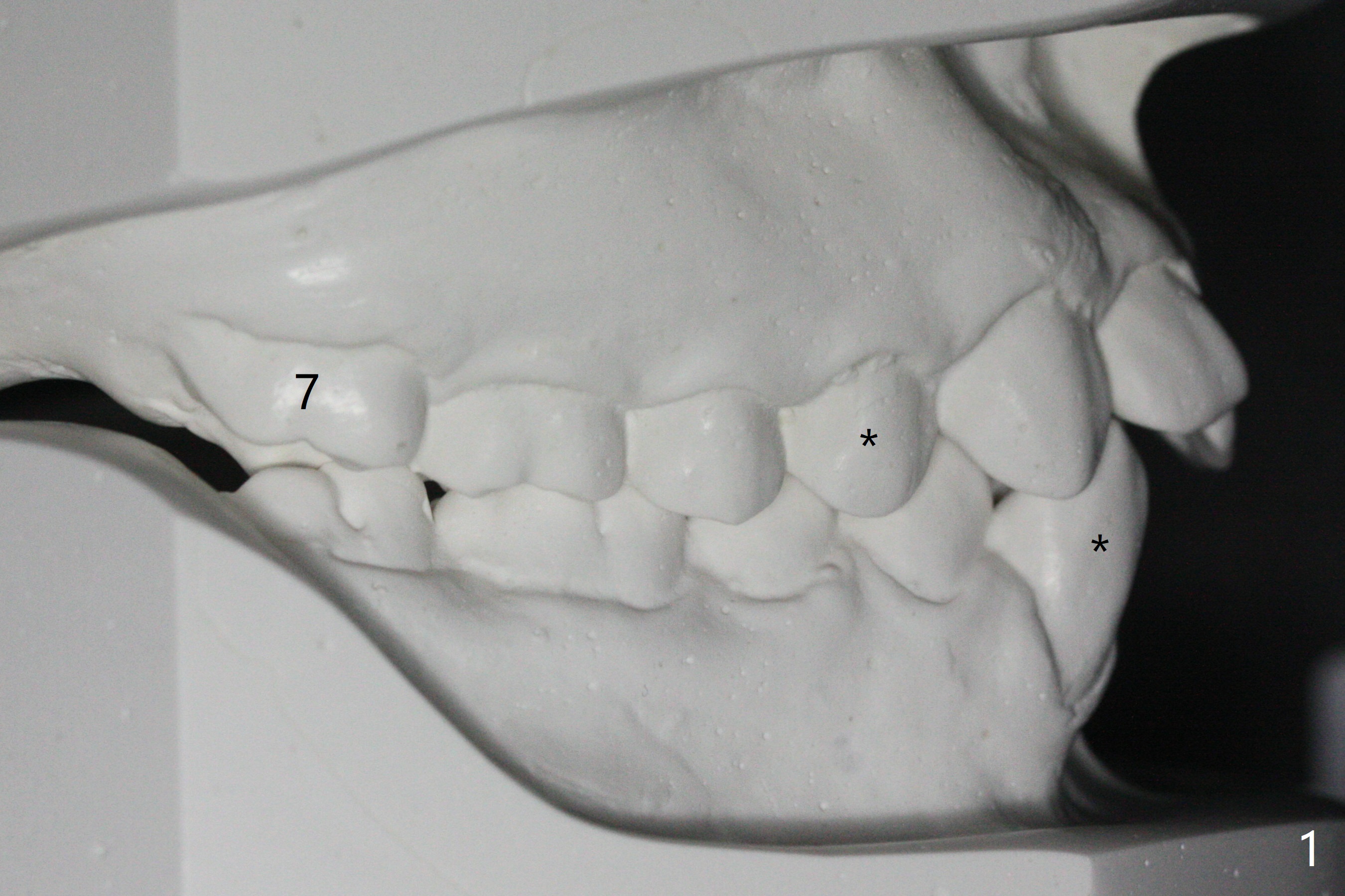Brackets and Bands will be placed 2 months post extraction (Fig.1-3: *). UR7 (overjet; Fig.1 (7), 2 (arrow)) will be retracted early using LR6 and 7 as anchorages. Because of good posterior interdigitation (Fig.1), U3s and LL3 will be distalized using closed coil spring between 3 and 6 (7 preferrable retrospectively). When this is finished, retract 4 incisors (each arch) together using a posted wire and the same closed spring.