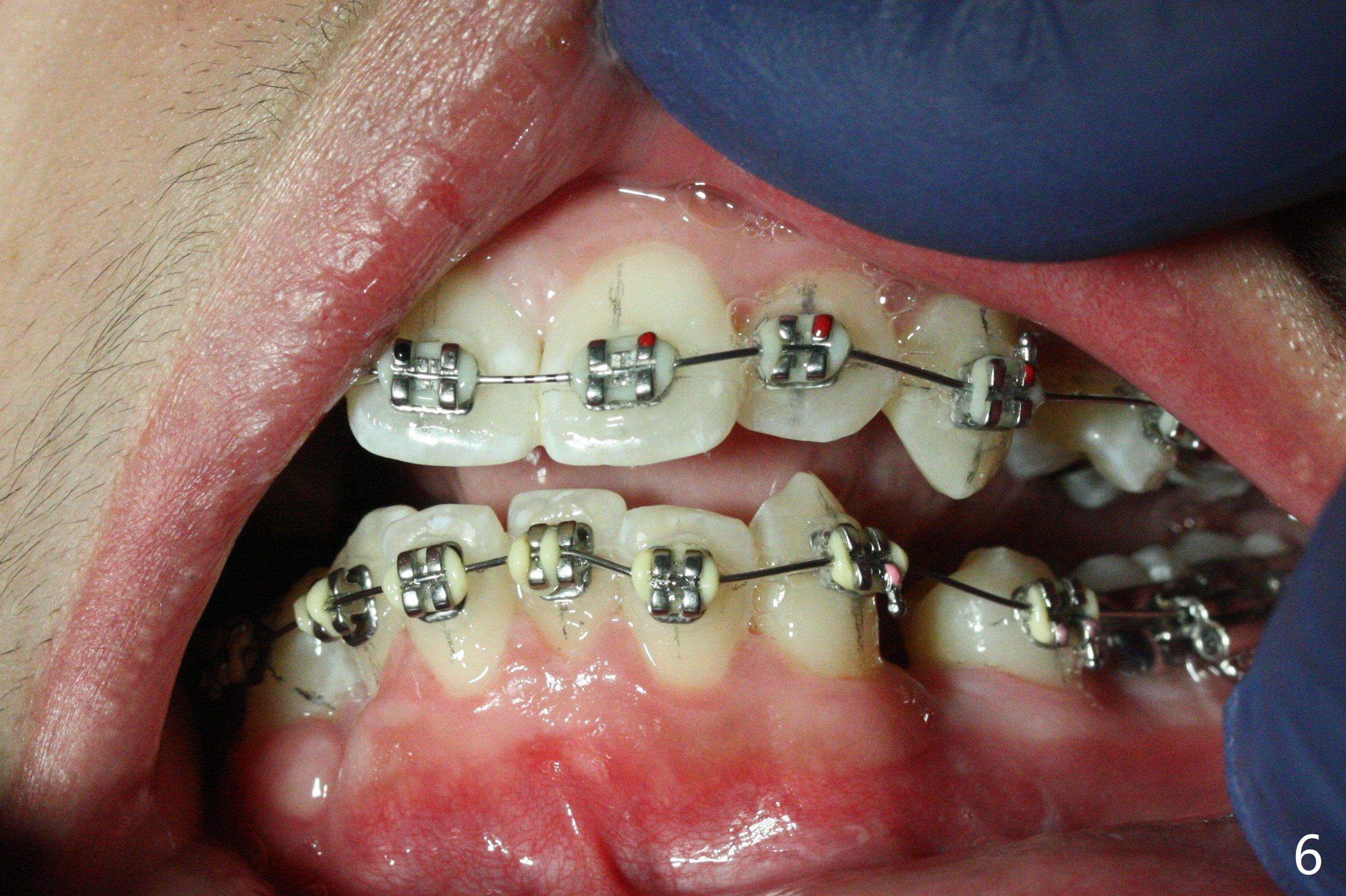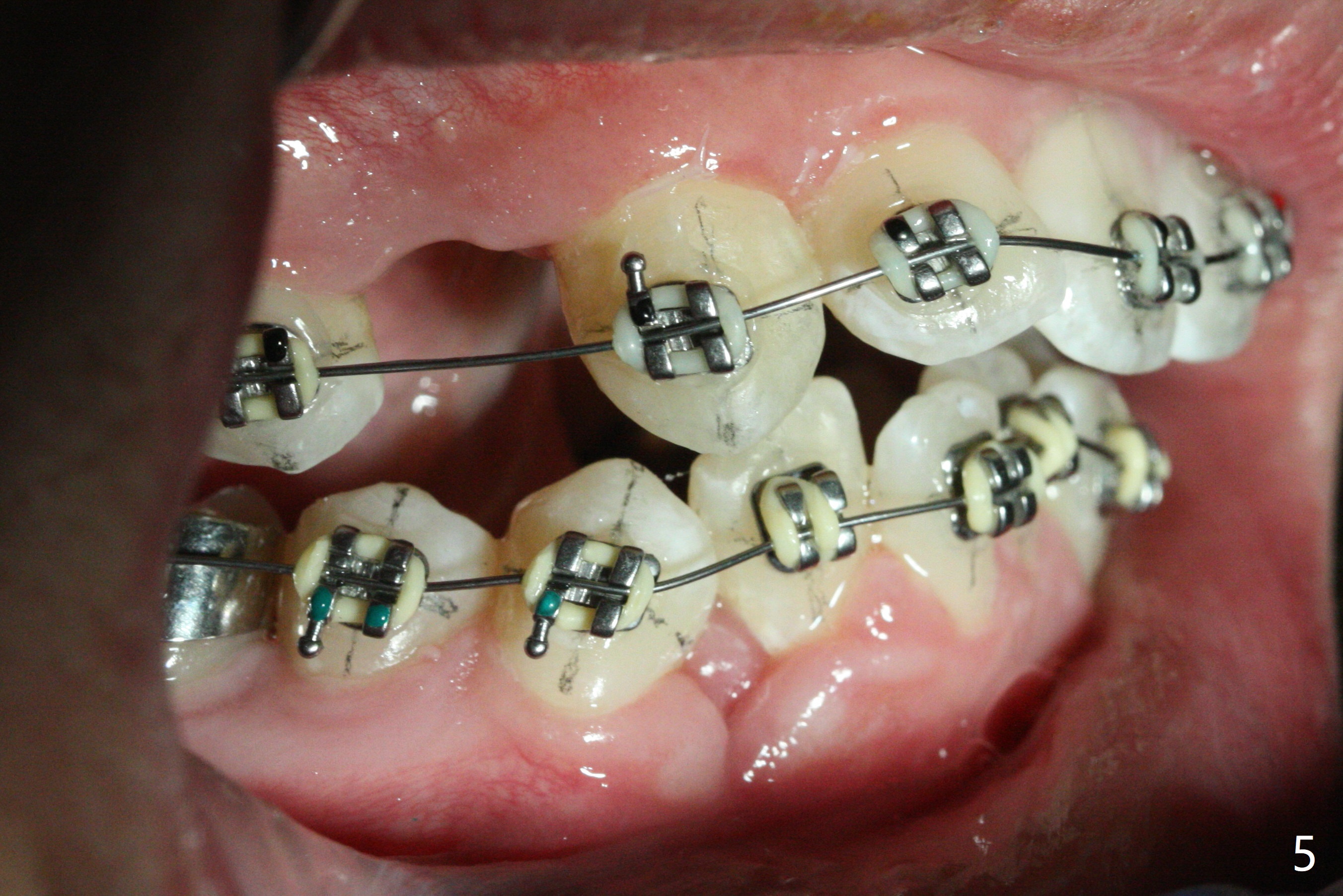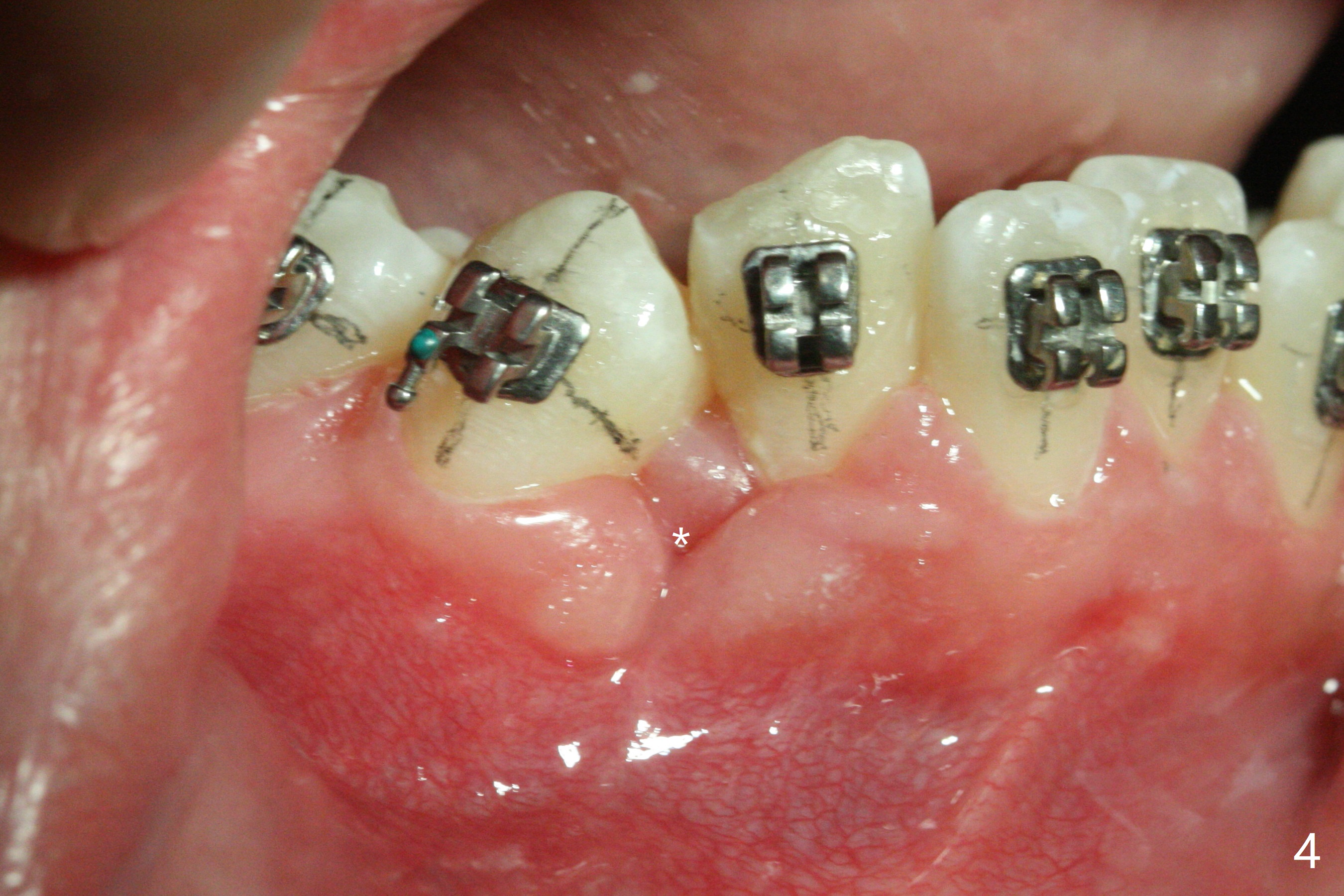 The socket of LR3 heals 2 months post extraction (Fig.4: *). LR4 is bracketed as LR3. Brackets and Bands are placed with 14 niti wires (Fig.5,6).