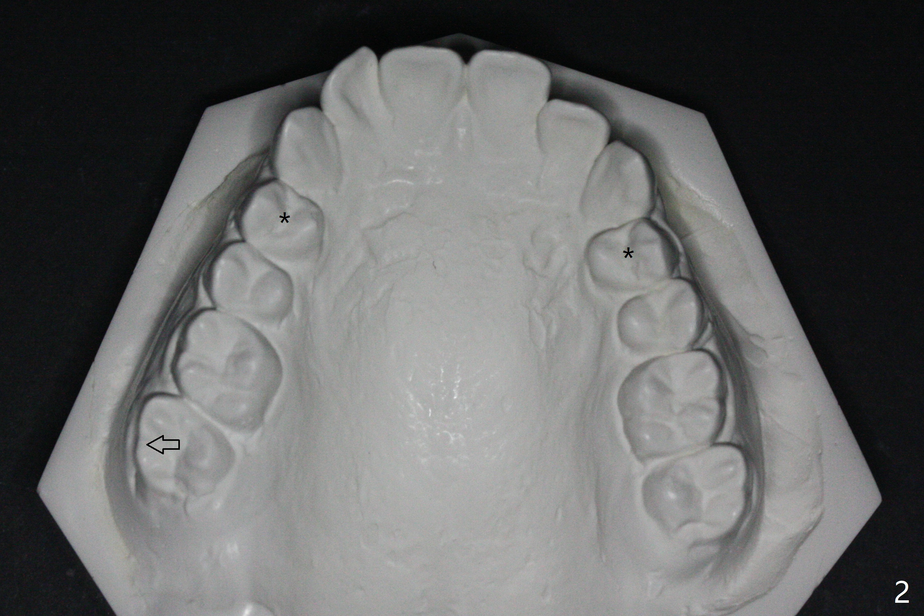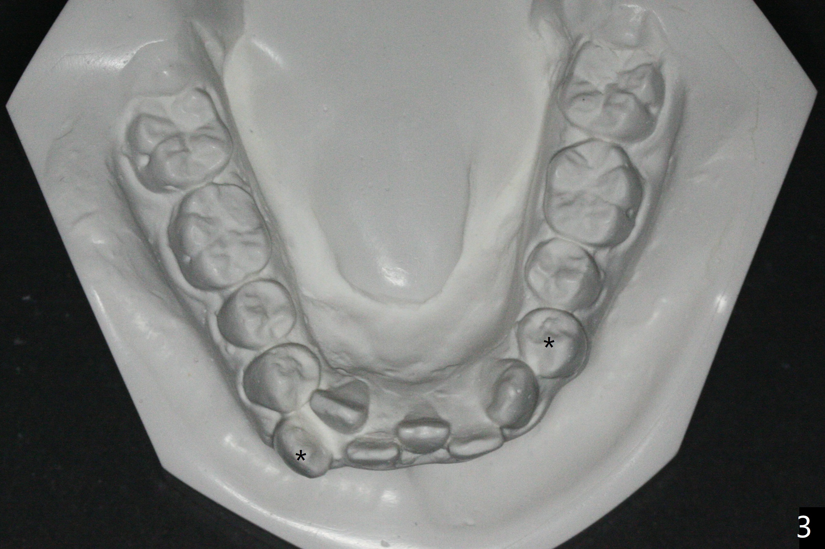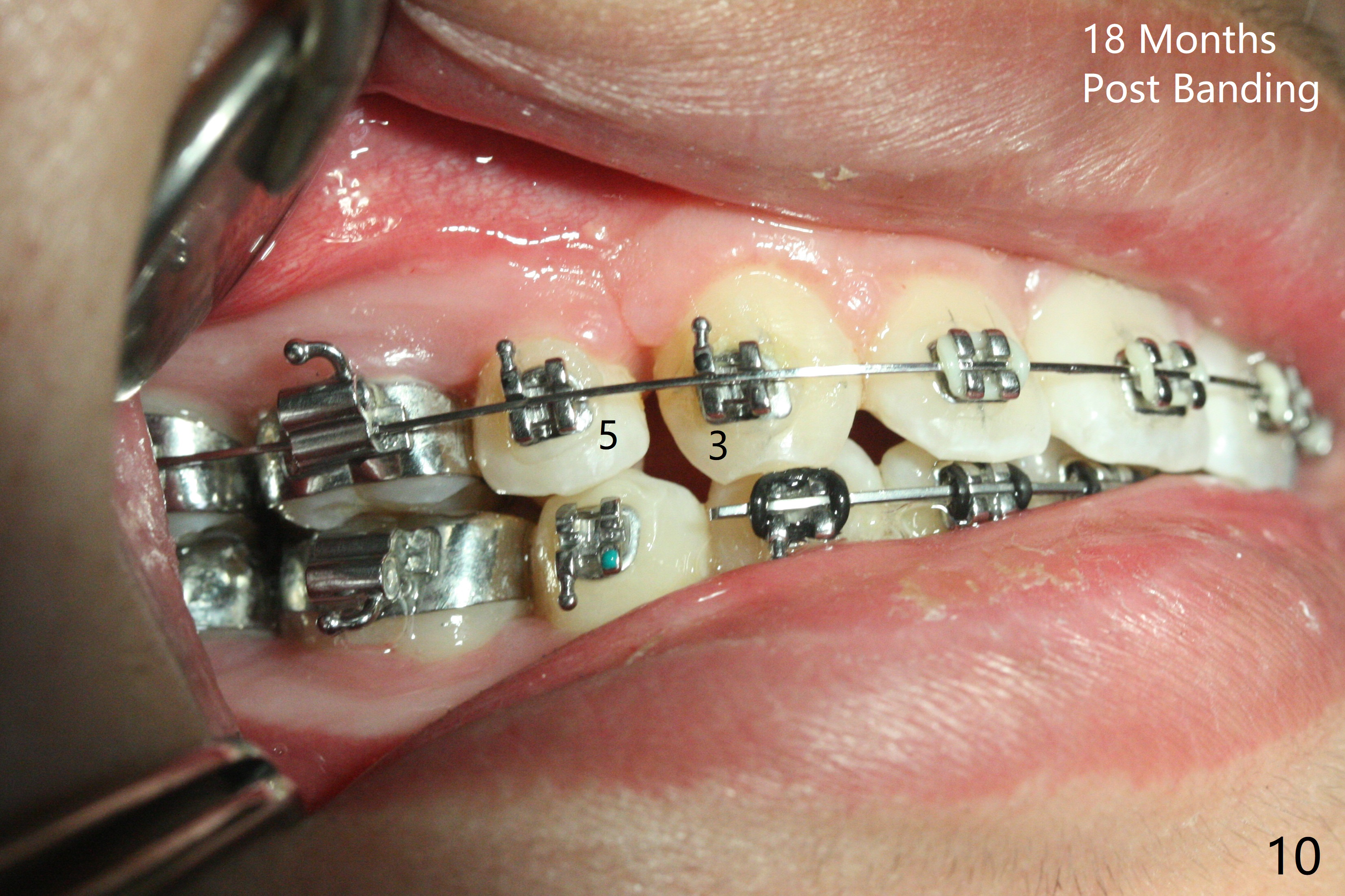 The socket of LR3 heals 2 months post extraction (Fig.4: *). LR4 is bracketed as LR3. Brackets and Bands are placed with 14 niti wires (Fig.5,6).