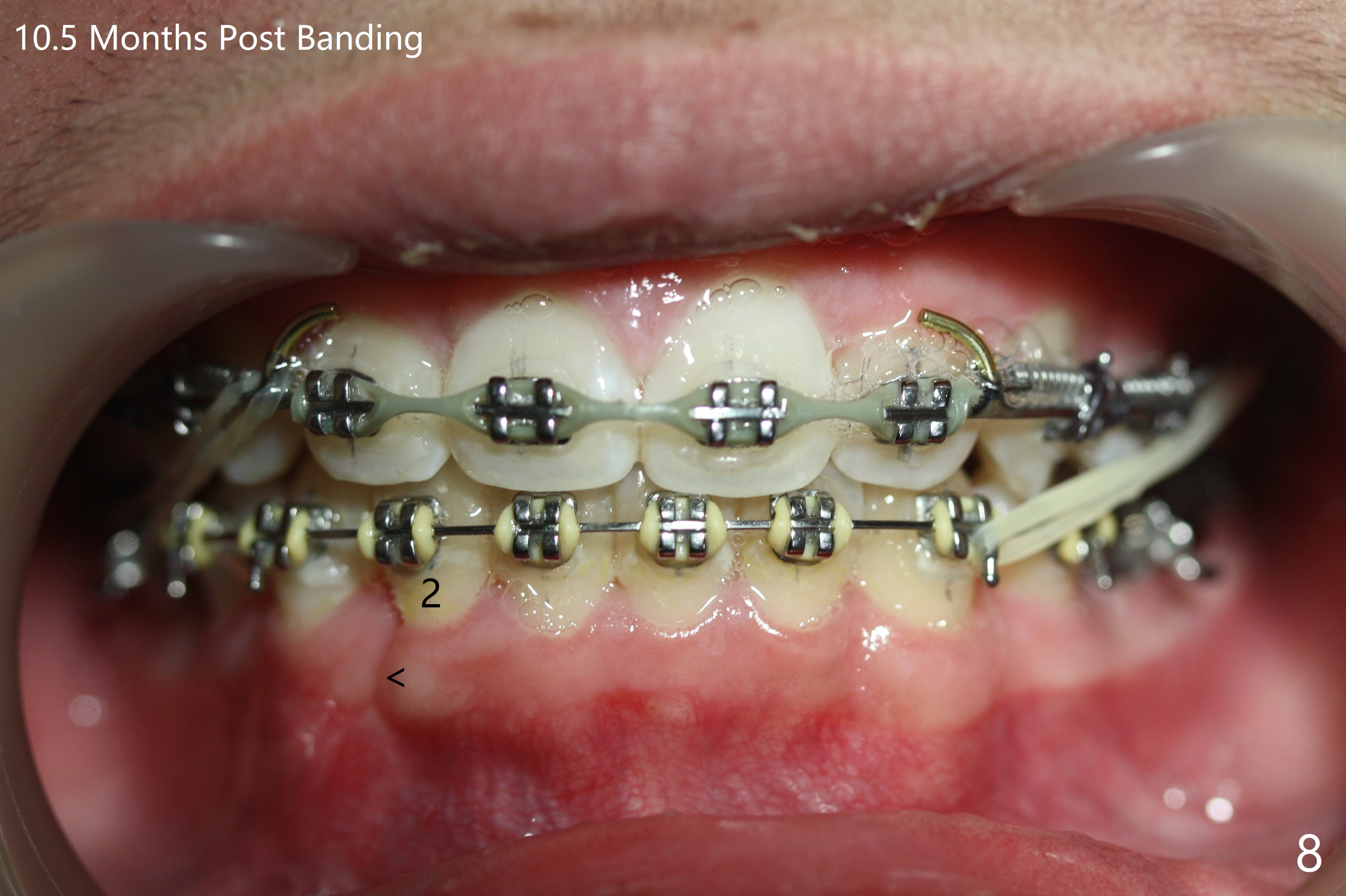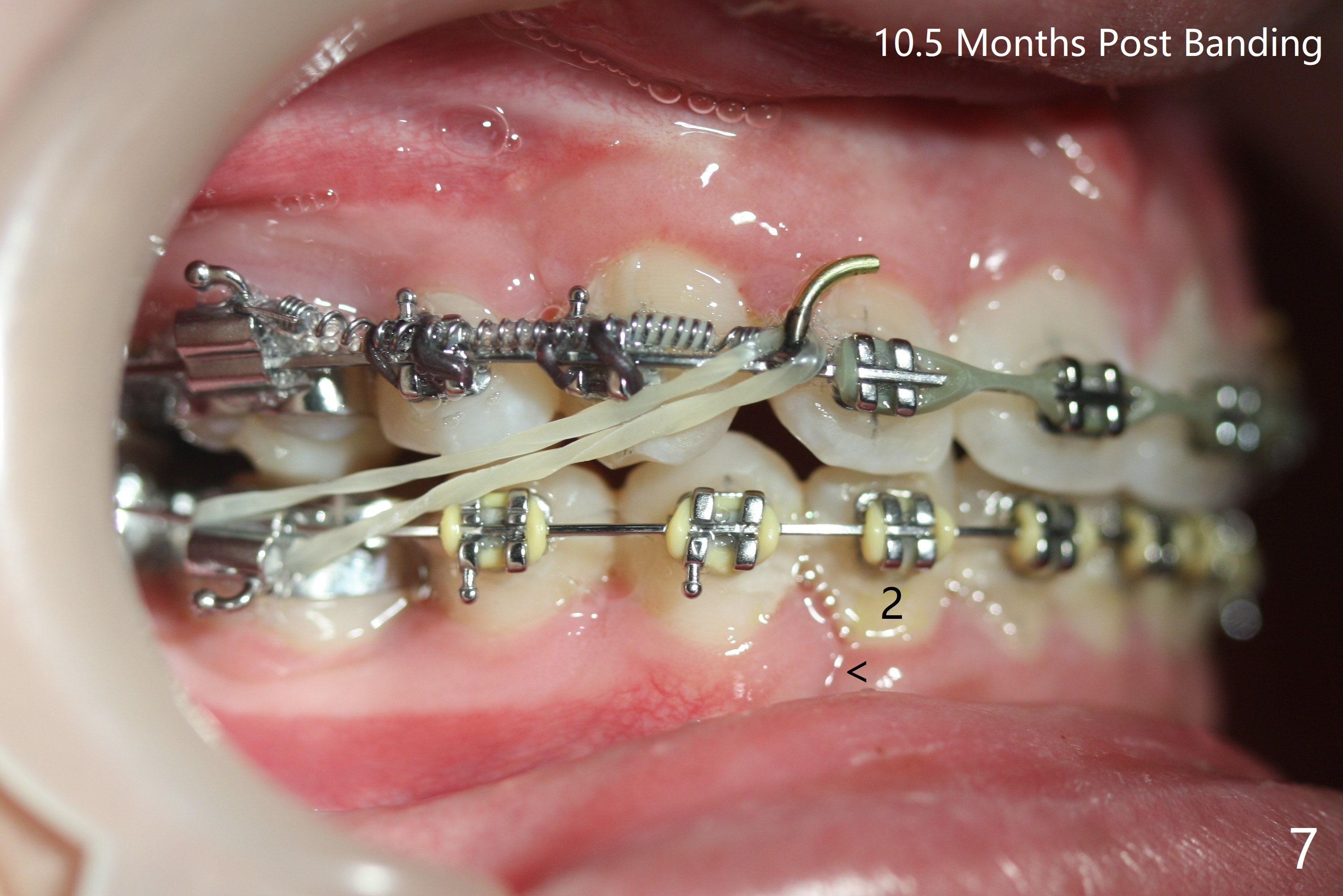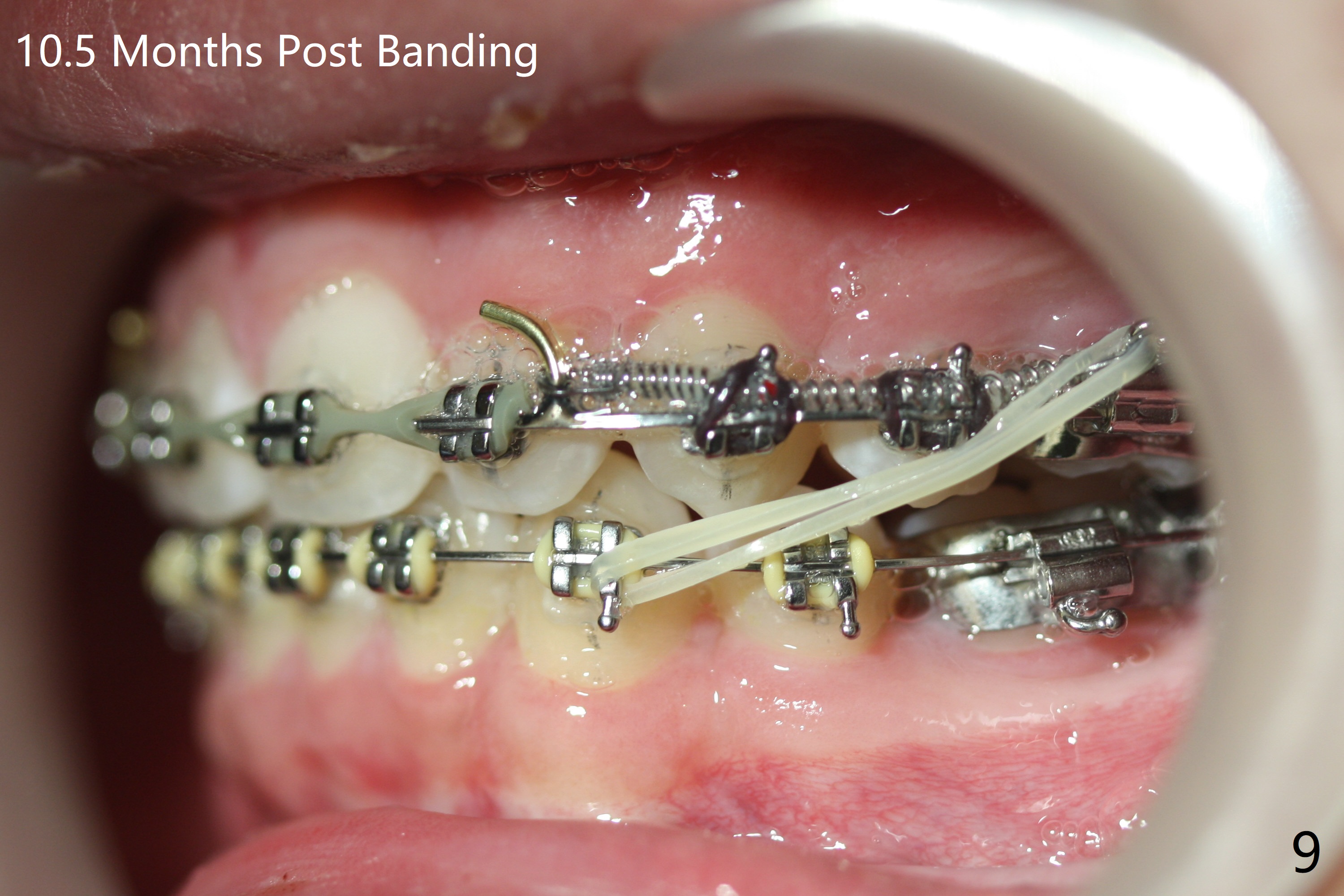 Tooth alignment is near finish 10.5 months post banding; elastics have been used for one appointment to shift the lower midline to the left (Fig.7-9).