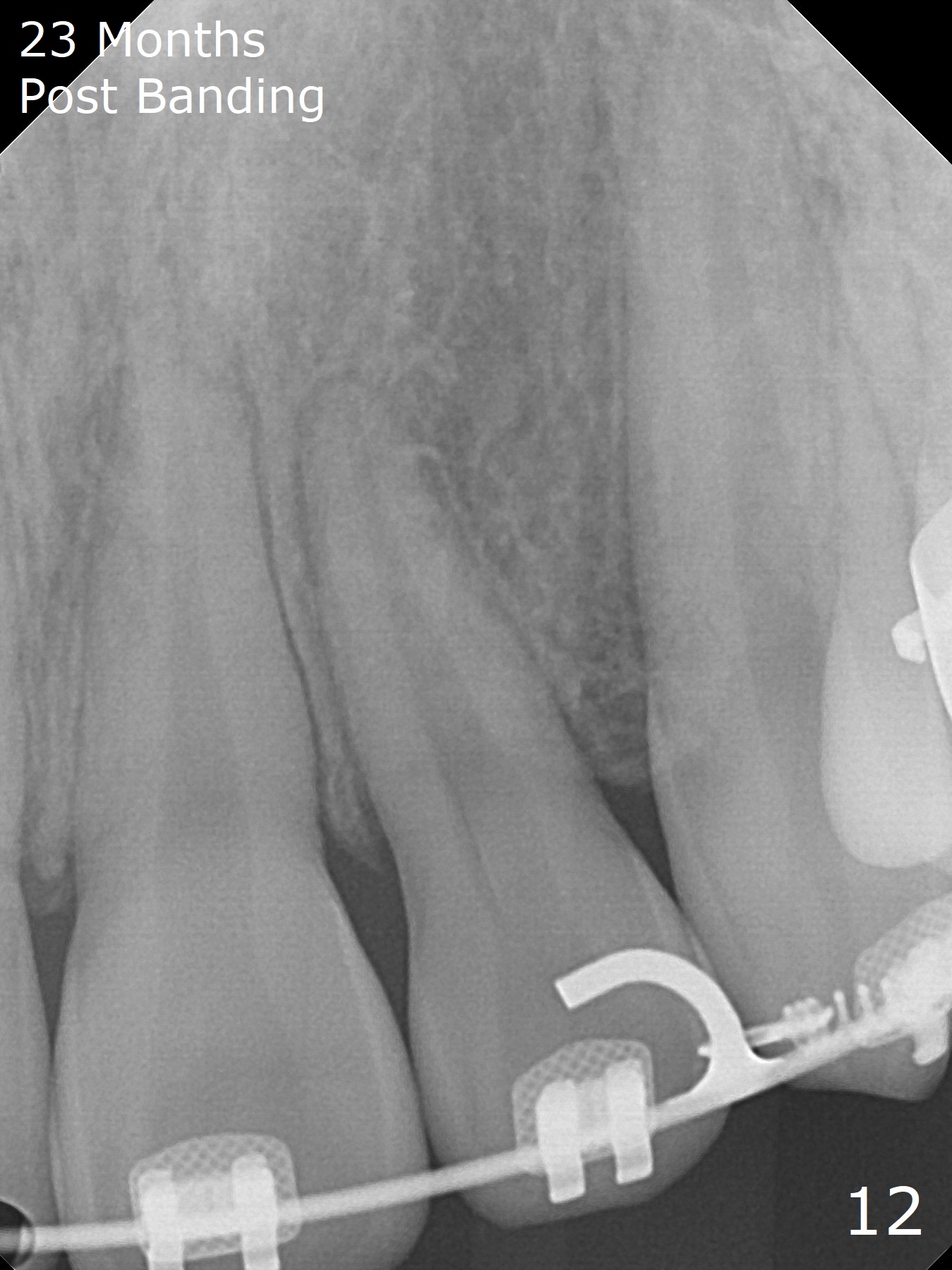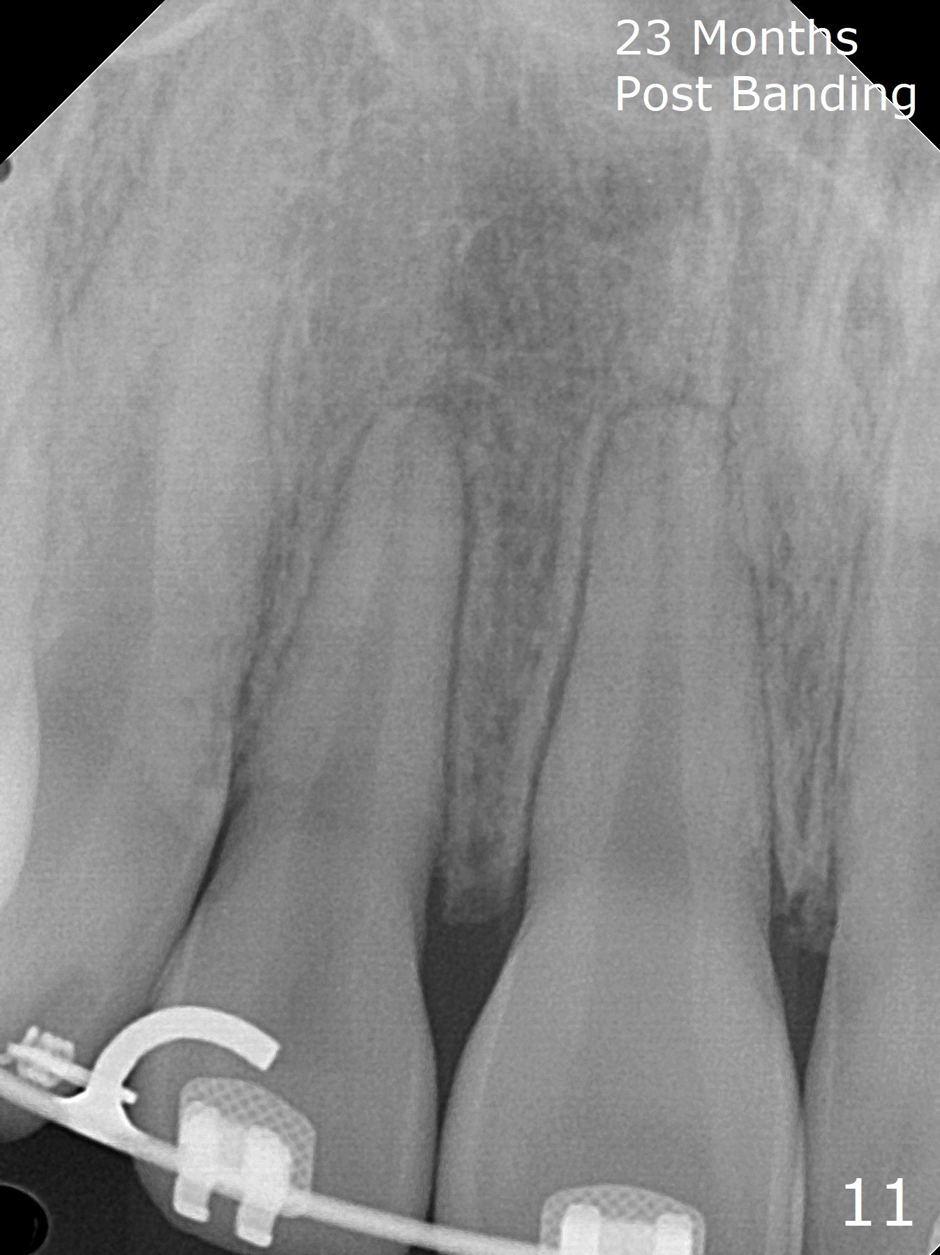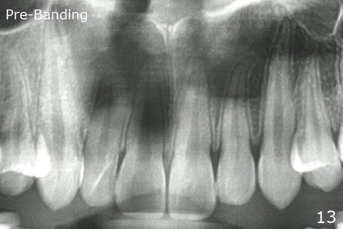 Anterior overbite and overjet and posterior interdigitation are satisfactory, while the roots of the upper incisors look shortened 23 months post banding (Fig.11,12, as compared to pre-banding (Fig.13). Brackets and bands are removed.