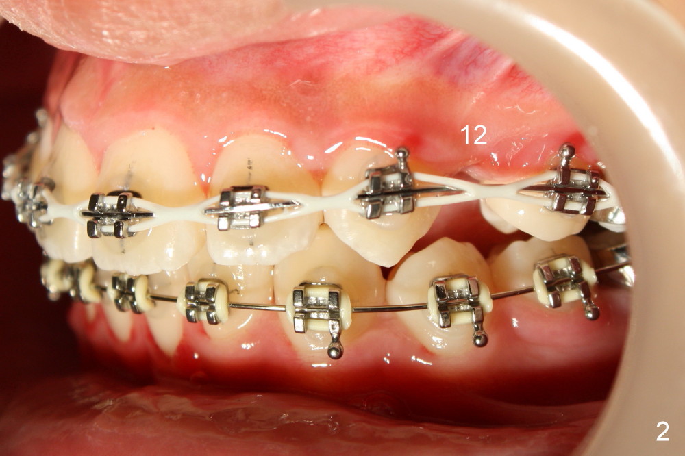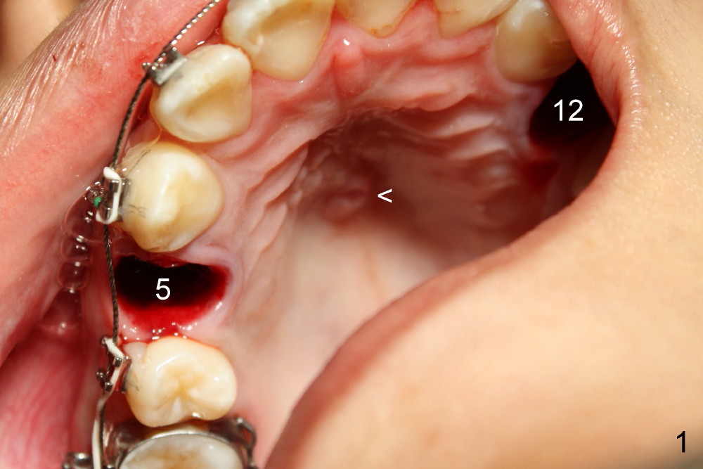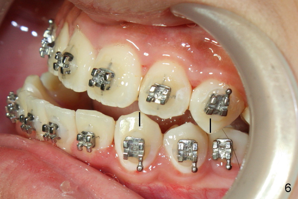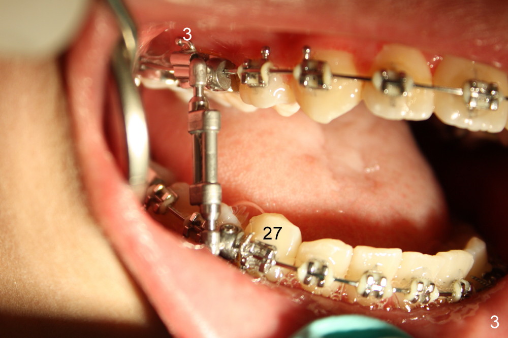 The mini-implant in the para-sagittal palate is loose, losing its anchorage. In fact the upper incisors are pushed forward using open coils springs. The T-wire and the mini-implant (Fig.1 <) are removed. A flexible wire is placed; two upper bicuspids are extracted (#5,12).