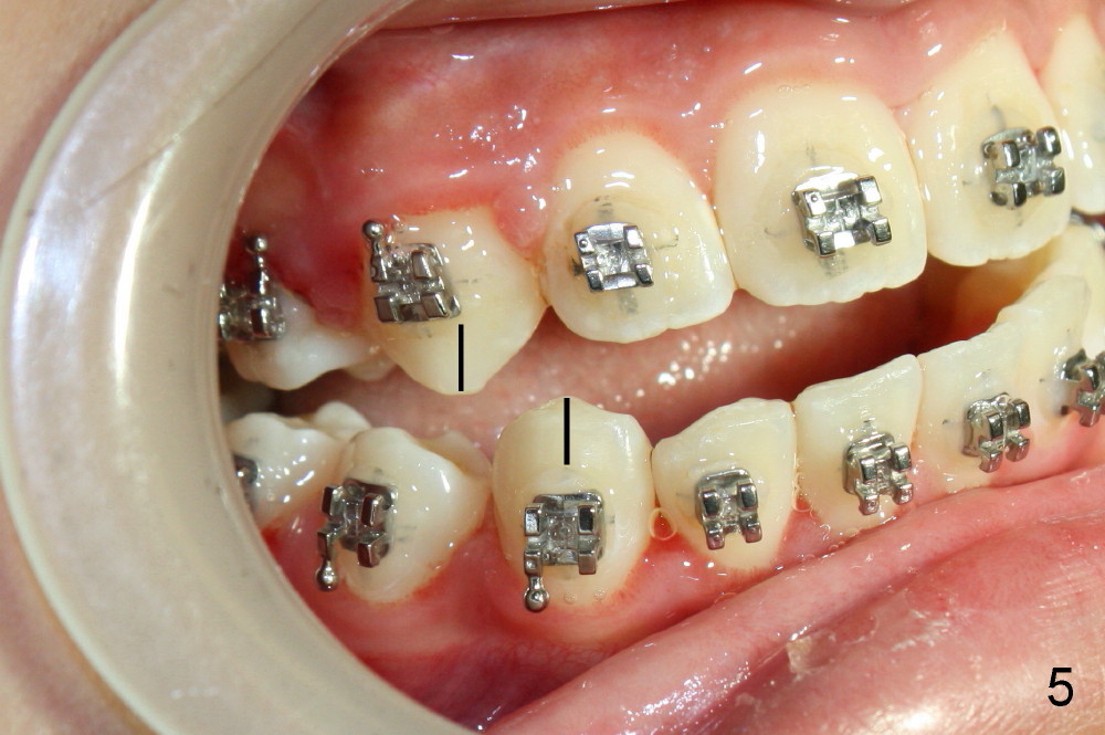 Again due to lack of close monitoring (summer vacation in China), overcorrection occurs (Fig.4-6): from Class II malocclusion to Class III (especially left side (Fig.6 black lines) with anterior open bite and midline shifting (Fig.4 white lines).