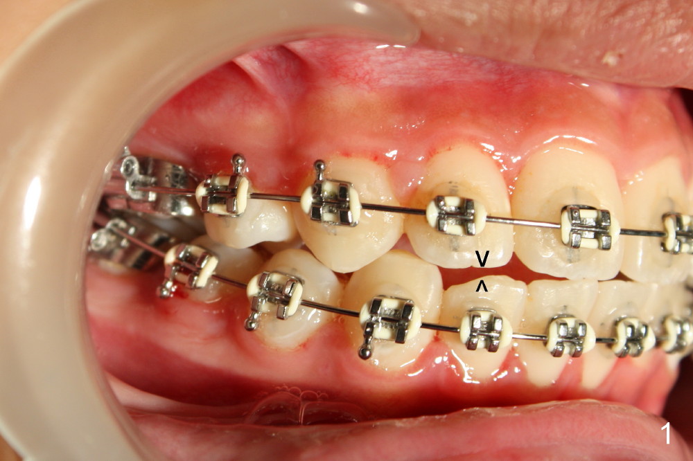 Christina has had the most complicated orthodontic treatment: phase one, mini-implant, extraction, and distalization. When canine Class I occlusion is achieved, anterior open bite is noted (Fig.1 between arrowheads). It is probably due to premature contact between the right upper and lower canines (Fig.2: #6, 27).