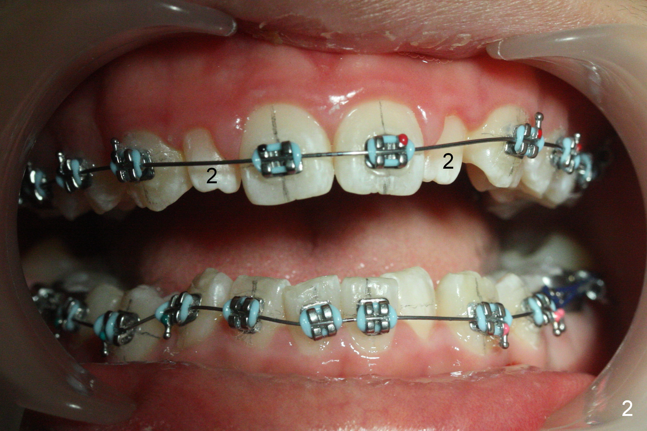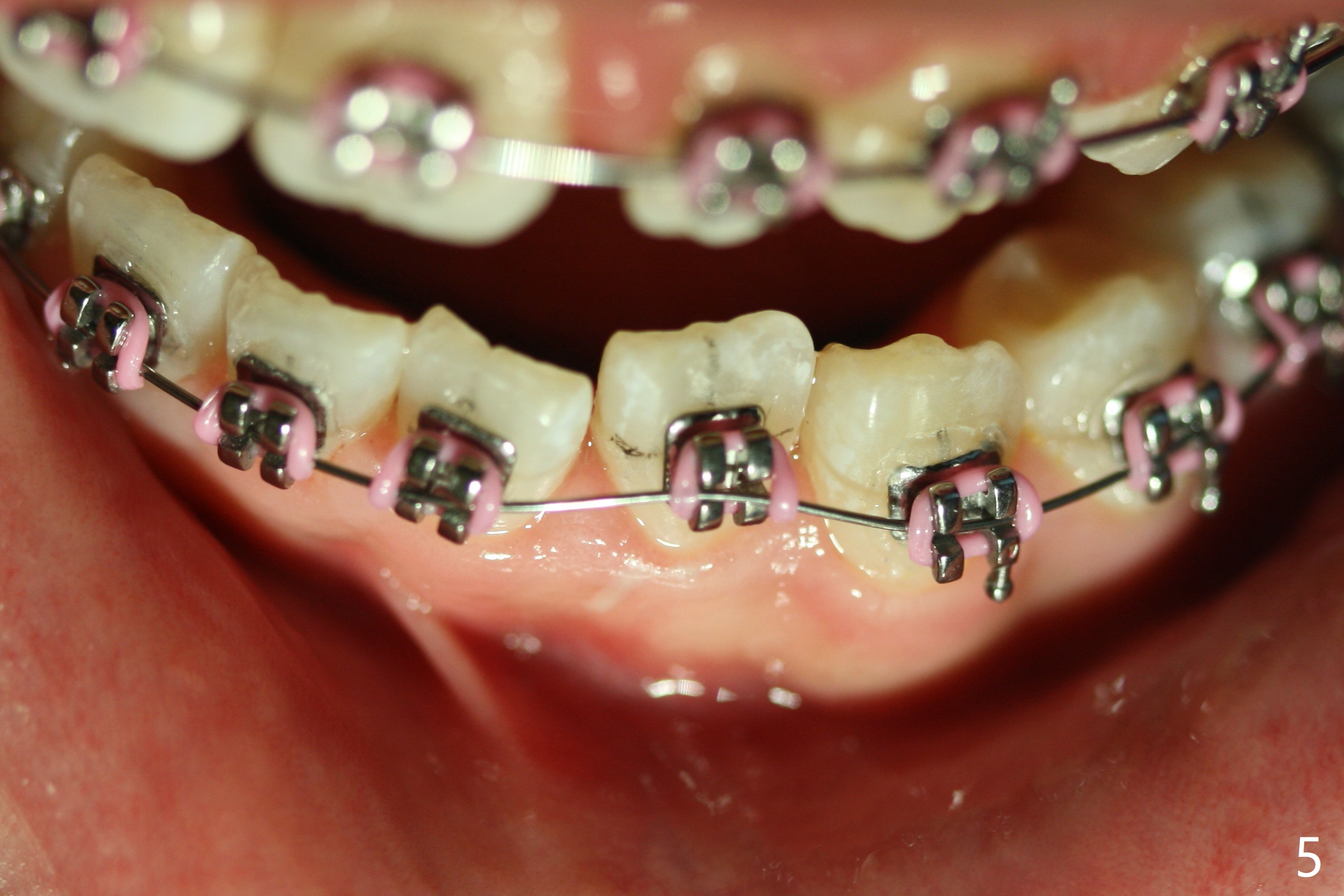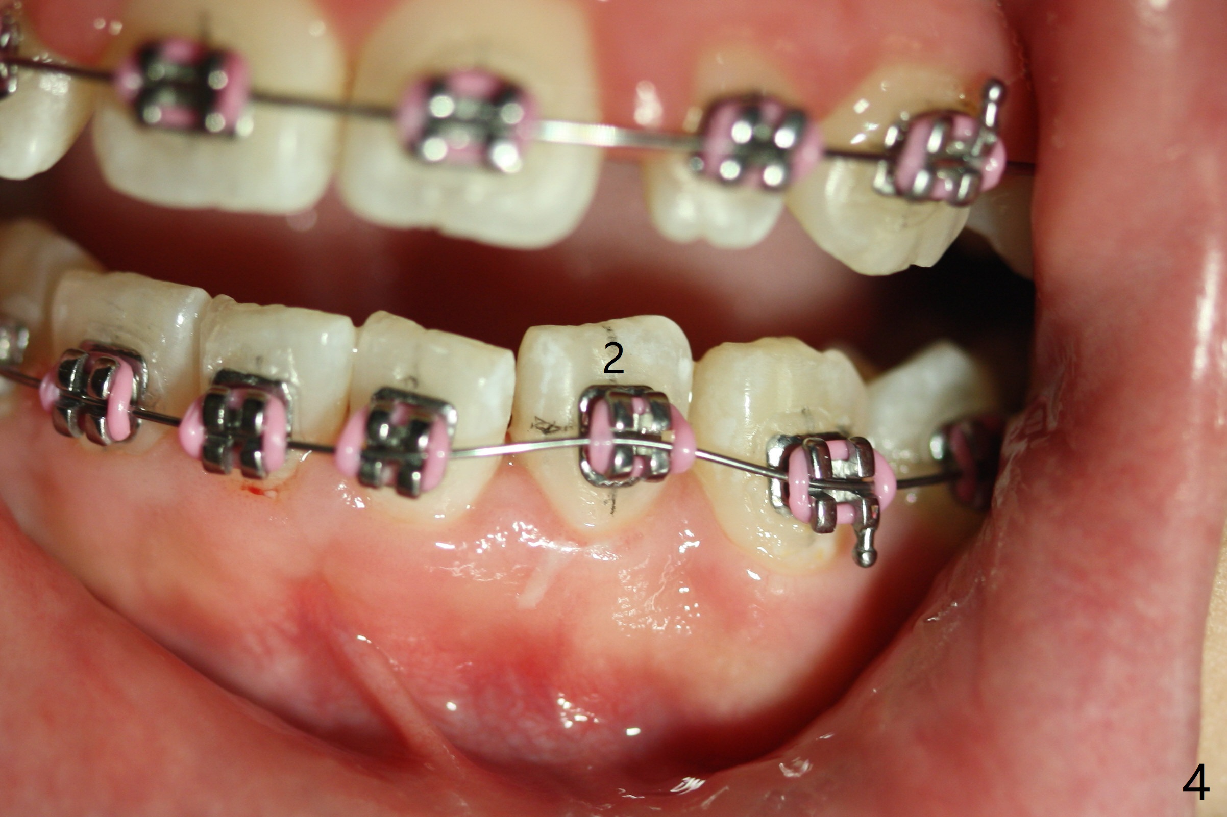 As planned, the peg laterals do not have brackets placed (Fig.2), since their position and shape will be ultimately decided by veneers. Alignment of the lower arch is more severe than that of the upper one, characterized by severe crowding at LR 3 and 4 (Fig.1) and rotation of LL 5 (Fig.3). Oral hygiene does not improve during orthodontic treatment. Impression will be taken prior to debanding. Space is obtained for LL2; brackets are placed at LL2 and 5; 14 niti wire is placed 9 months post banding (Fig.4-6). Orthodontic treatment is terminated prematurely partially due to poor oral hygiene.