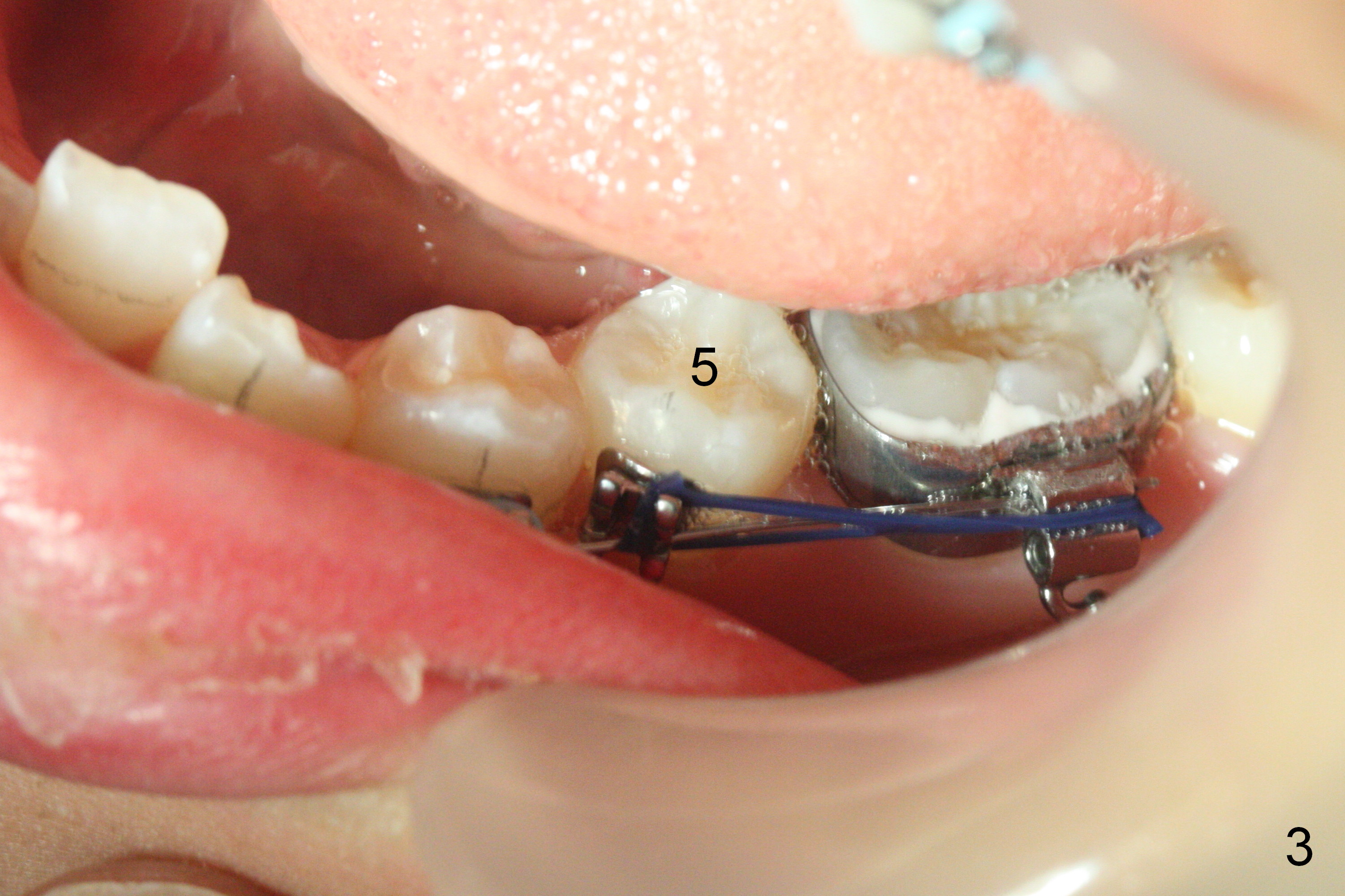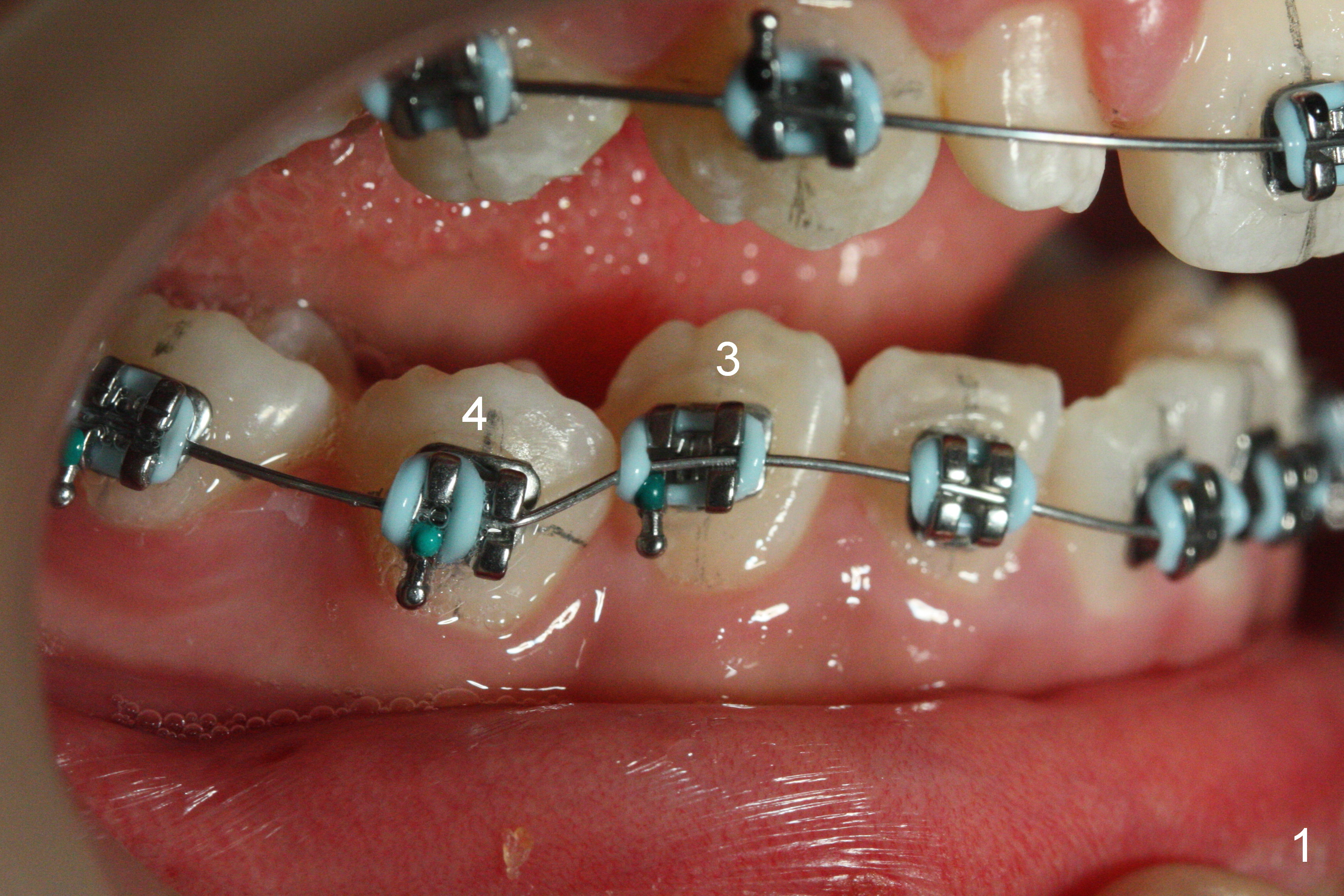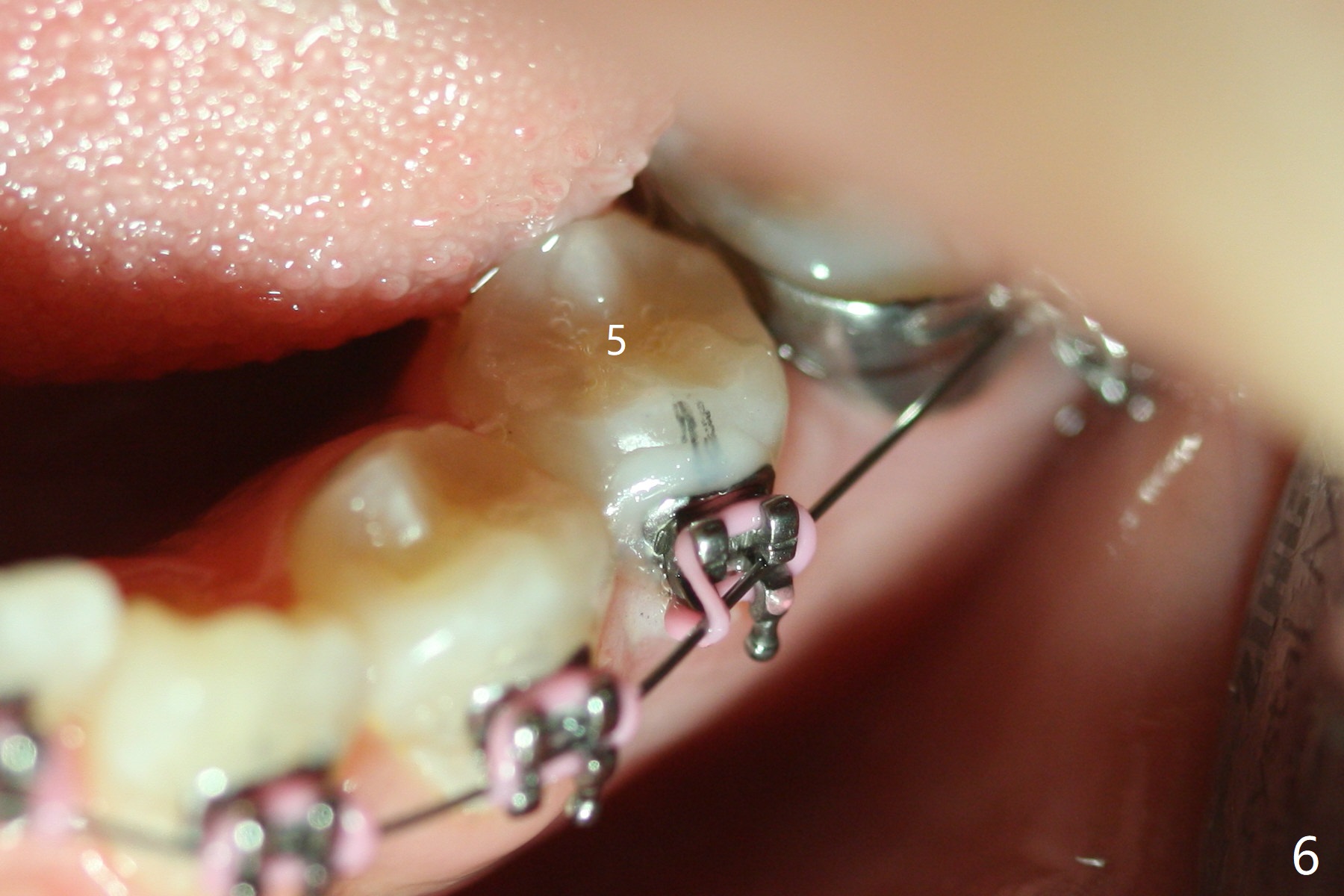 As planned, the peg laterals do not have brackets placed (Fig.2), since their position and shape will be ultimately decided by veneers. Alignment of the lower arch is more severe than that of the upper one, characterized by severe crowding at LR 3 and 4 (Fig.1) and rotation of LL 5 (Fig.3). Oral hygiene does not improve during orthodontic treatment. Impression will be taken prior to debanding. Space is obtained for LL2; brackets are placed at LL2 and 5; 14 niti wire is placed 9 months post banding (Fig.4-6). Orthodontic treatment is terminated prematurely partially due to poor oral hygiene.