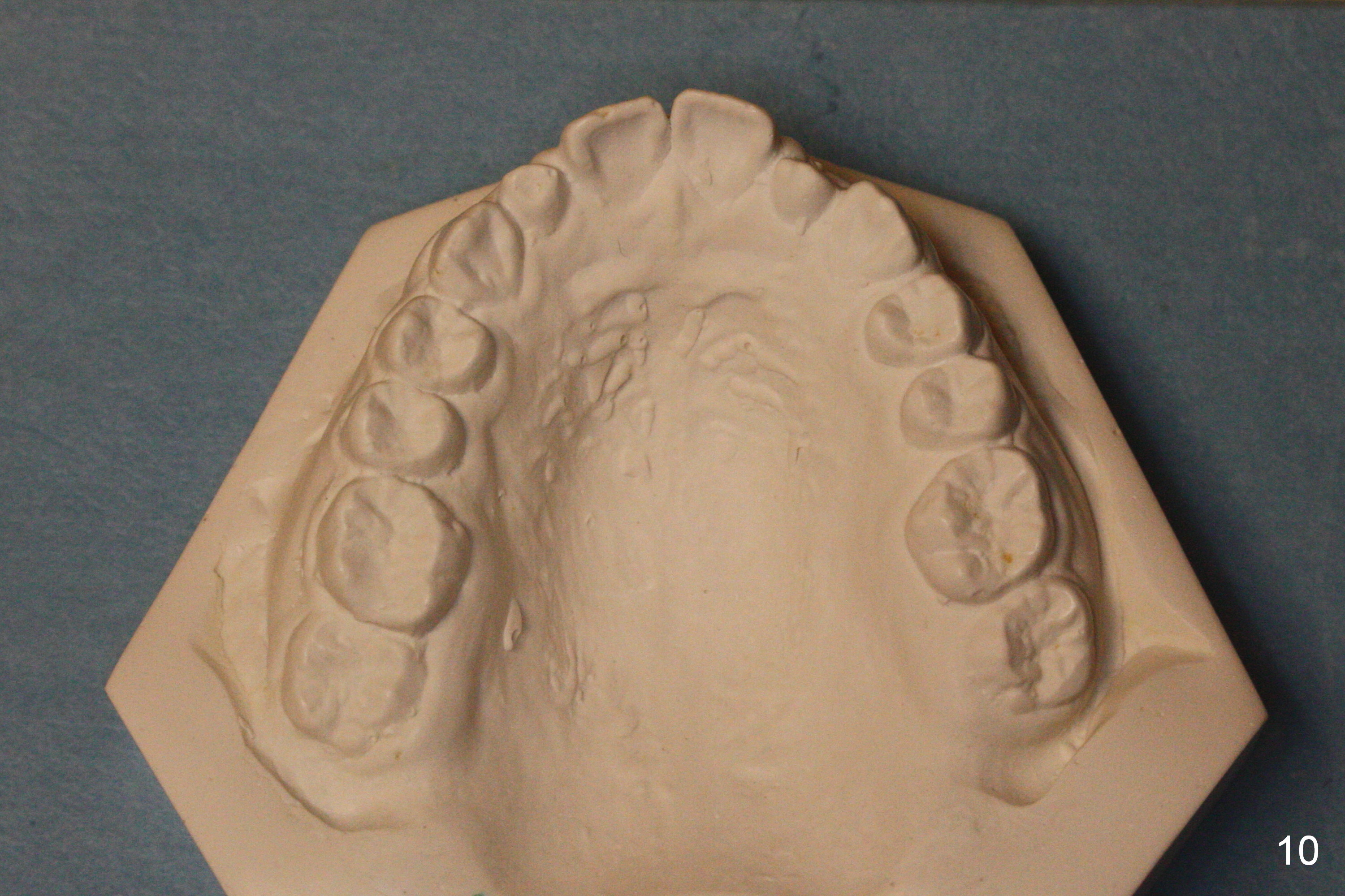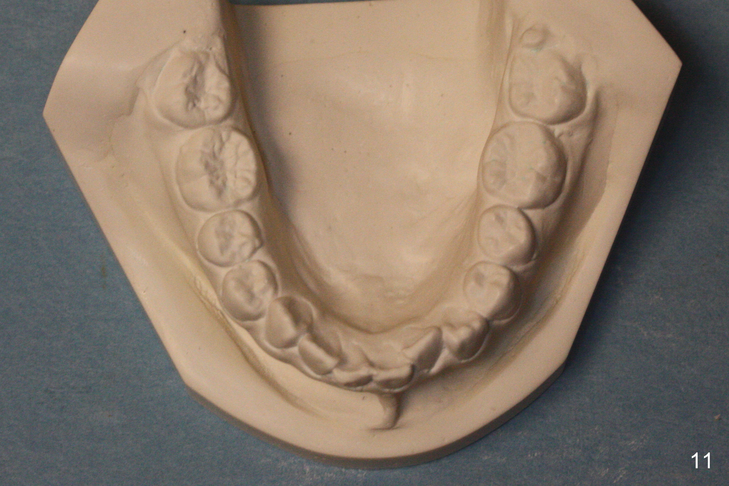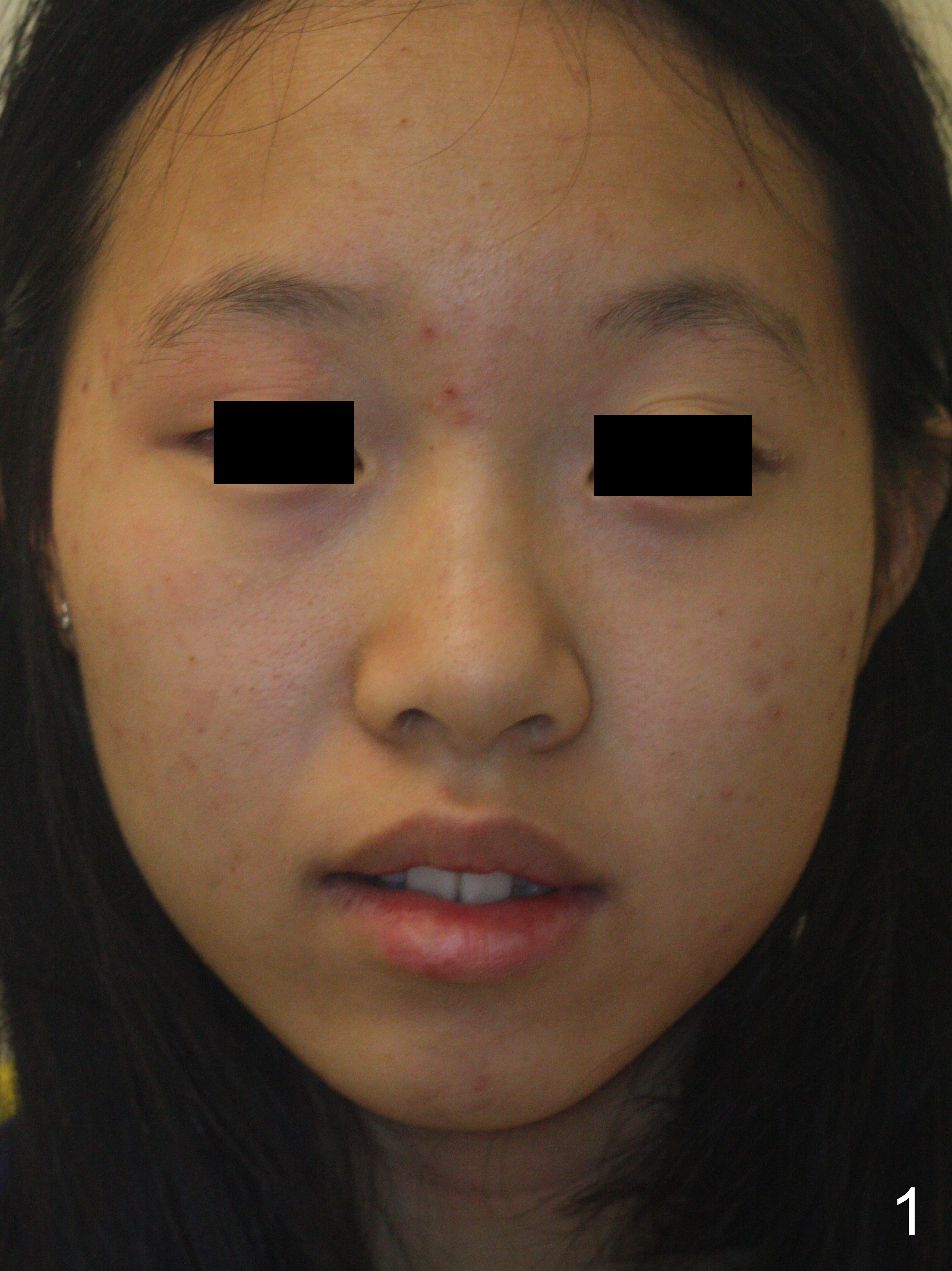 A 13-year-old girl denies mouth breath/nasal obstruction in spite of pointed narrow arches (Fig.10,11). When she is relaxed, the lips remain unclosed (Fig.1). There is lip strain when they try to close (Fig.2). When the patient is smiling, the upper central incisors have extra exposure (Fig.3). Differential bracket placement between U1 and U3 (4 vs. 5 mm from the incisal edge) should be able to correct the exposure. Profile views show the mild lip protrusion (Fig.4,5). Class II elastic retraction when arch wires reach 18 ss may be able to move the lower arch forward (Fig.6 arrow) and/or move the upper one backward (take care of Class II malocclusion (Fig.8,10) and lip profile).