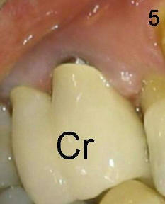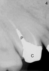 1. A post is needed when the tooth has a large defect and has finished root canal therapy (R in Fig.1).  There are two types of post: prefabricated and cast (one and two appointments, for small and large decays, respectively).  A post space is created in the largest canal of the tooth (arrowheads in Fig.2).  Either a prefabricated post is inserted into the post space or a plastic pattern is made to fit the space.  The outside portion of the pattern is prepared (trimmed) to become part of the tooth structure.  The plastic pattern is sent to lab to make a cast post (P) and core (C, Fig.3), which is inserted (Fig.4) into the post space.  Finally a crown is cemented (Cr in Fig.5)