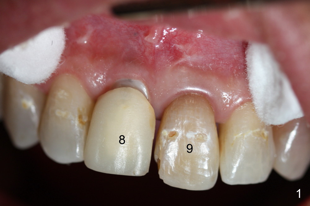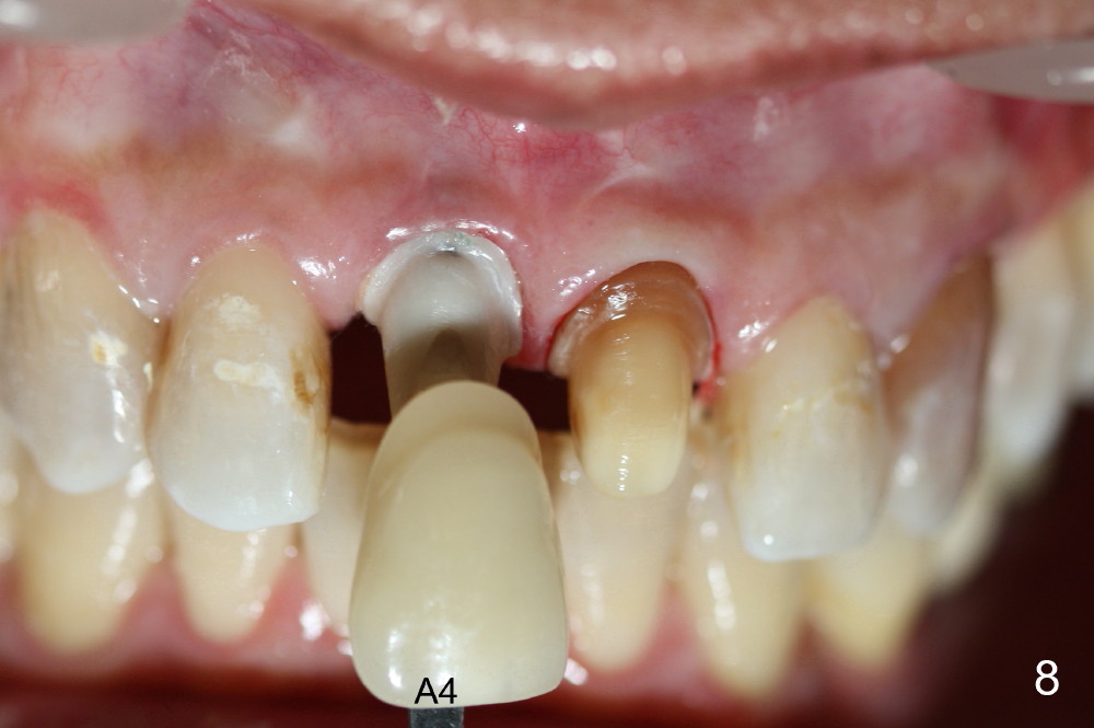 Lady, 40s, #8 implant buccally positioned, Zirconia abutment. The gingival line is higher than that of #9 (Fig.1). #8 provisional is more bulky than #9 (Fig.2,3).