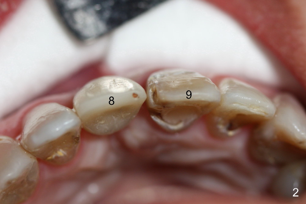 The discolored #9 has been internally and externally bleached at home and in office. A fiber post has been placed.