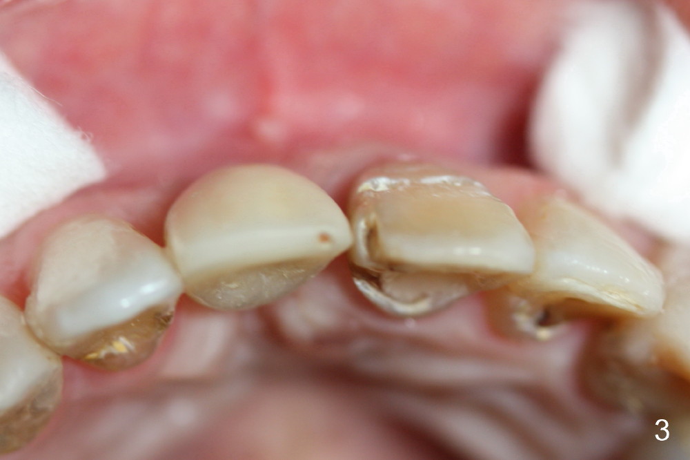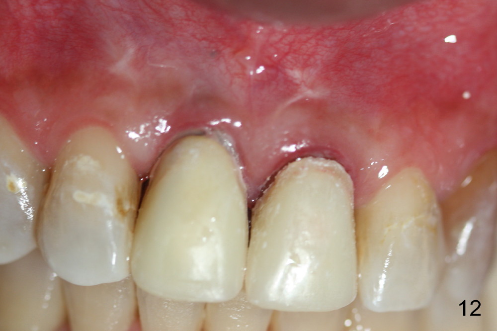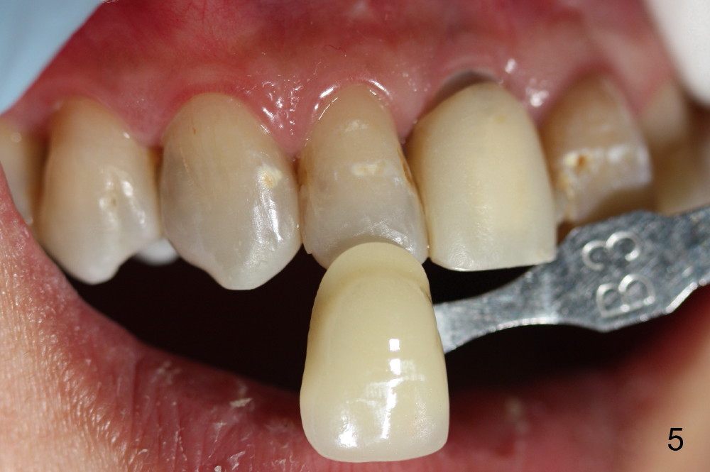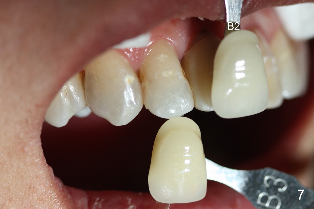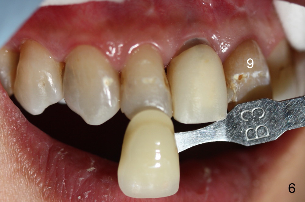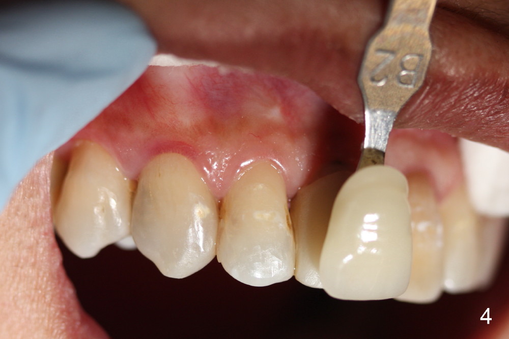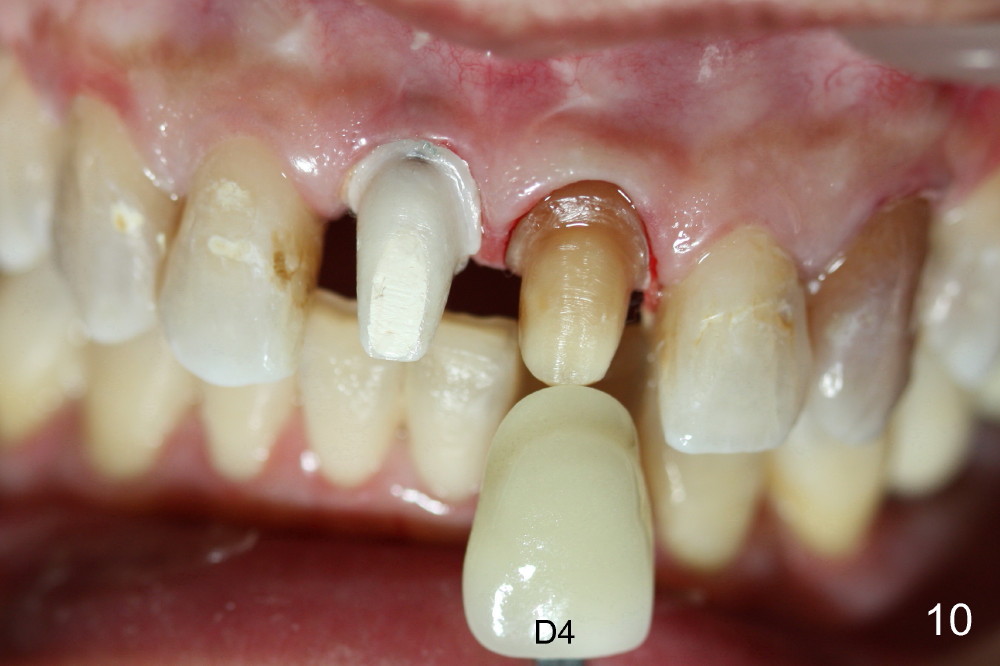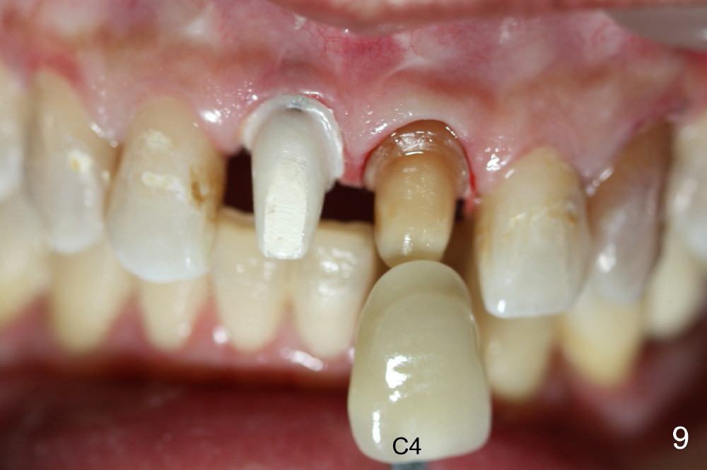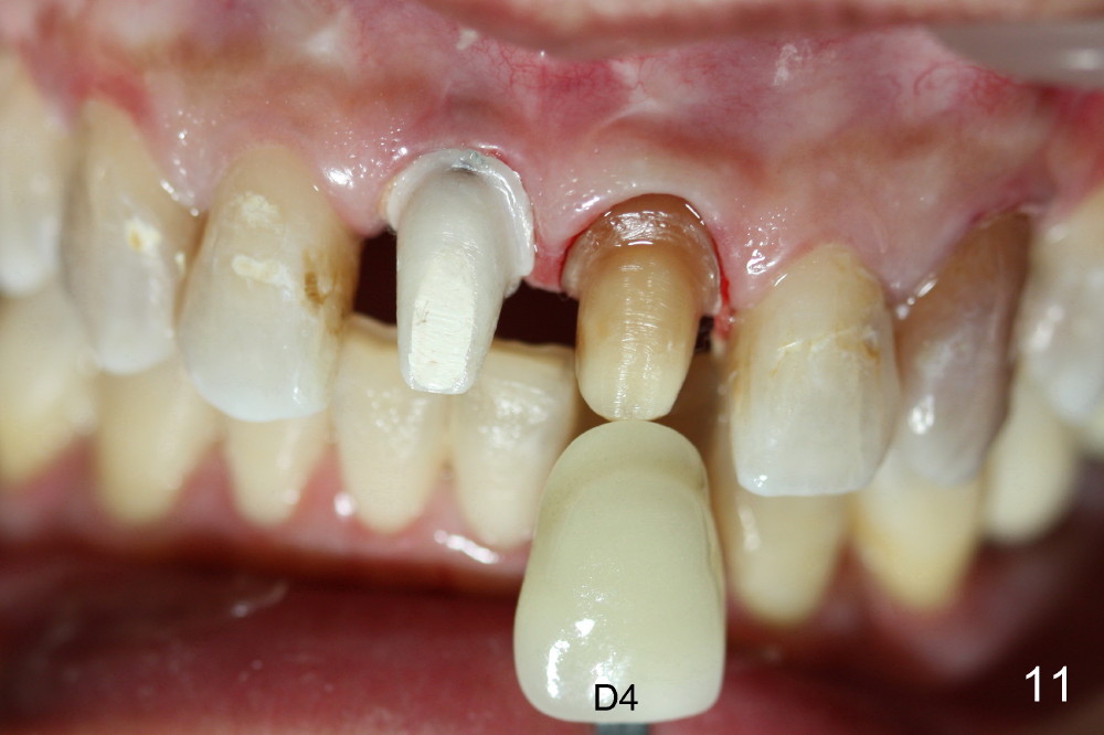 Shades B2, 3 are chosen before prep (Fig.4-7). After prep, shades A4, C4 and D4 are used as stump ones (Fig.8-11). Fig.12 shows new provisionals.