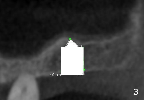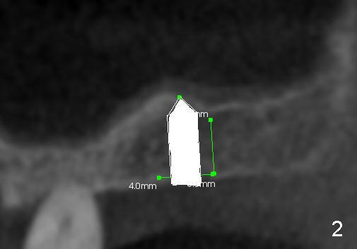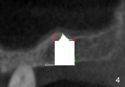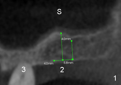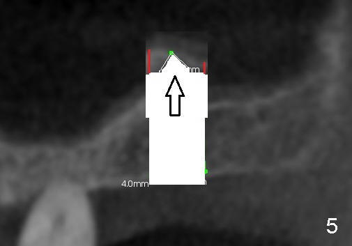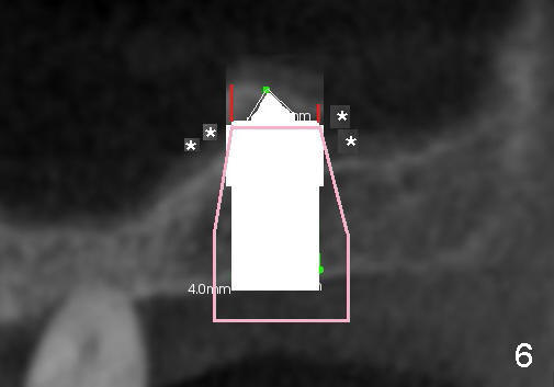 Fig.1 shows the sagittal section of the upper right posterior quadrant (3: #3 palatal root, 2: edentulous area to receive implant; S: sinus). The bone height is 5.8 mm. If the trephine bur with 4 mm outer diameter) does not engage into the bone easily, a 2.0 mm pilot drill is used to create initial osteotomy short of sinus floor (~4 mm deep). Osteotomy is increased by sequentially using 2.5, 3.0, 3.5 and 4.0 mm reamers (Fig.3). Bone shaving is saved. The last 1-2 mm of osteotomy (i.e., sinus floor) is prepared using 4 mm trephine bur (Fig.4 red lines). A flat end osteotome (4 mm in diameter, Bicon comprehensive kit) or tap is used to push the sinus floor upward gently and slowly (Fig.5 arrow). Use a small curet to separate the sinus membrane off the sinus floor lateral to the osteotomy. Put the saved autogenous bone graft back to the osteotomy. Push it upward with Bicon bone condenser. When an implant is placed (Fig.6 pink outline, e.g., 6x11 mm), the top is covered by the vital bone, whereas the side by the harvested bone (*, although the latter loses direct blood supply).