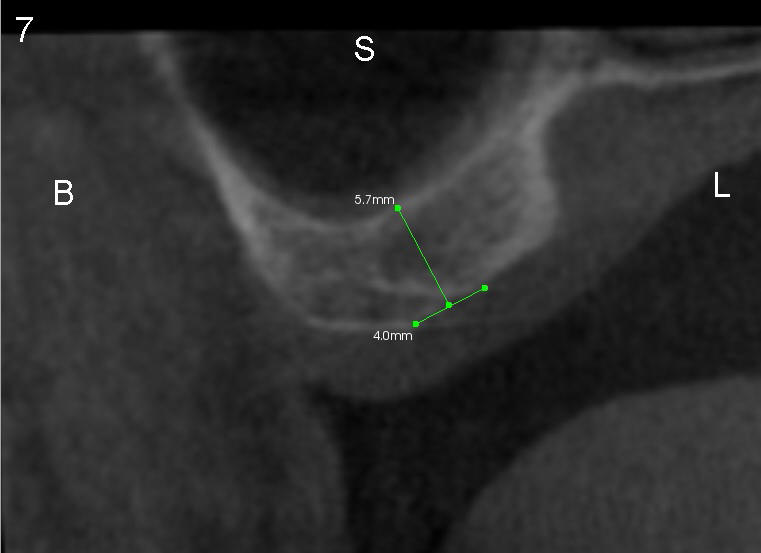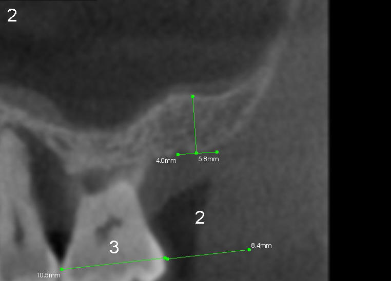 Calvin (at his 40s) has periodontitis and most likely bruxism. The tooth #2 has been lost for a while (Fig.1) with limited bone height (Fig.2 CT sagittal section, < 6mm).