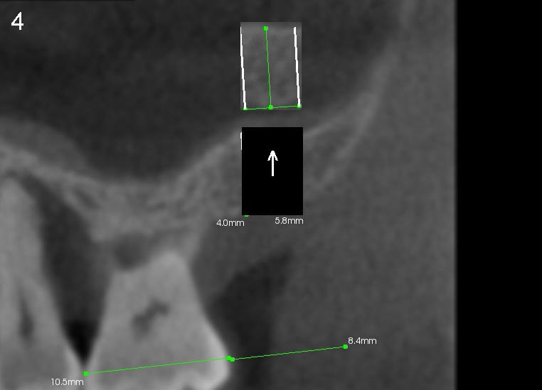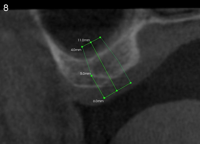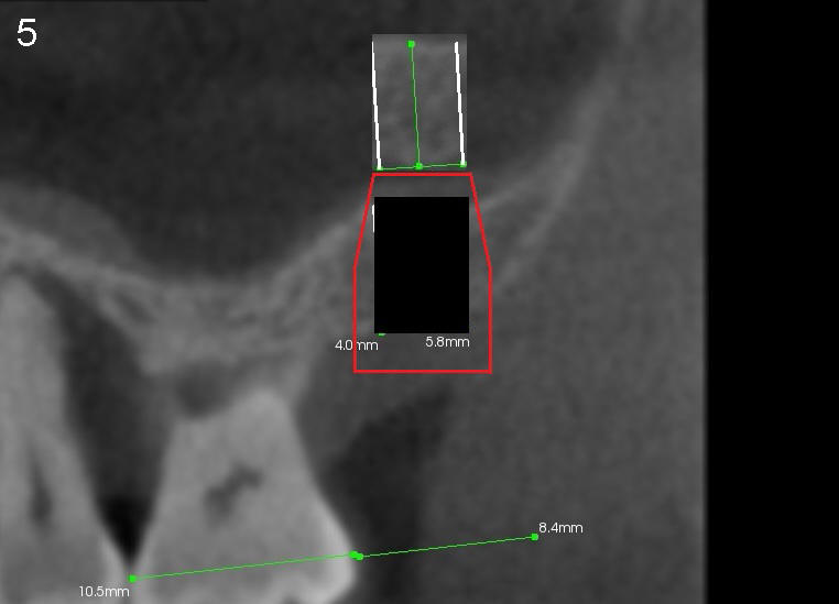 A trephine bur with outside diameter 4 mm will be used to create osteotomy and harvest the bone core (Fig.3; white lines). If the bone does not come out with the trephine bur, it will be pushed upward slowly and gently with a flat end osteotome or tap (Fig.4). When an implant is placed (Fig.5 red outline; 6x11 mm), it is covered by the vital bone above with blood supply coming from the sinus membrane.