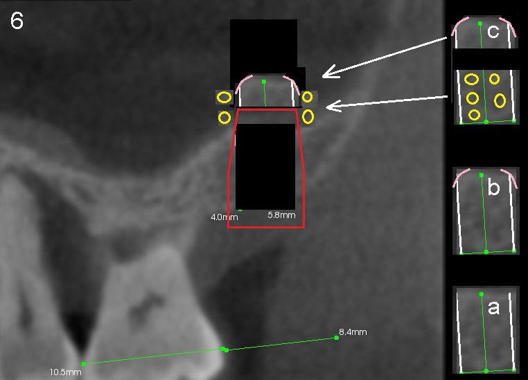 If the bone core comes out with the trephine bur (Fig.6a), the top corner will be trimmed (Fig.6b pink curved lines) so that it will not tear the sinus membrane when it returns as will be mentioned below. The bone core is to be sectioned as shown in Fig.6c. The top portion will be placed above the implant, while the lower portion will be ground into small pieces (yellow circles) with a bone mill and placed lateral (circumferentially) to the implant.