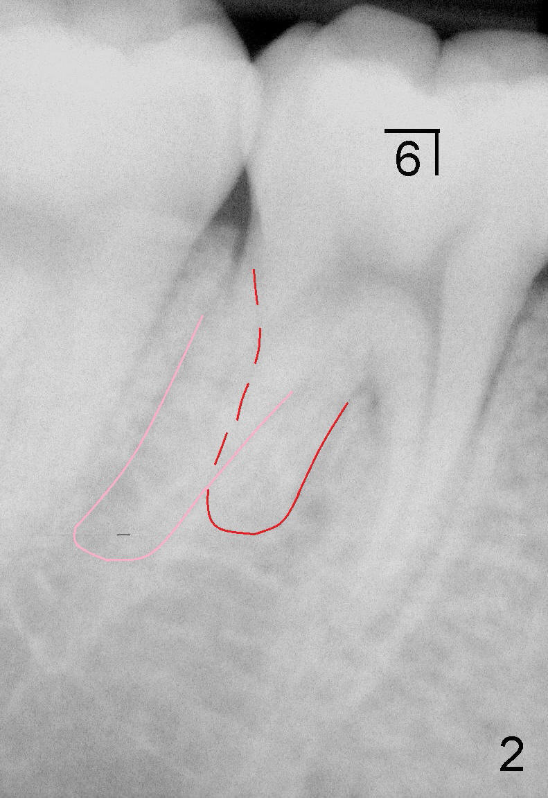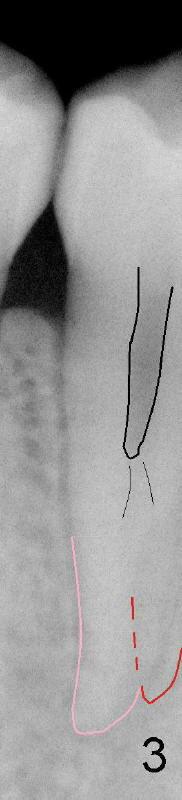 第一前磨牙也有两个牙根(图三),说明有两个根管。另外证据是上部根管(黑色轮廓)突然改变形态,好像分成两个根管(细线)。