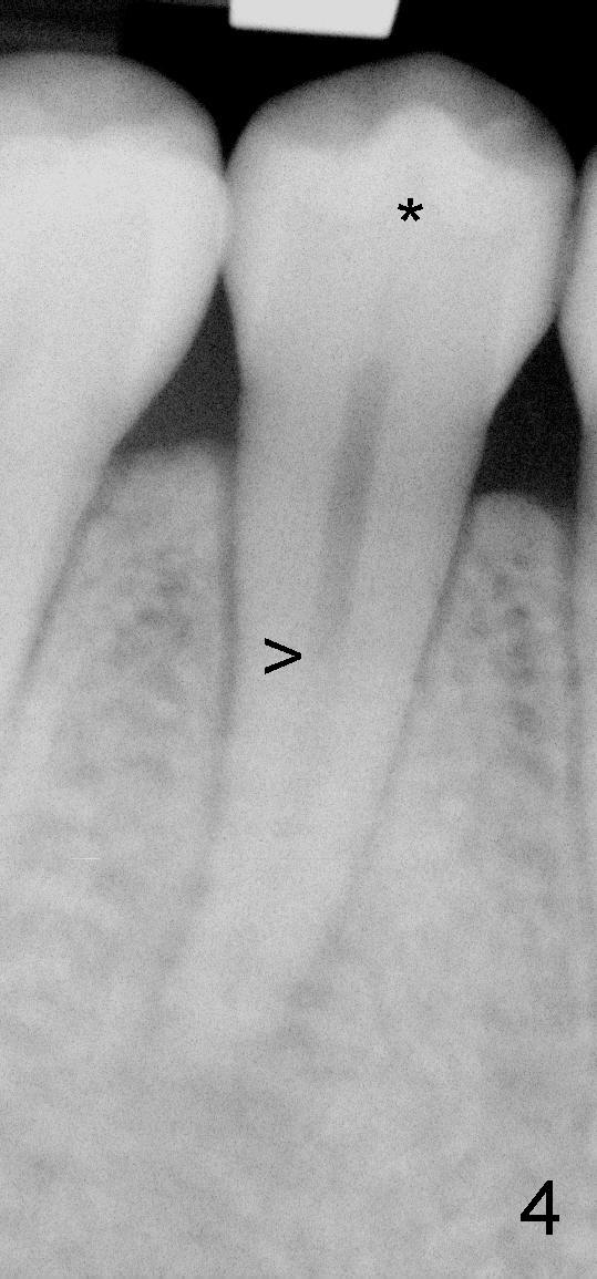 第二前磨牙根管也有突然变化(图四箭头,这么清晰似乎第一次遇见),所以这个牙齿有两个根管(颊侧,舌侧)。根尖阴影可能是因为中央牙尖断裂(*)造成的。