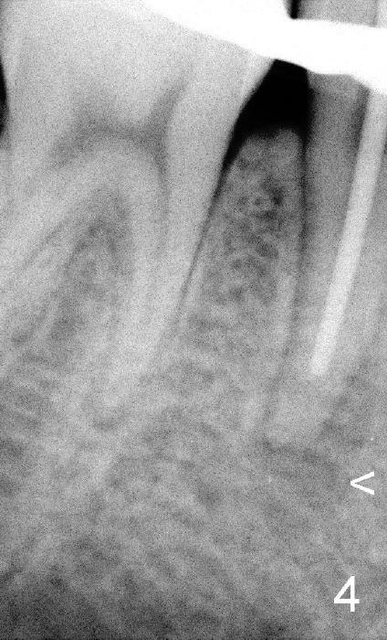 (WL),最后七十号牙胶尖插不到根尖(图四(箭头:根尖阴影)),而40/.06牙胶尖在有冲洗液下容易达到WL,接触(Binding)不够紧密,好像再大一号扩大针(四十五号)就达到不了WL。由于时间问题,使用AH26