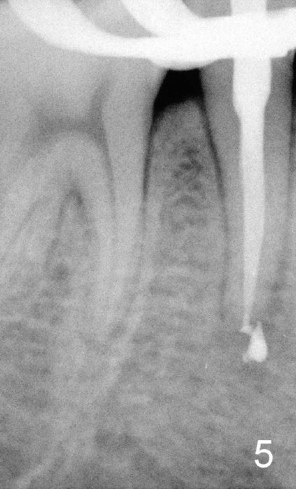 percha(各一根)完成充填(图五),最后树脂充填,不准备做牙冠,观察。