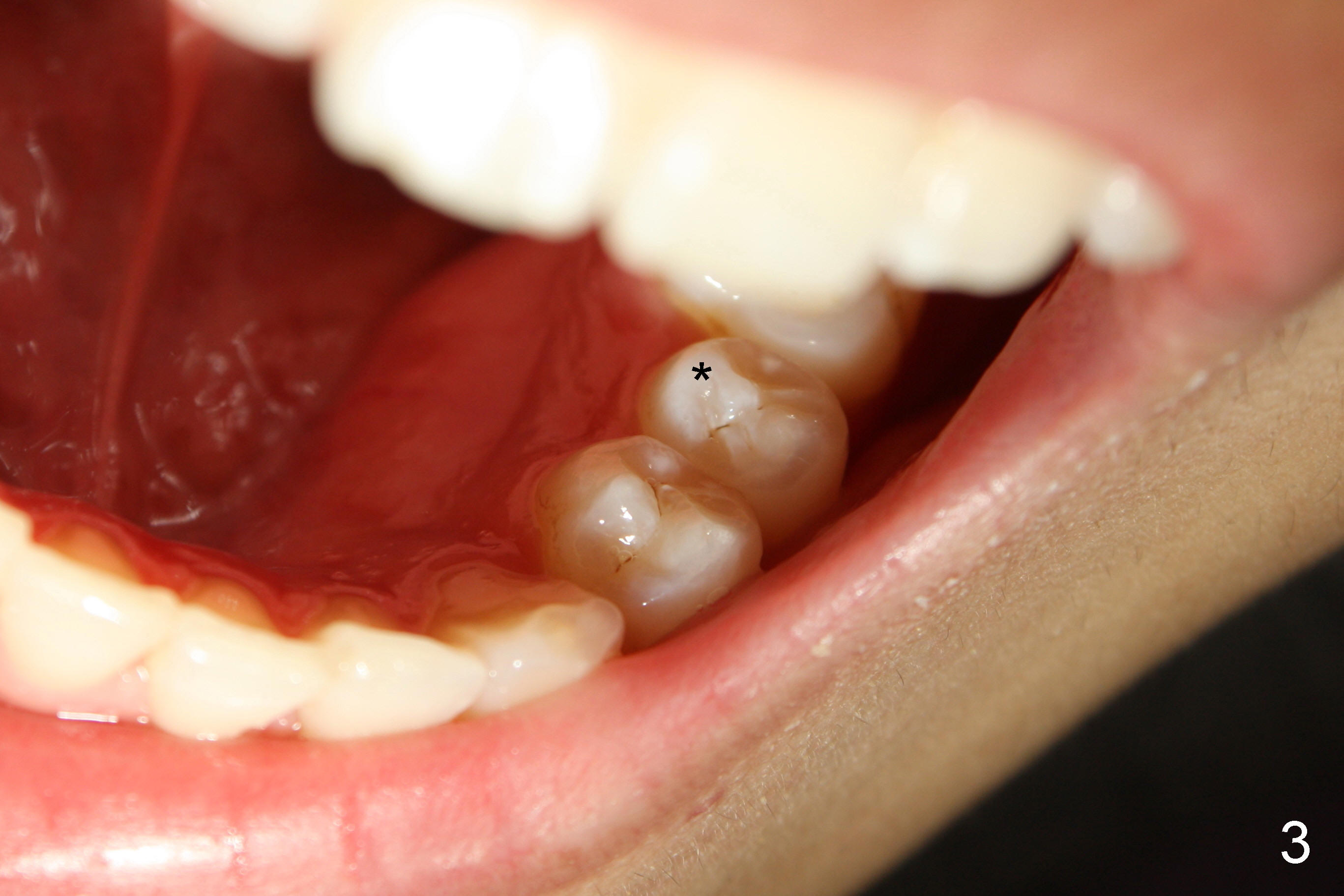 上集发表时,还没有见到病人,这集回答卢红医师疑问(下面)。今天病人来诊所诊治,他没有任何症状,右下五号牙根尖瘘道(图一箭头)是以前牙齿矫正医生发现的,咬合面中央隆起(图二箭头),后者中心好像有个小开口。对侧仿佛没有同样病变(图三*:左下五)。按照方柄忠大夫建议,根管治疗前做活力测试(Endo