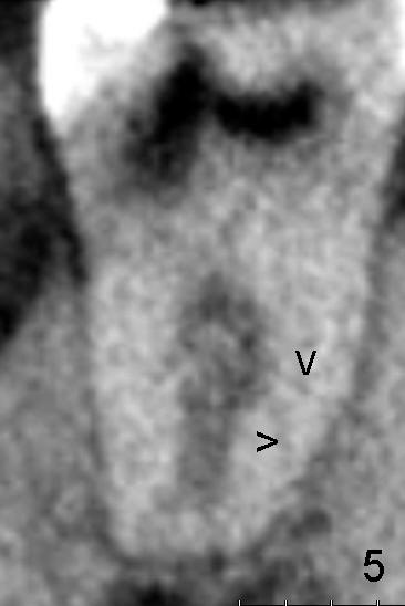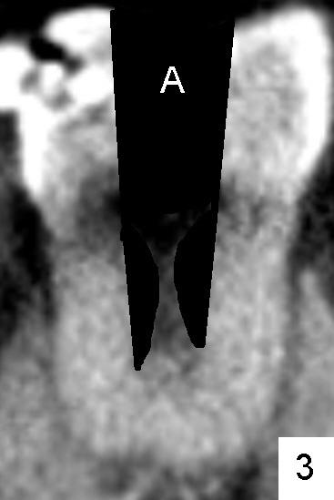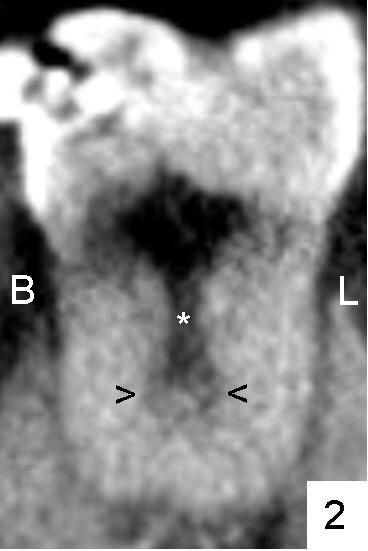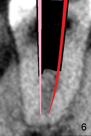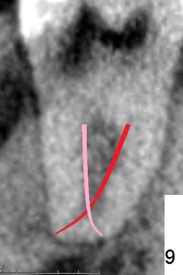 近中根上三分之一好像是单根(图二*以及图一左上),快到中三分之一根管一分为二(图二箭头:B颊侧,L舌侧;图四左上箭头),中三分之一近中舌侧根管仿佛有两个侧枝根管(图五箭头),尽管下三分之一根管又融合(图八*,图七左上横断面:单个扁根管),中三分之一近中两个根管必须分别清洗(图六红色粉红色:两个扩大针),之前应该扩大根管进口(图三A: access,与图二对比)。如果偷懒或者事先无知而遗留一个根管,往后处理并发症可麻烦。本例病人马上要到老美牙学院上学了。