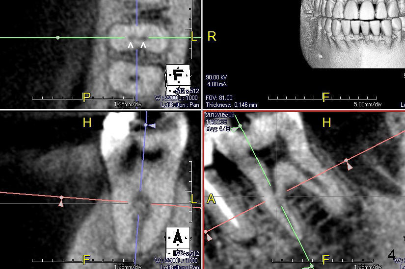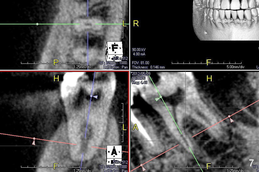 一两个月前三十三岁女士右下七号牙(#31)近中深龋做树脂修复,近来冷热痛,下周五她回诊所诊治。她牙齿问题较多,尤其是左上六缺失太久,植牙困难,所以拍摄CT。右下七号牙根管治疗前,研究CT根管解剖。图一,四,七是CT合成图像:右上角是三维图片(3D),右下显示七号牙矢状切面(S: sagittal),左上横断面(A: axial),左下冠状面(C: coronal),在每张CT合成图像中,粉红色,绿色以及蓝线代表其它断面切断平面。图一(左上角)中,M表示近中根, D远中根。图一,四,七分别代表近中根上,中,下三分之一断面分析。重点讨论冠状面(图二,五,八)。