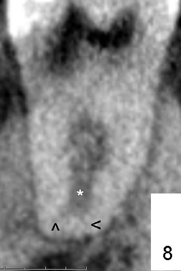 有两个疑问:第一,根尖三角区(delta; 图八)根管(*)似乎又分裂了(箭头),冲洗是不是要达到那里,扩大针是不是要交叉一下(图九)。