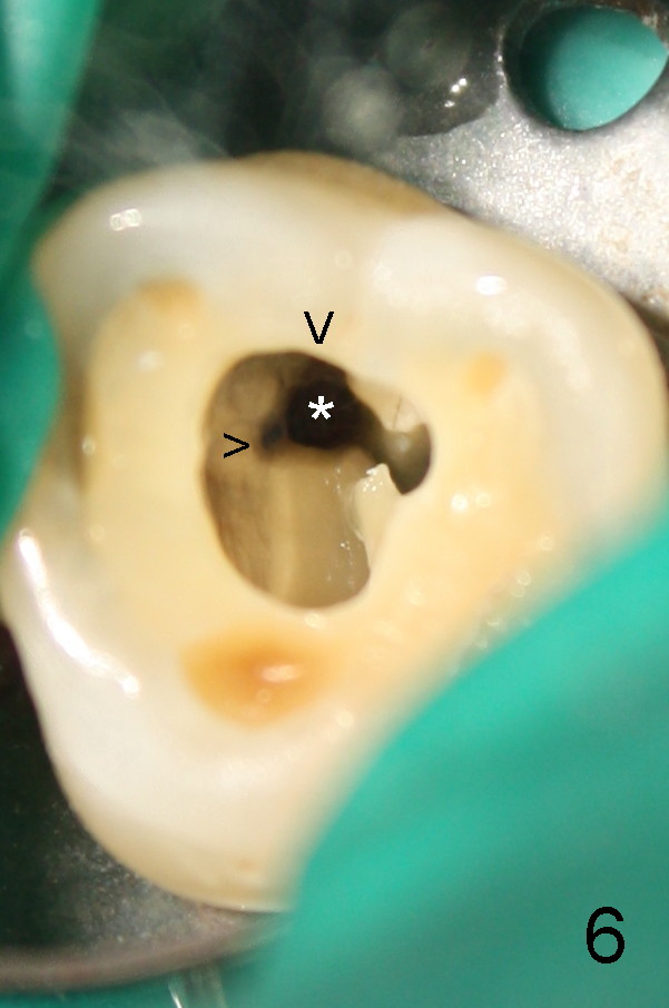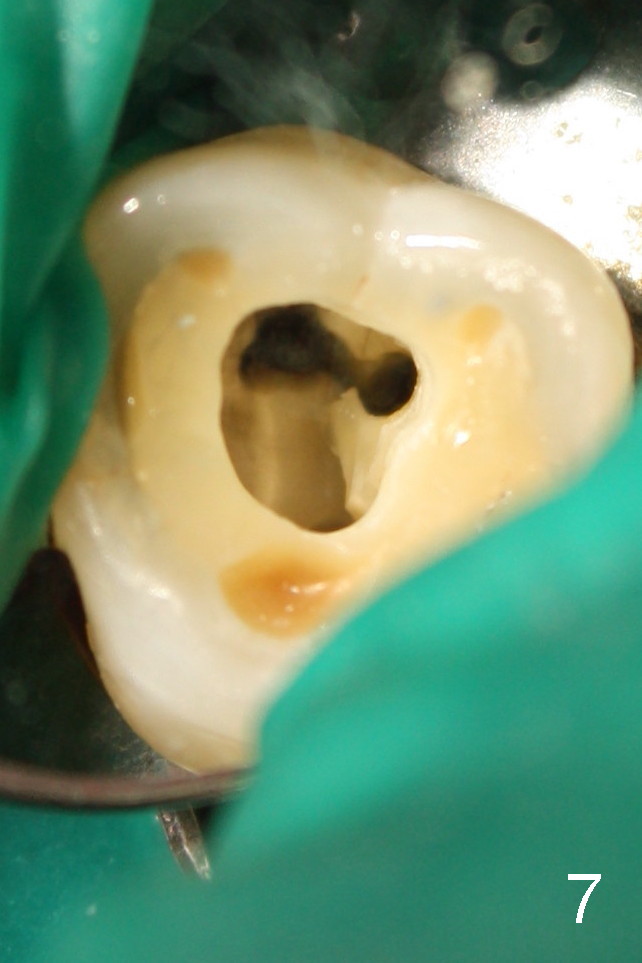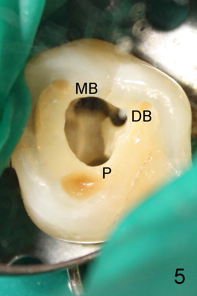 如果他还没有CT,我该怎么在没有外科显微镜下找遗留根管呢?MB和P根管口之间的确有一个沟(map),但是非常光滑(图五至图七),能找到根管口?还是往原来MB根管口颊侧探索?图三/图四暗示MB1还没有被发掘,对吗?MB2存在吗?