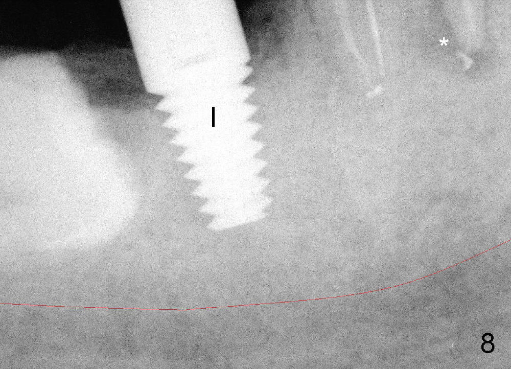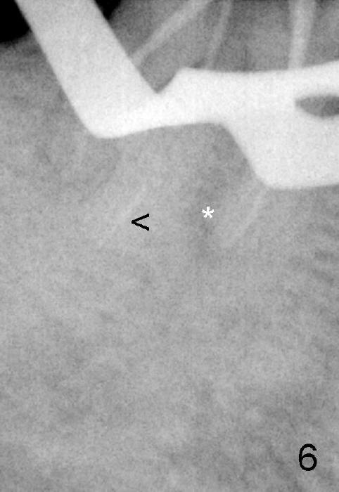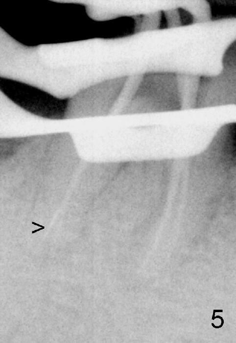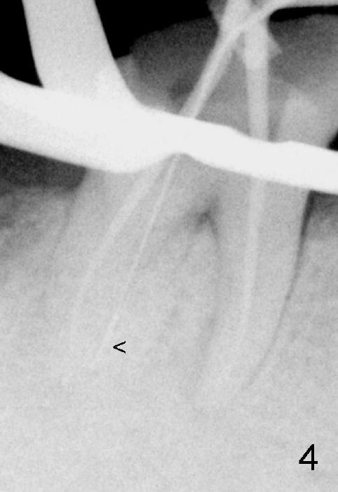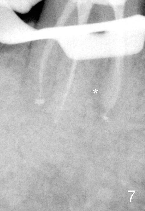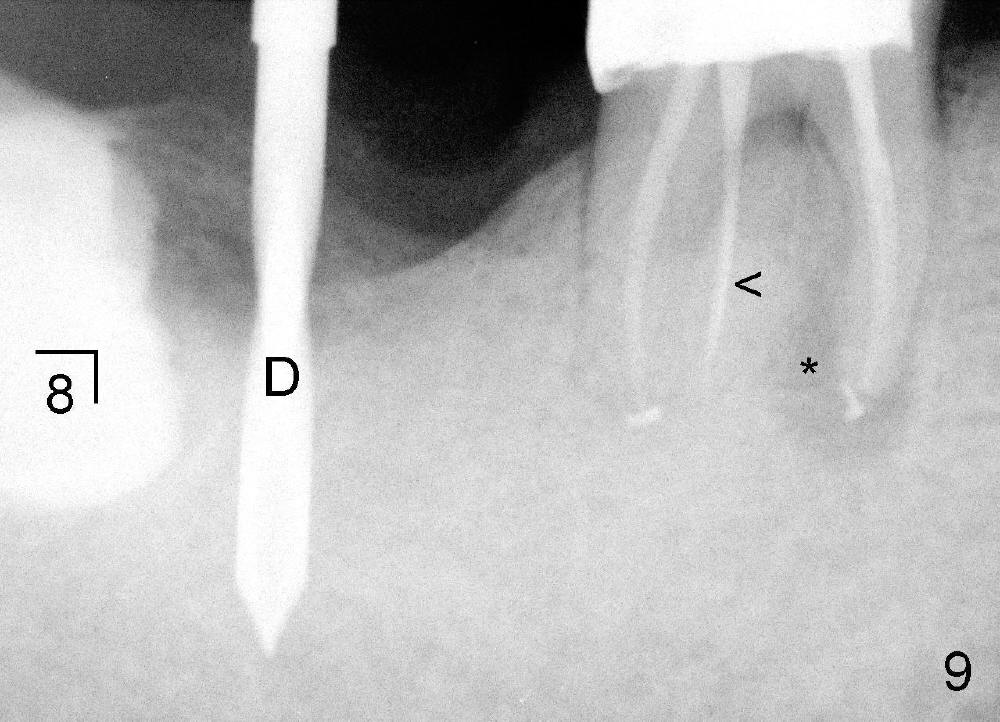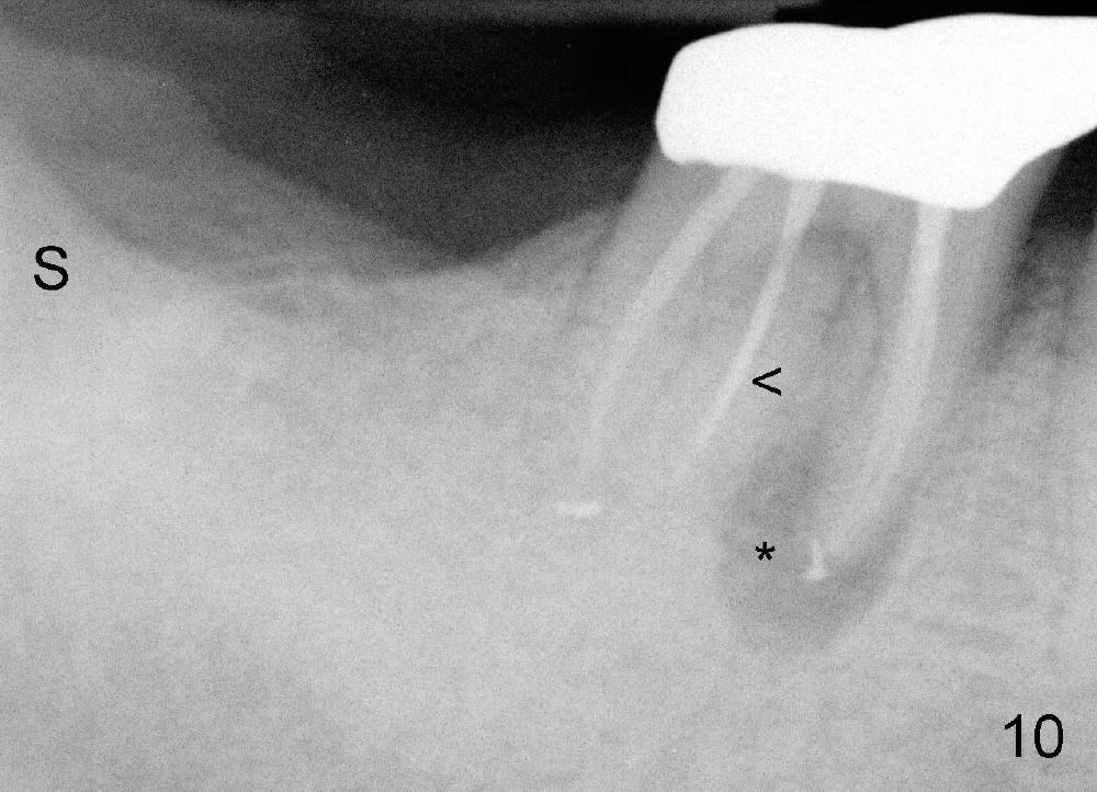 五十来岁郑先生缺失两个下颌第二磨牙,严重牙齿磨耗,三年前主诉右下第一磨牙冷热痛(可能与磨耗有关),近中有轻度根尖阴影(图一箭头),初步CT检查表明该牙齿有四个根管(图二,三),兴高采烈,这样不会错过远中舌侧根管(DL),开髓发现根管几乎阻塞,尤其是远中舌侧,hand files不容易进入根尖,使用20/.04 rotary file时,在根尖断裂(图四箭头,其余根管插入30/.06牙胶尖),一时不能bypass断针,暂封。十二天后,重新bypass断针,终于成功,但是取不出断针,扩大二十号hand file(远中舌侧根管),图五,图六侧方充填(lateral condensation)之前,图七之后(图六,七*:近中阴影)。根管治疗和牙冠之后一直无症状,一年半在第二磨牙处植牙(图八I),虽然第一磨牙近中根尖阴影增大(*),但离植牙还有一定距离,可能不会产生问题。不过不久植牙松动,病人自己取出,可能当时钻洞太大,而不够深(no primary stability),怕侵犯下颌神经(图八红线)。十个月后再次试图植牙(图九D:钻头),突然发现智齿(阻生)在手术视野之中,而且智齿咬合面不干净,结果取消植牙,把智齿拔除,这时病人第一磨牙仍没有症状,但是根尖阴影不可观(图九*),远中舌侧根尖好像没有病变(箭头)。大概这次智齿拔除也与左下智齿七拔除(左下第二磨牙植牙之前)一样不舒服,郑先生一直没有回来做右下第二磨牙植牙。上周六他终于登门,右下第一磨牙出现根尖脓肿症状(术后近三年),根尖片如图十。S代表已经愈合智齿牙槽窝,根尖阴影不小,断针根尖仍没有阴影。