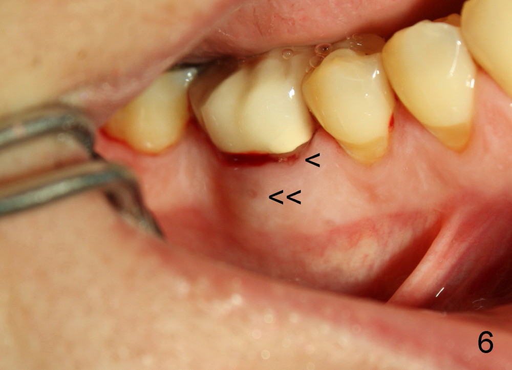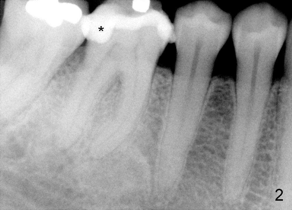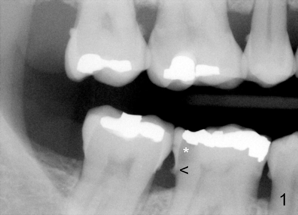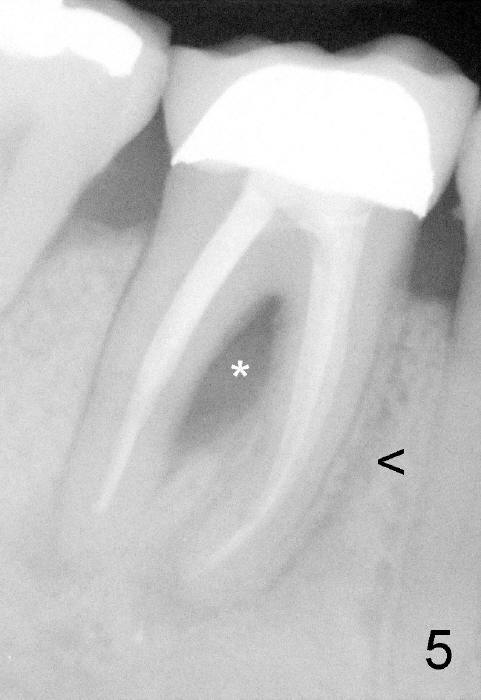 Dowman太太来自德国,收入不好,抽烟,不用牙线,结石多(图一箭头),右下第一磨牙远中龋齿(*)。她深洗还积极(图二已经没有明显结石),处理龋齿拖拖拉拉,九个月后,去龋时穿髓,暂封(图二*),她的后牙牙根特长,说明什么?下面回答。不得不做根管治疗(图三),图四是根管治疗后一年半拍摄,虽然根尖有阴影(箭头),但是病人没有任何症状。又过两年多病人主诉右下不适,根尖片显示根分叉阴影特大(图五*),近中根近中也有阴影(箭头),这时结石又出现。口内检查太容易了:右下第一磨牙颊侧有瘘道(图六双箭头),颊侧根分叉上皮附着失去(图六单箭头,也就是牙周袋深,探测出血),而舌侧根分叉牙周袋正常。总之,近中根有隐裂,接近颊侧,而远中根好像不容易出事,因为它比近中根粗。当我们为她牙齿惋惜时,老外比较爽快,说“It is not your fault. I love eating nuts. I grind my teeth at night. My night guard is too old to wear”。这段话可能说明为什么她后牙牙根长。