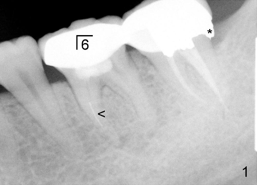 二十九岁辛小姐张口时左下颌骨疼痛要求治疗,出国前左下第一磨牙杀神经(图一),近中有断针(箭头),牙齿有扣痛,我们建议专科诊治,但是她不肯去。只好打肿脸孔充胖子,似乎从来没有处理过别人造成的断针,不知断针在颊侧还是舌侧。事先讨论过各种并发症,特别是TMD,根管治疗重做时间长,可能加重TMD,病人仿佛理解。心想最坏拔除植牙。