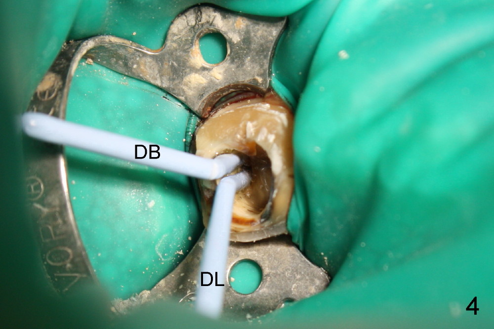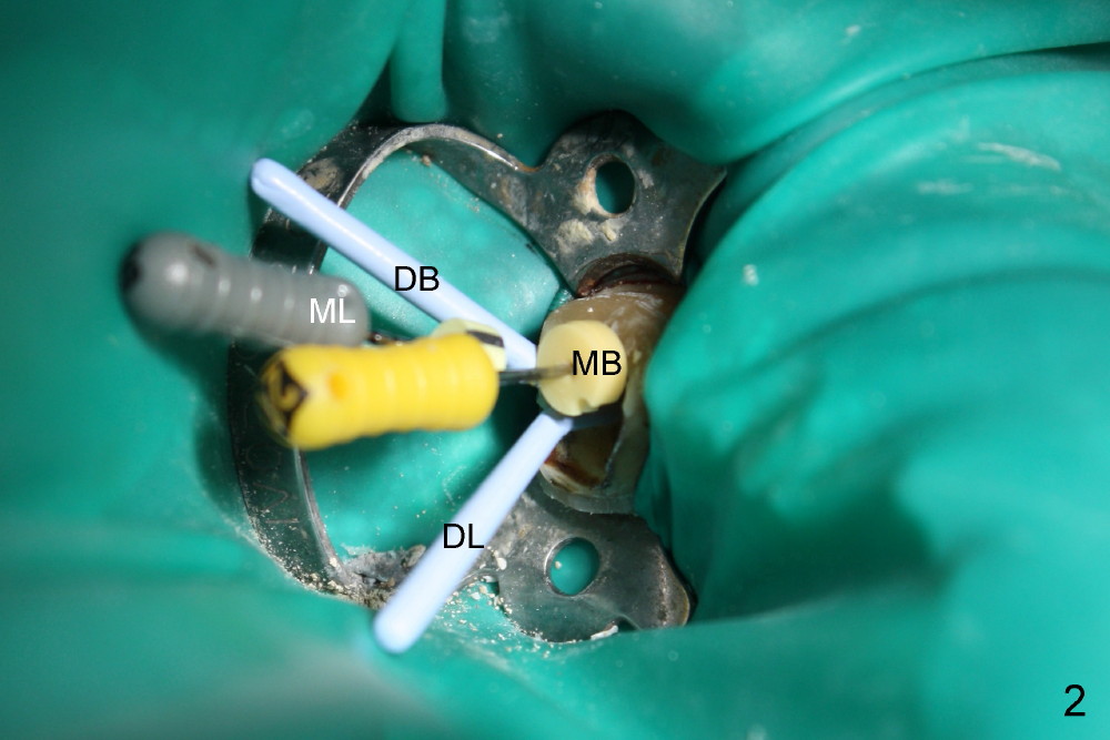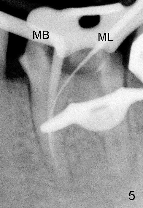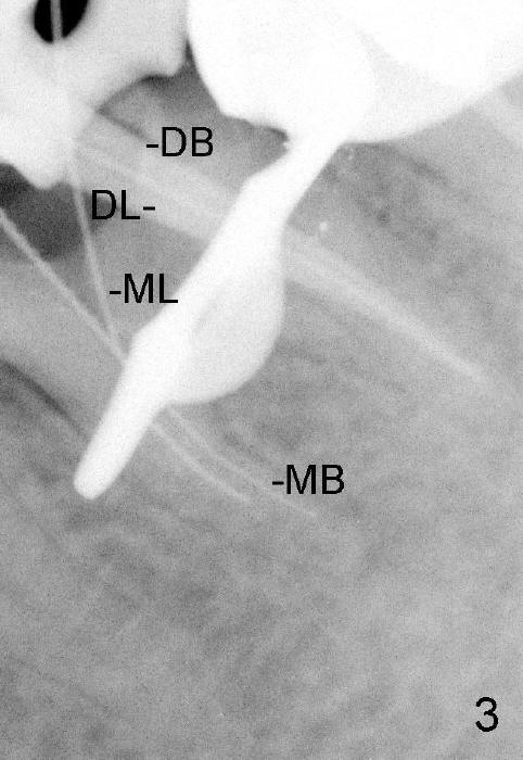 第一第二磨牙牙冠连在一起(图一;*:第二磨牙牙冠远中边缘坐在银汞充填物上),首先除去第一磨牙牙冠和冠髓腔松软充填物,后者有若干年久违丁香油气味,很容易找到远中颊舌侧(DB, DL)根管口,扩大也没什么问题(直到30/.06)。扩大针容易插入近中颊侧根管(MB),但是根尖三分之一有些阻塞,近中舌侧根管(ML)冠三分之一就阻塞,说明断针在舌侧根管,用Piezo超声波和diamond tip扩大近中舌侧根管口,也使用二号Gates-Glidden,然后使用C6, 8 扩大针慢慢地通过断针(bypass),最困难却是根尖三分之一阻塞部分(颊舌侧,尤其是舌侧),可能是断针原因。