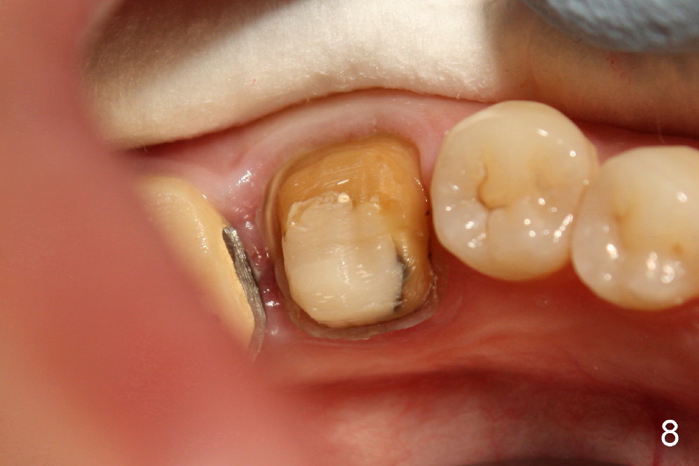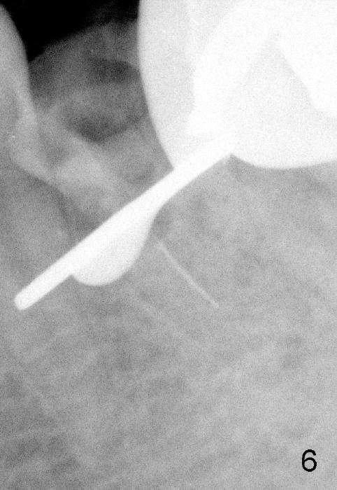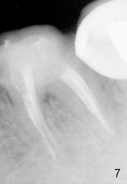近中根管扩大麻烦,只能慢慢来,逐渐失去working length,X光片证实(图五:MB:30/.06主牙胶尖; ML:十号扩大针),之后继续努力,向根尖进军。近中舌侧根管主要使用hand files,直到三十号,尽量往侧壁拉,让断针松弛,最后利索通过rotary file 30/.06一次,充填前再拍摄一张根尖片,希望无意中断针被冲洗出来(病人期待能把断针取出,她胆小,好不容易下定决心重做根管治疗),结果白日做梦,断针还在原处(图六),偶尔能取出自己造成断针,这次却不行,反正丑媳妇不怕见公婆,在二点五倍loops下,断针始终看不见。最后完成根管充填(四个根管都用30/.06主牙胶尖)和buildup(图七),充填好像不尽人意,这时精疲力竭,好在病人还感激,接着制作临时牙冠,打发病号。术后一两天病人还有些疼痛,只好观察,后来把她忘却。今天术后两周她突然回诊所,昨天把临时牙冠咬断(图八),我们重做临时牙冠,用永久性粘固粉,她准备明年做两个牙冠,想充分使用牙科保险钱。最振奋人心的是她张口痛完全消失,看样子术前没有TMD,虚惊一场。