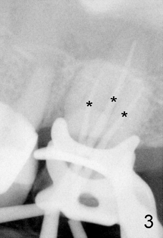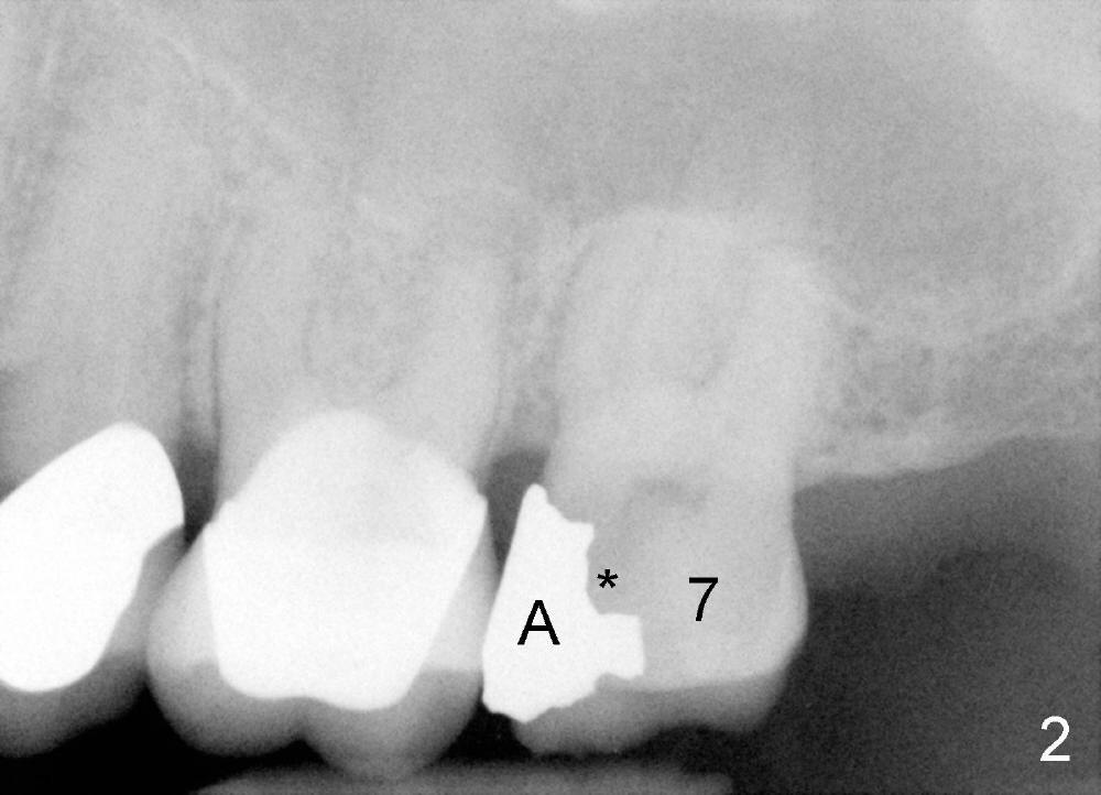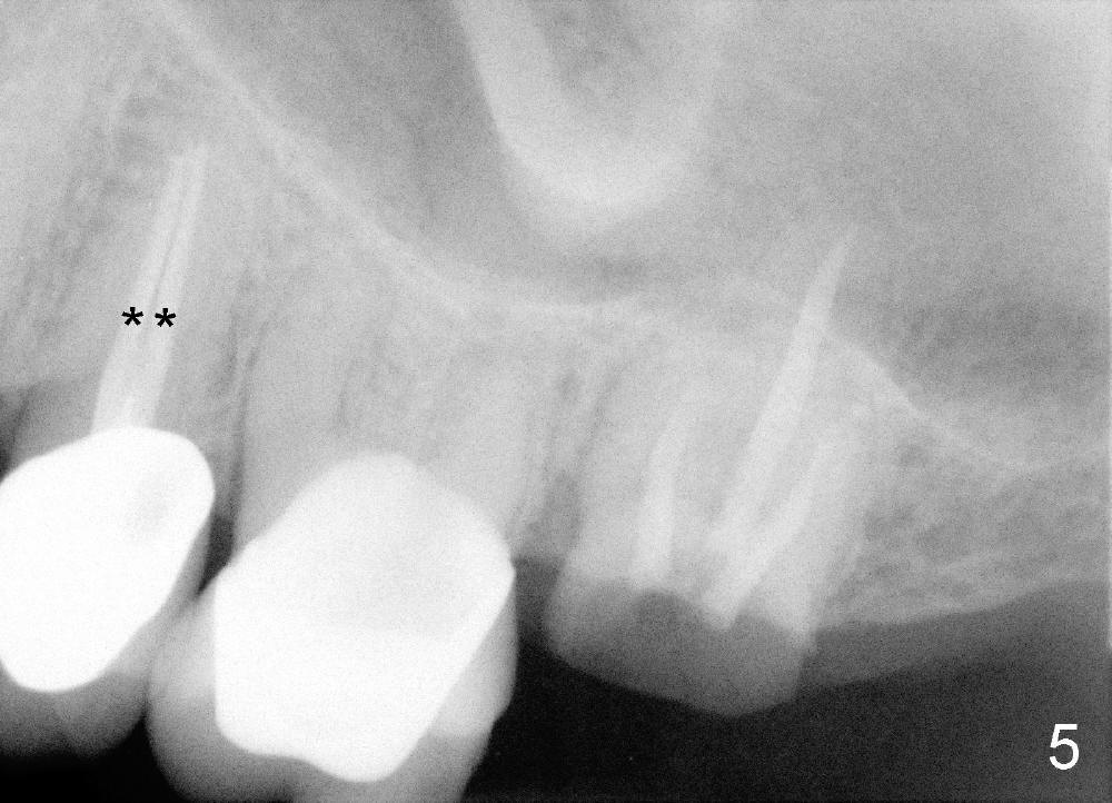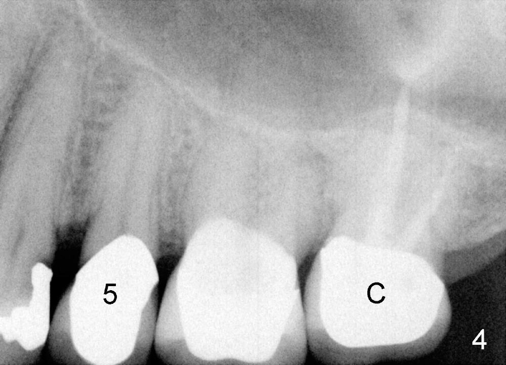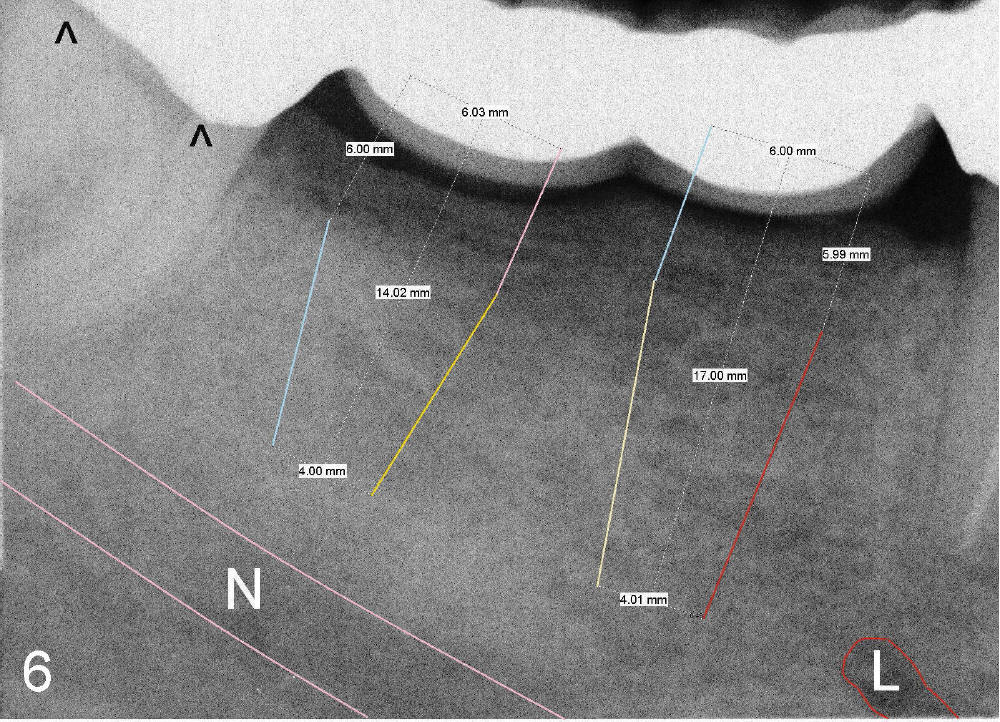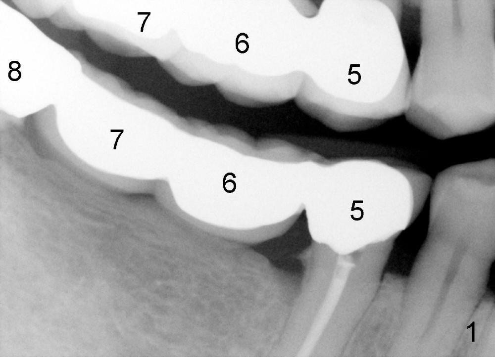 陈先生五十来岁,牙齿不好,右上有一个三个单位桥(图一:5-7),右下四个单位桥(5-8)。五年前他第一次来诊所时左上7有牙髓炎症状(图二),那颗牙齿有很大银汞充填物(A),之下出现龋齿(*)。出于救死护伤精神,开始做根管治疗(图三:*牙胶尖),当时他原来牙医出差了,之后给左上7戴上牙冠(图四:C)。其实图四X光片拍摄是在左上7根管治疗之后一年半,这次左上5有牙髓炎症状,再次为他做根管治疗(图五:*)。他又很久才回来:两年半,这次问题更严重:左上7断了(图五),好在他毫无怨言,可能与他是修理工有关,牙齿也需要修修补补。他也知道现在必须做植牙,这时我们非常自豪告诉他我们能做植牙,他便回家凑钱。一年半后他又从天降,左上问题还没有解决,右下8基牙在桥下出现龋齿(图六:^),必须拔除,这时右下6,7必须先做植牙(图六:植牙设计;N:下齿槽神经; L:颏神经襻(loop))。末端缺牙做活动义齿效果不好,据研究表明它只能恢复百分之十咀嚼功能,而植牙百分之百。