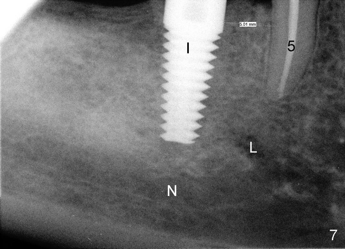 首先,在右下六号牙处植牙(图七:I),没有伤及下齿槽神经(N)或者颏神经襻(L)。回学术讨论园地