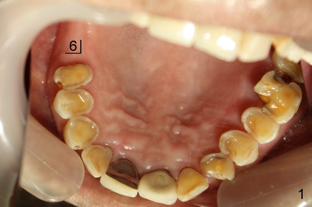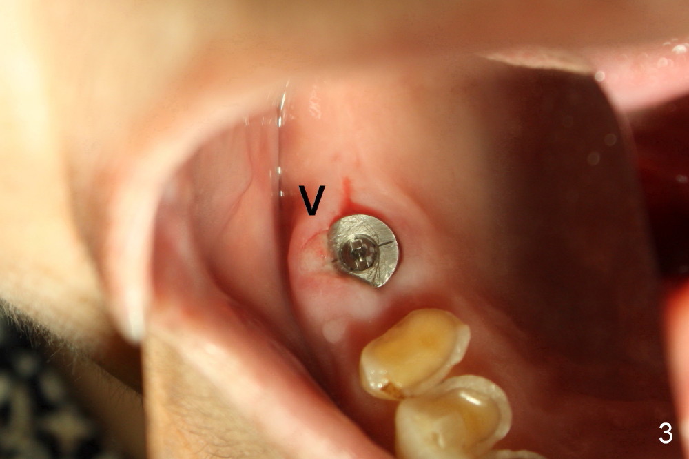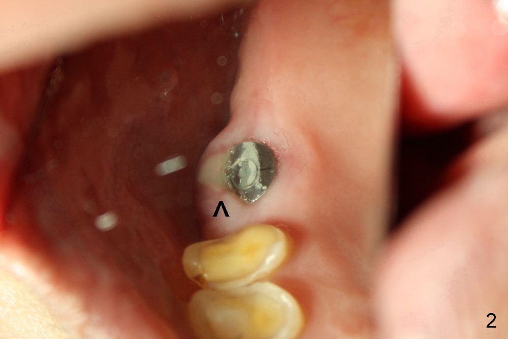陈太太八十三岁,患Parkinson disease多年,行动不便,刷牙更不行。三年前请一位植牙高手为她右上六号牙植牙(图一mirror image),尽管服用抗菌素,术后七天植牙处出现红肿,炎性分泌物(图二箭头),大量生理盐水冲洗后,伤口表面好看些(图三箭头),最终感染得到控制。