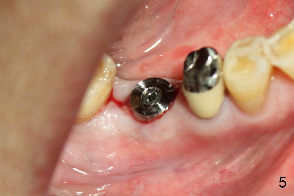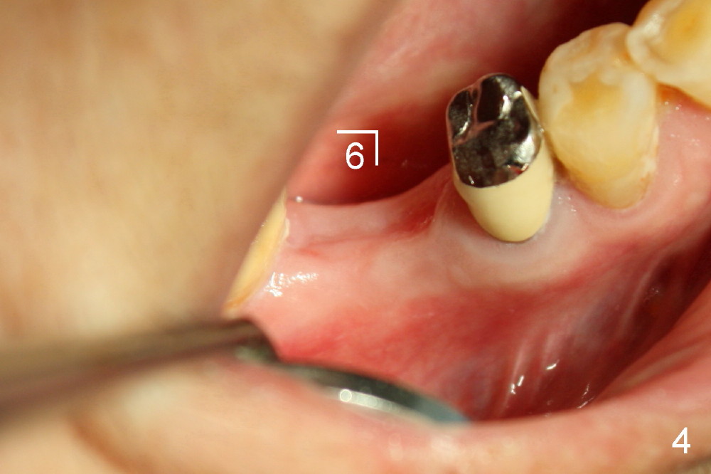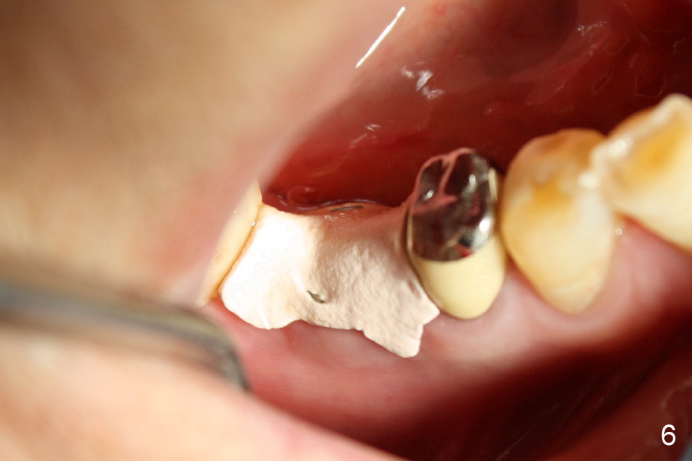几个月前右下六根尖周炎,根管治疗无效,Amoxicillin引起全身过敏性皮炎,最后拔除。术后六周伤口愈合,牙槽骨有些吸收(图四),通过骨扩张,植入6x17mm植牙(图五,牙槽骨好像不再萎缩了,与图四相比),伤口挺密合,不需要缝线,但是不是天衣无缝,细菌食物还是会进入伤口造成感染。服用抗生素好像不是个好主意(过敏史),灵机一动:使用periodontal dressing盖住植牙(图六)。但是术后病人抱怨局部肿痛,最后还是服用灭滴灵。术后第九天,患者回诊所左上七牙冠粘固,顺便拆除右下periodontal dressing(图六),dressing下面伤口愈合了吗?还是象图二那么糟(婚纱后面新娘漂亮吗)?
