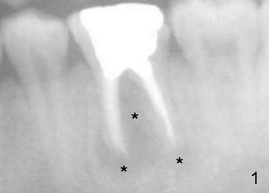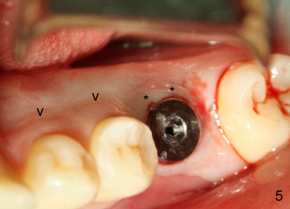 小张,男,22岁,大学刚毕业,忙于找工作,治疗不够积极,左下第一磨牙根管治疗失败,根尖,根分叉阴影(图一*),好像即刻植牙不太合适,建议拔牙后四周,六周之间回来植牙。但是他很拖拉,三个月才回来让我们看看,骨头似乎愈合不错(图二),他又消失五个月,最后还是登门,骨质仿佛继续形成(图三),植入六乘十七毫米植牙(图四,五),舌侧牙龈马上形成cuff(图五**),好像attached gingiva,与邻牙一致(箭头)。您能猜为什么植牙舌侧形成牙龈cuff?