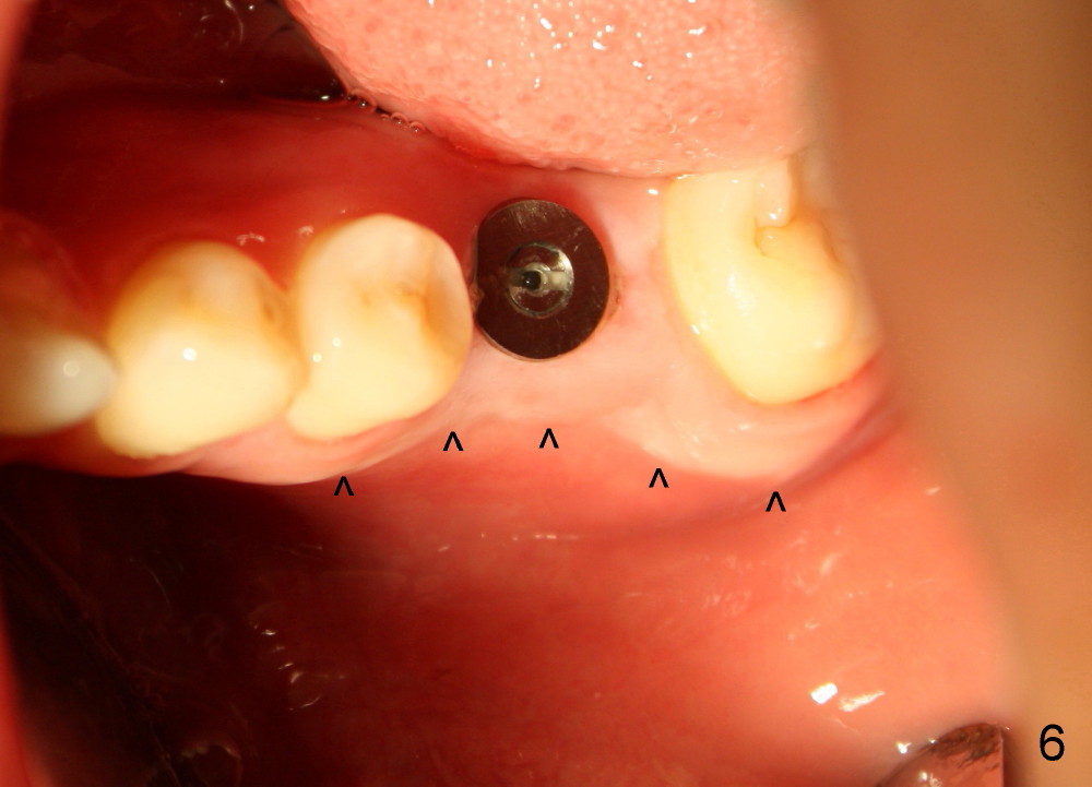 图六是术后十天拍摄,它显示颊侧骨板明显萎缩(箭头),这可能拔牙后形成。由于颊侧骨板萎缩,植牙偏向舌侧,给舌侧牙龈施加压力,便形成牙龈cuff。