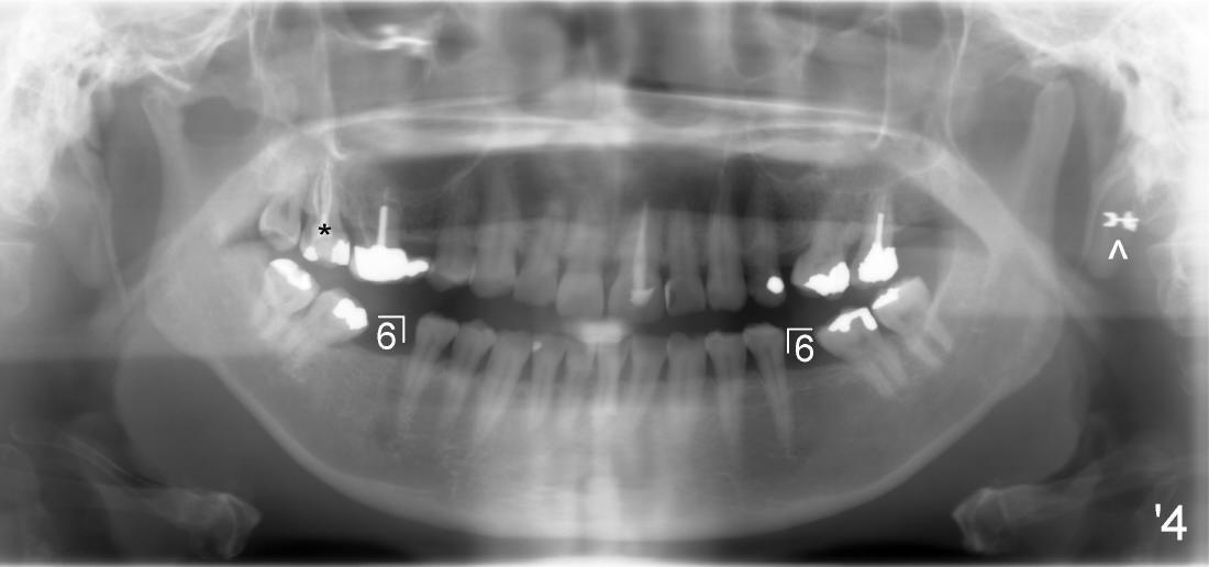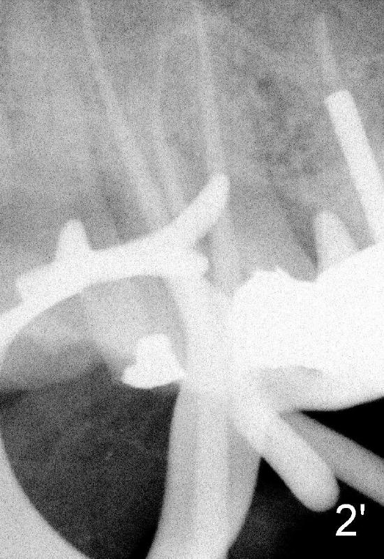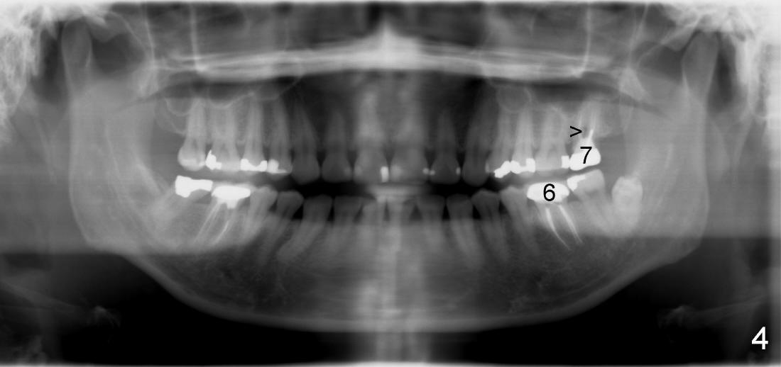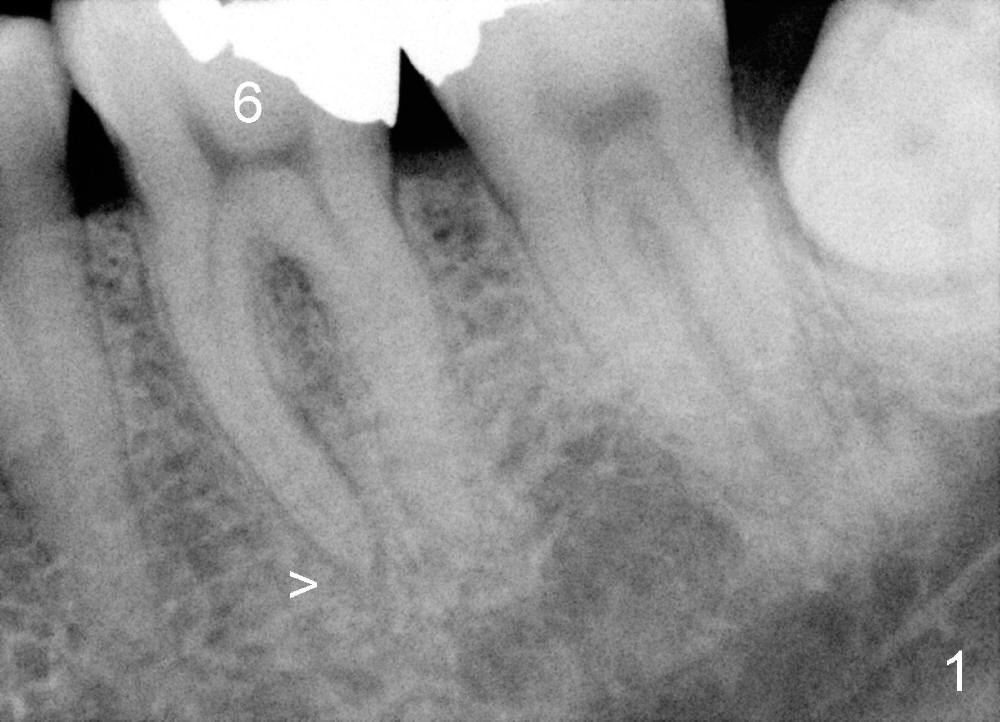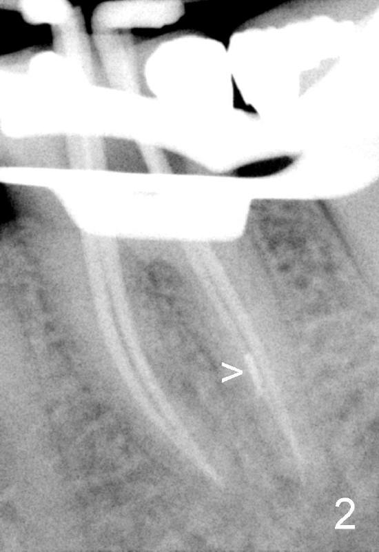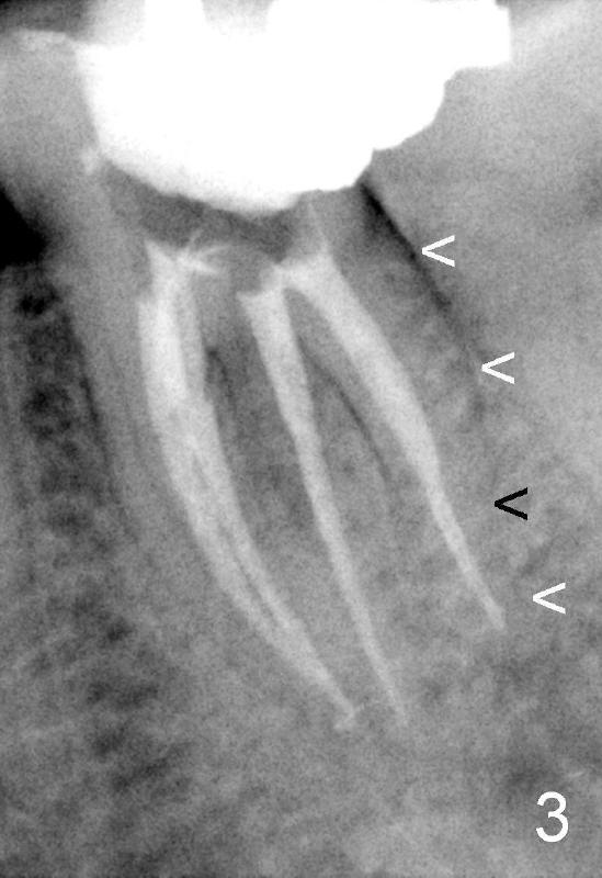 其实本文题目是如何让植牙病人找上门。冯女士四十二岁,四五年前因左下六牙痛第一次登门就诊,X光片显示牙根很长(图一),近中根根尖有阴影(>),那根牙根弯曲,总之,稀里糊涂开始根管治疗,结果有四根根管(图二),又长又弯,远中舌侧根断针(>),但是重新通过,辛辛苦苦完成根管治疗时才发现远中舌侧根弯弯曲曲(图三箭头,黑色箭头指向原来断针)。这些年来这颗牙齿没问题,但是左上七号牙老是发炎,全景片表明那颗牙齿根分叉处有阴影(图四箭头),一直劝她拔牙,植牙,上个月她终于同意拔牙,准备年底植牙。只有认认真真为病人解决痛苦,才能赢得他们信任,一旦他们需要进一步治疗,也会乐意开口。根管治疗做起来吃力,但是最能显示赤胆忠心。做好根管治疗是开展植牙第一步,愿意保留牙齿的人,视牙如金,如果我们尽力而保留不了,他们还是愿意更上一层楼;轻易拔牙的病人很少后来回来做植牙。