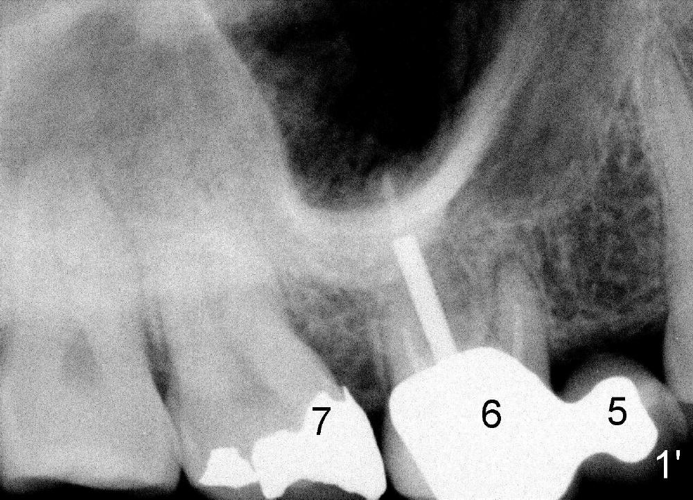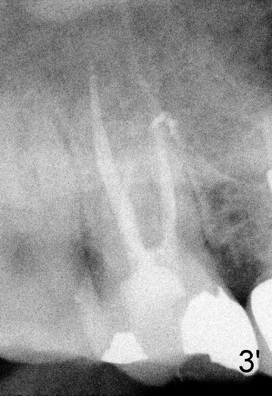 五十一岁Junita牙齿不好,右上有一个悬臂桥(图一’:5.6),她要找一位医生能解决她所有的牙科问题:右上7牙髓炎(图一’),右下,左下6植牙(图’四)。她最大问题是害怕牙科治疗,根管治疗中不太配合:牙胶尖插入后拍摄X光片,位置不对,没有显示根尖(图二’),最后根管充填效果尚可(图三’),疼痛没有了,病人的心被我们收买了,接着我们准备分期给右下,左下6植牙,但是她坚决反对,要求一次完成两个植牙,因为她非常怕痛,对钻耳环洞都害怕极了,做了一个耳环(图’四:箭头),再没有勇气回去做第二个。好了,明天做二个植牙,到时向大家汇报。这位胆小病人上战场时胆怯了,迟到一会儿,说她不愿意左右各做一个植牙,影响吃饭。由于右下近远中间隙比左下大些,我们先做右下植牙,回学术讨论园地