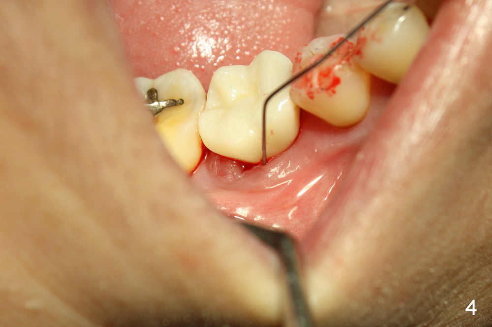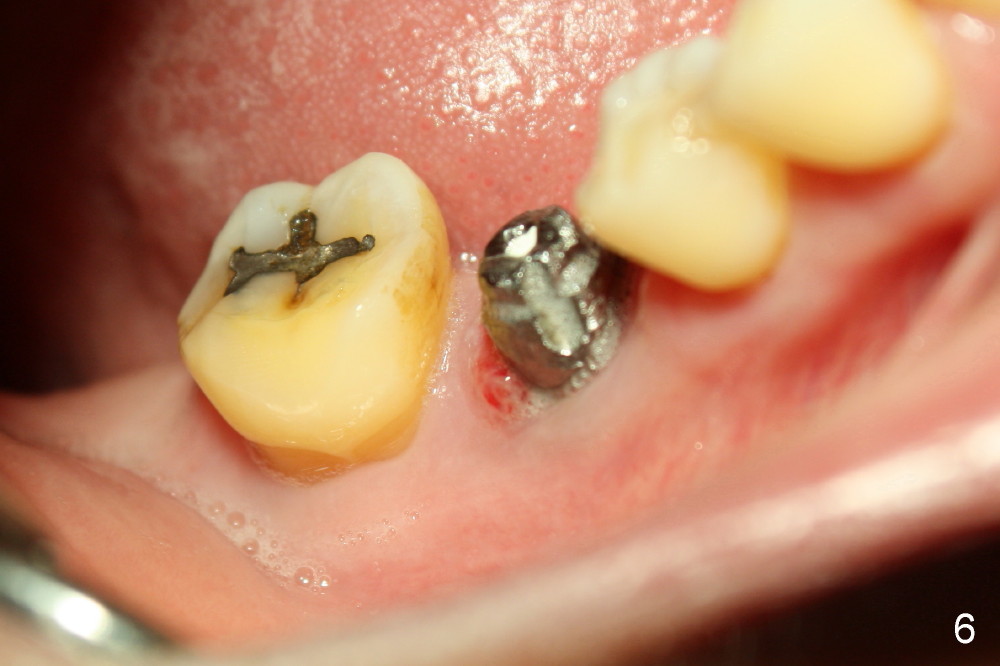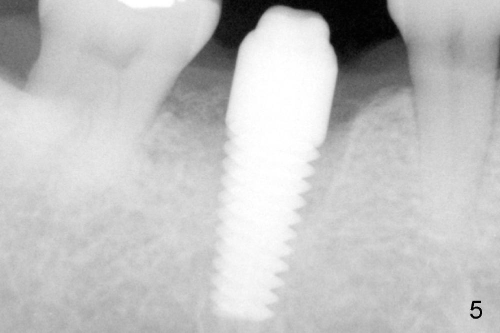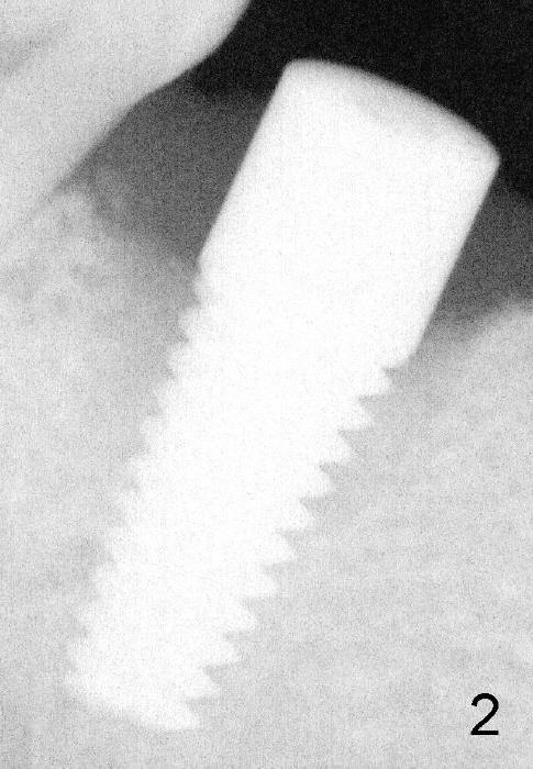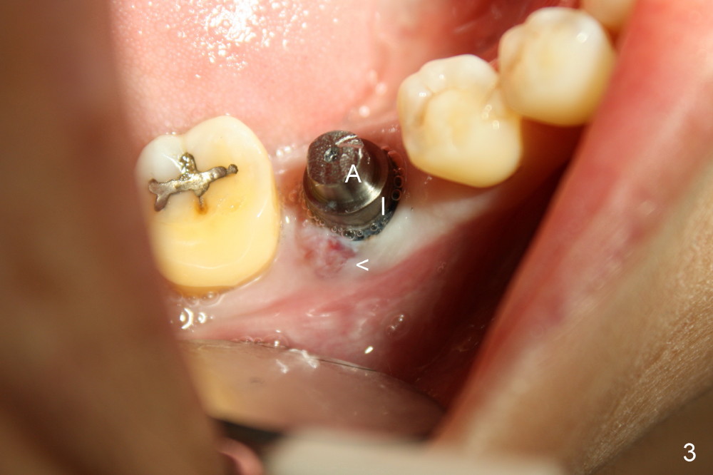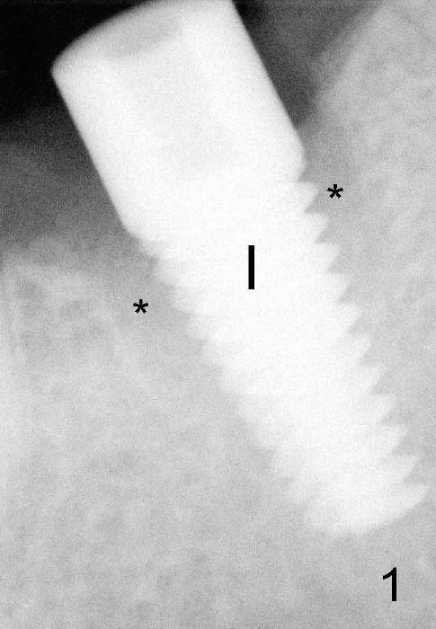 A gingiva-level implant (Fig.1 I) is placed immediately in the extraction site of the tooth #30 (*: remaining mesial and distal sockets after implantation). There appears to be no bone growth in the sockets 4 month postop (Fig.2), although the implant is stable. Clinically there is sign of infection (Fig.3 <) distobuccal to the implant (I). Since the patient is asymptomatic, it feels that the infection may resolve by itself. The abutment (A) is placed and impression is taken. Fourteen days later, the infection remains (Fig.4) after seating the permanent crown.