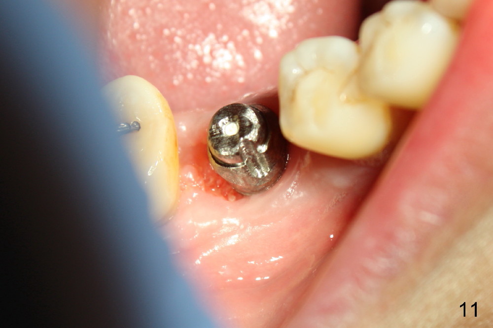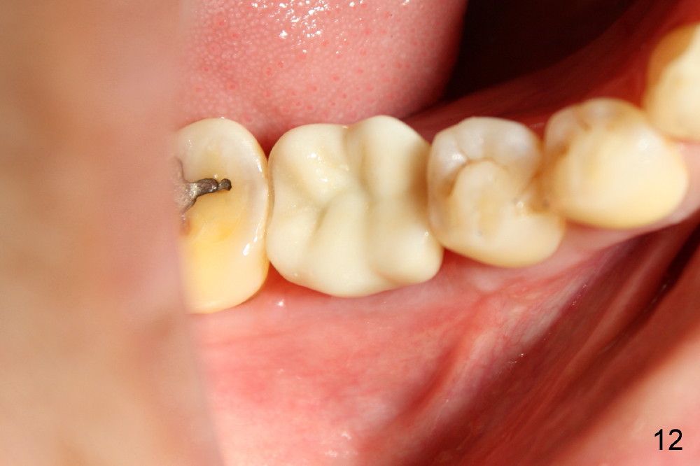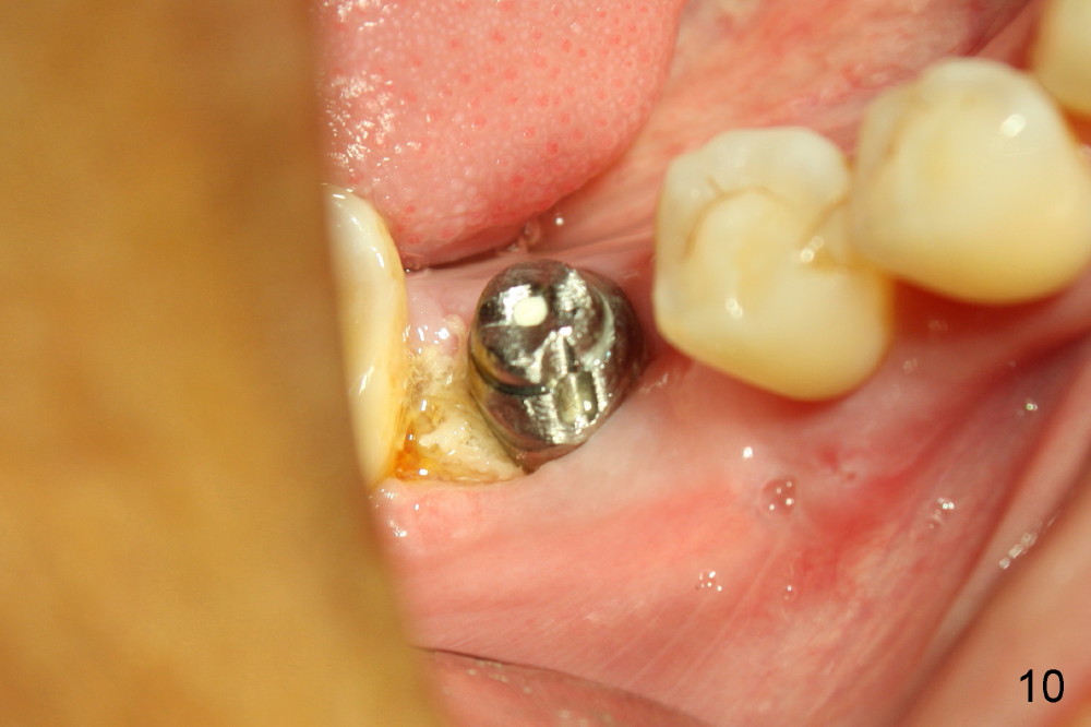 The infection may be related to chronic infection at the tooth #9. The latter is extracted, but the infection at the site of #30 does not resolve (Fig.5,6). The buccal flap is raised to reveal granulation tissue distobuccal to the implant (Fig.7). Bony defect and implant thread exposure are shown after debridement (Fig.8). Irradiated cancellous bone graft is placed to the defect (Fig. 9, Rocky Mountain Tissue Bank). The flap is closed with relative tension free. The definitive crown is temporarily cemented. The graft is exposed with no infection 2 week post grafting (Fig.10). The distobuccal defect appears to have healed 5 months post grafting (Fig.11) and the crown is permanently cemented (Fig.12). There is no buccal bone resorption, probably associated with immediate implantation. The patient remains asymptomatic 13 months postop.
