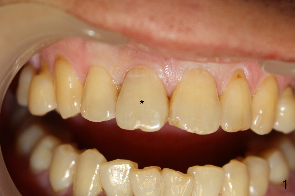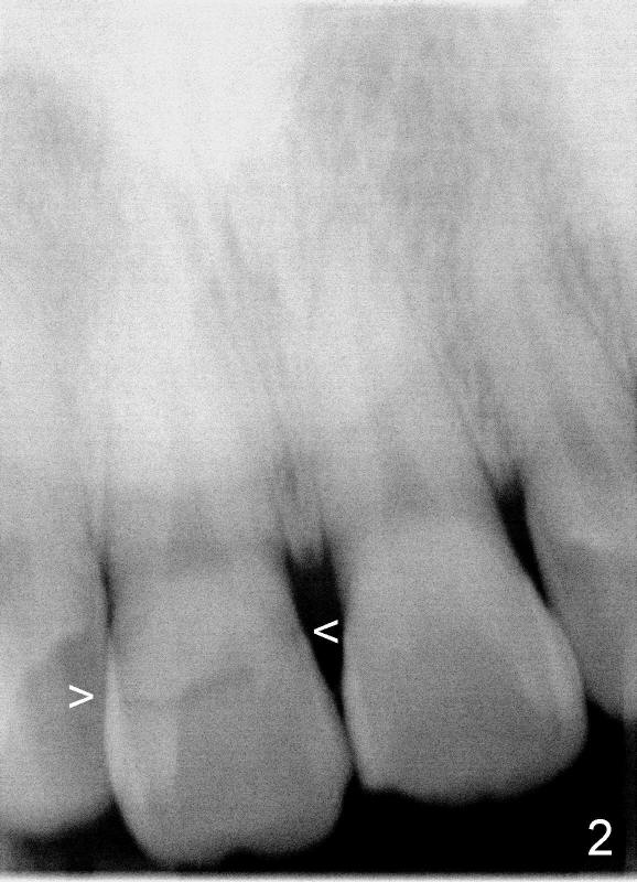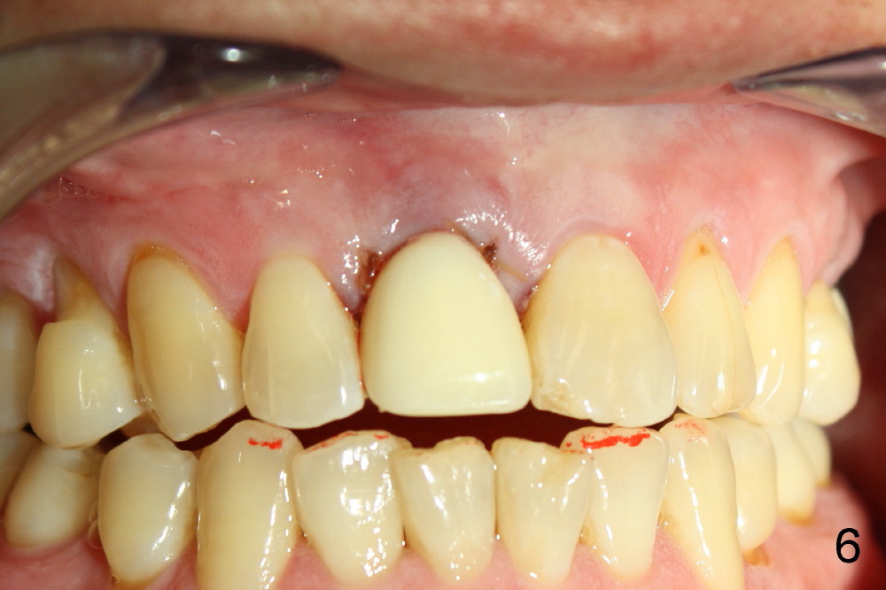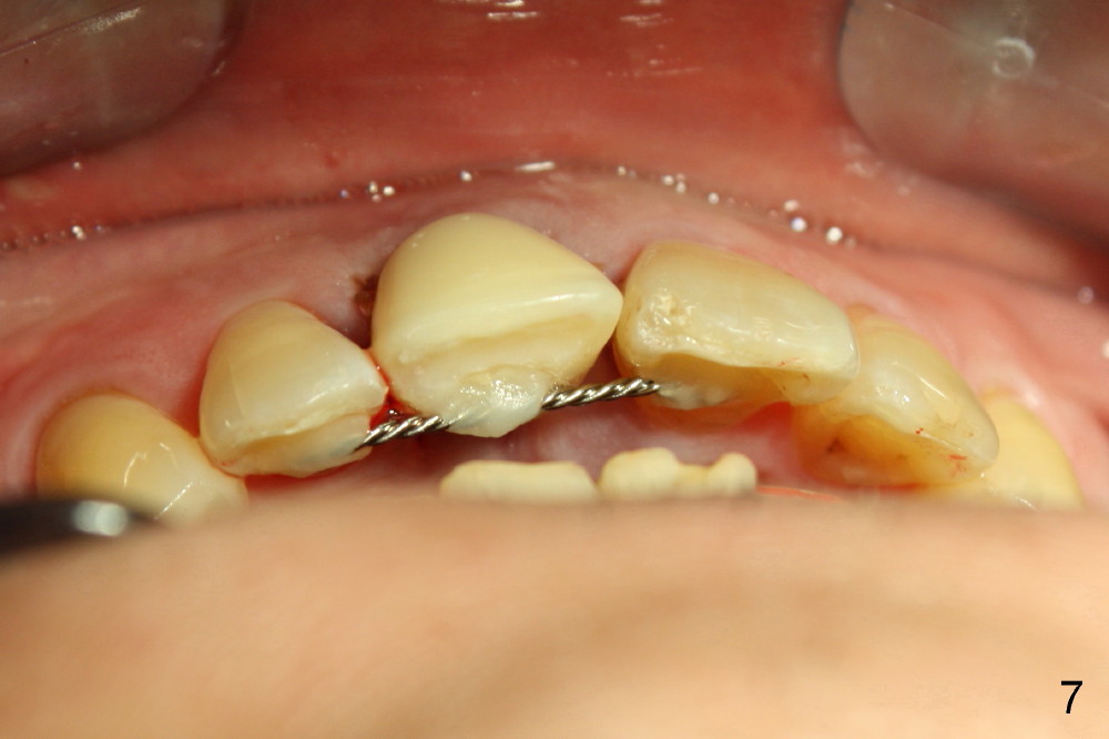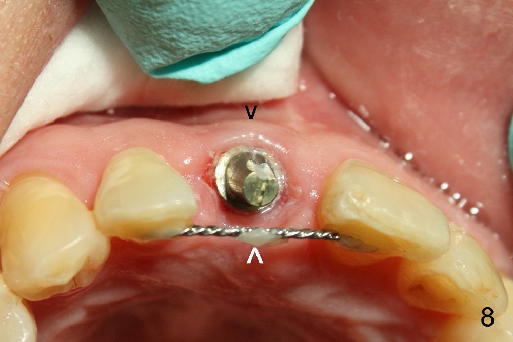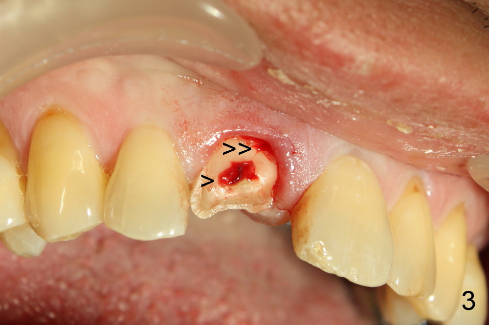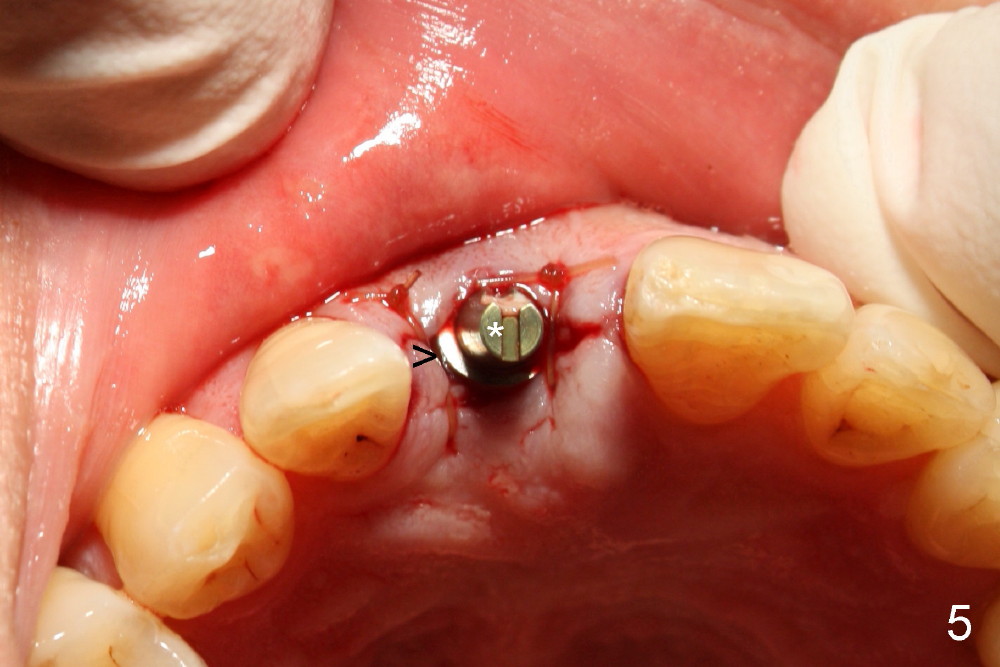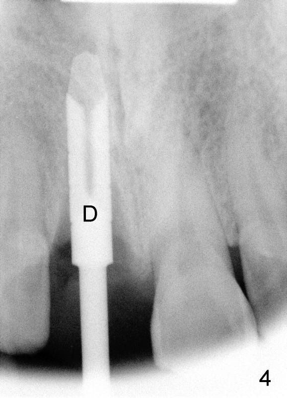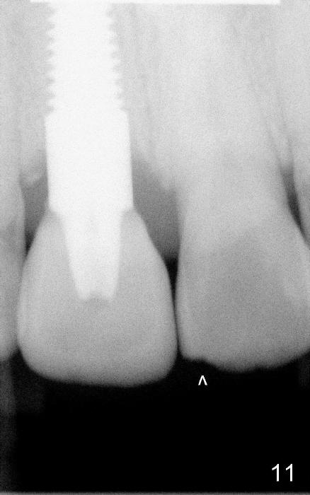 A 55-year-old man has severe pain on the upper right central incisor (Fig.1 *) after biting on a piece of bone. PA confirms crown fracture (Fig.2 <), extending subgingivally (Fig.3 >>). Osteotomy forms using a 2 mm pilot drill and 2.5-3.5 mm reamers (Fig.4). A 5x17 mm Tatum tapered implant is placed, autogenous bone placed in the buccal gap, sutures placed for wound approximation and 3.5 mm 20º angled abutment installed (Fig.5). An immediate provsional is fabricated (Fig.6), cemented and splinted (Fig.7).,