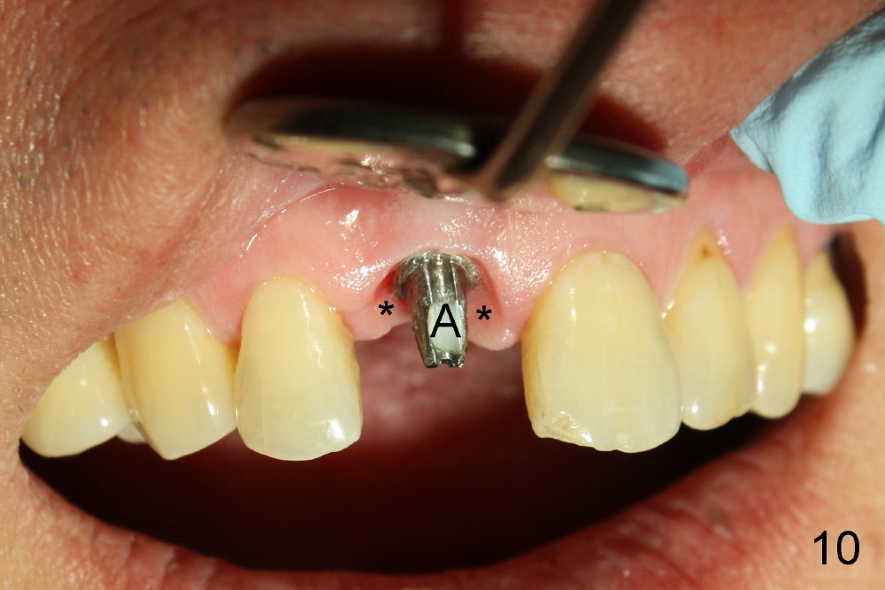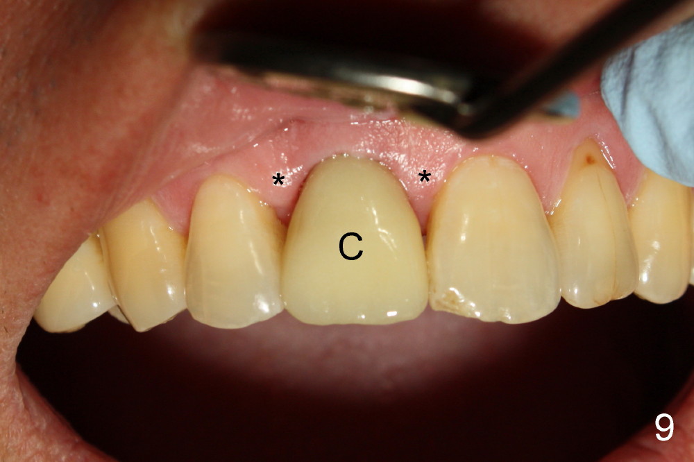 The provisional is dislodged 3.5 months postop; there is no labial atrophy (Fig.8 black arrowhead). The permanent crown (Fig.9 C) is harmonious with the papillae (*). When the try in crown is removed, the gingival tissue looks healthy (Fig.10 *).