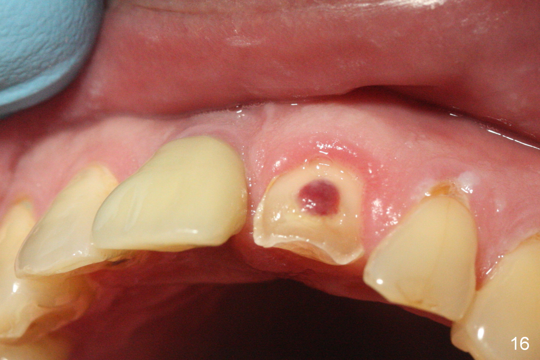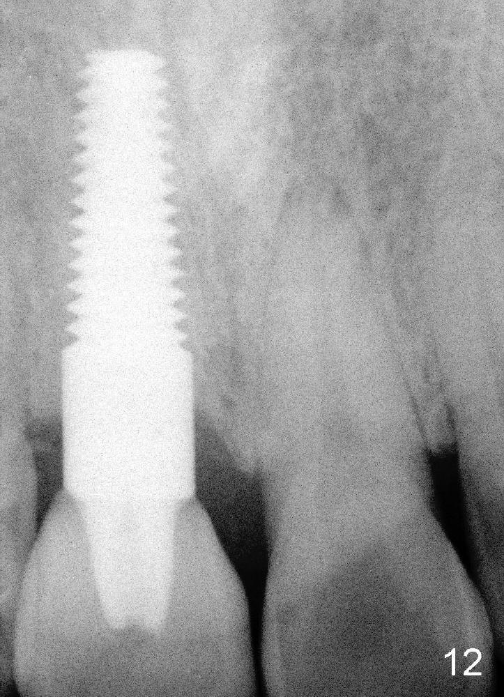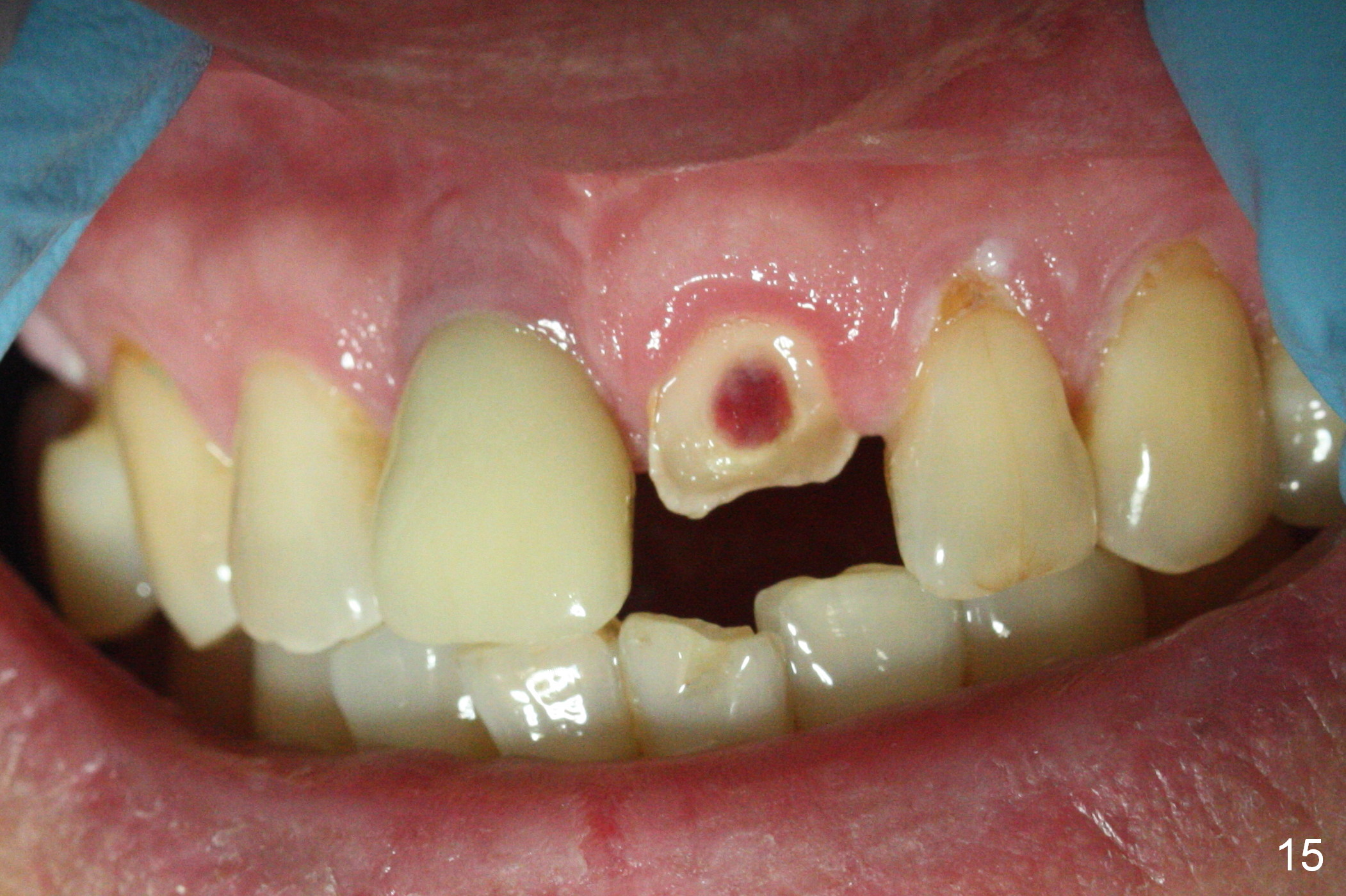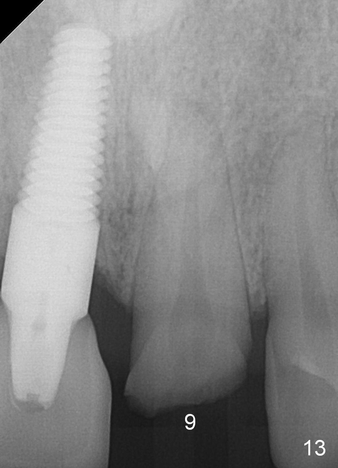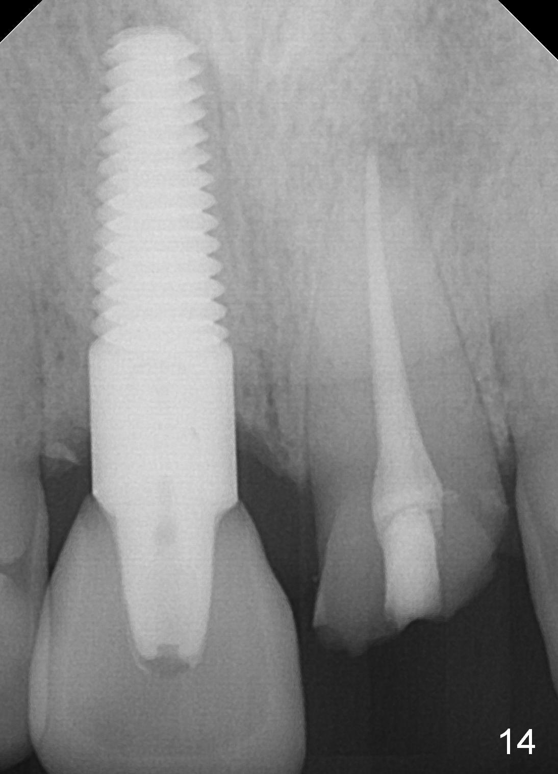 When the patient returns 3 years 10 months post cementation, the tooth #9 fractures (Fig.13,15,16), and receives root canal therapy (Fig.14). The dark gingiva could be avoided if the implant is placed more palatally and smaller in diameter (Fig.15,16).